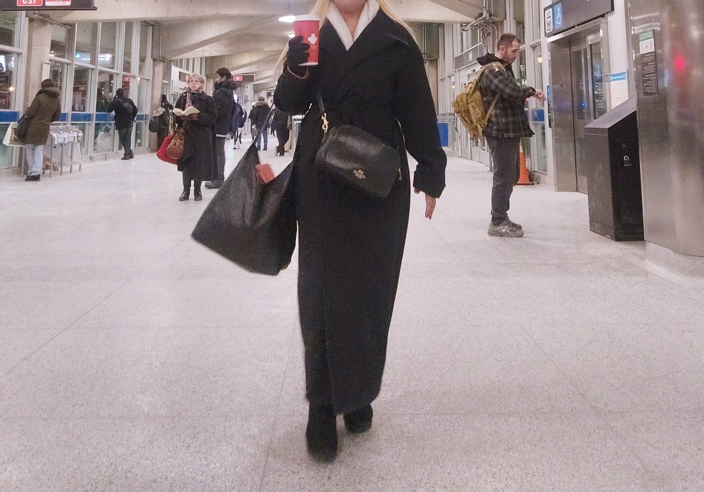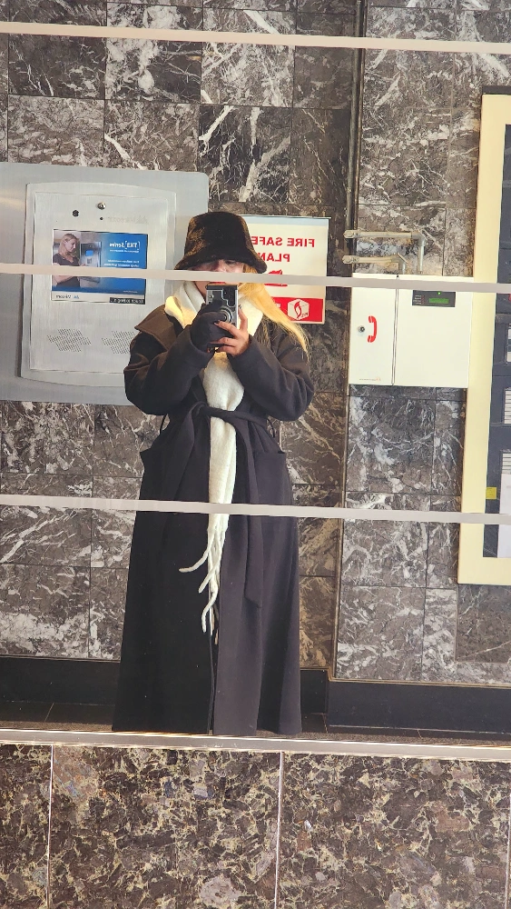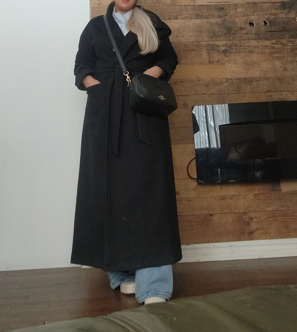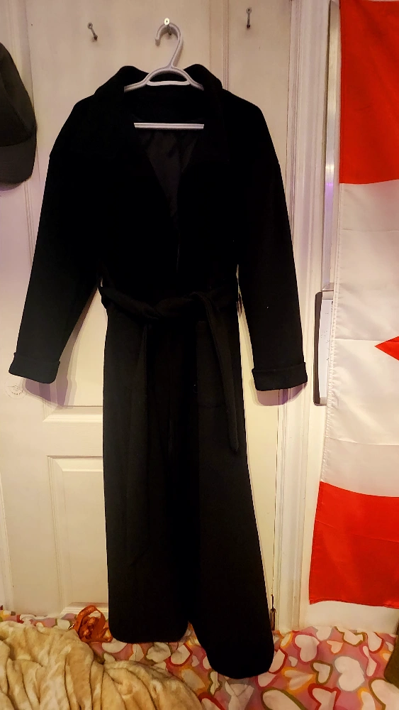 Elegant long black wool coat. Features a self-tie belt, long sleeves, and a relaxed fit. Ideal for colder weather. Good condition.