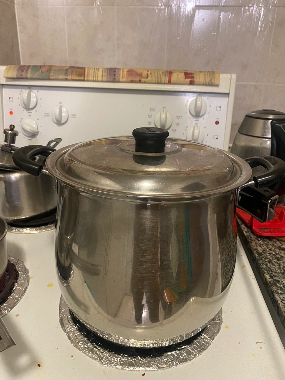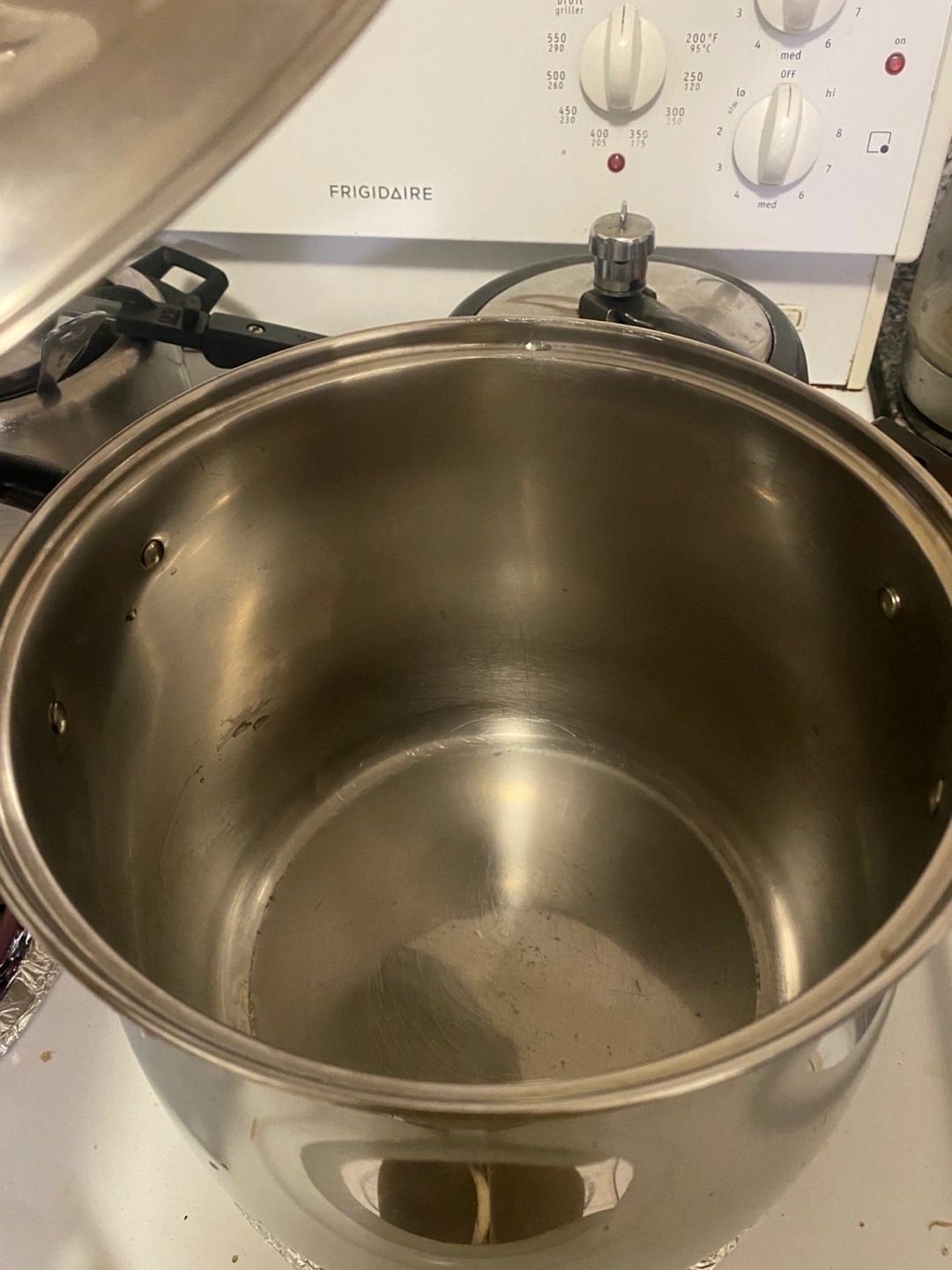 Large capacity stainless steel stock pot. Features a fitted lid and two handles. Good for soups, stews, and large batches of cooking.