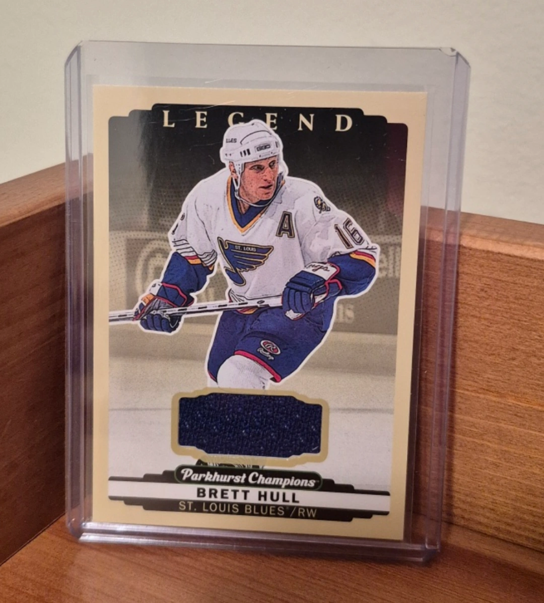 Brett Hull St. Louis Blues hockey card. Features jersey swatch. In protective case. 2022-23 Parkhurst Champions.