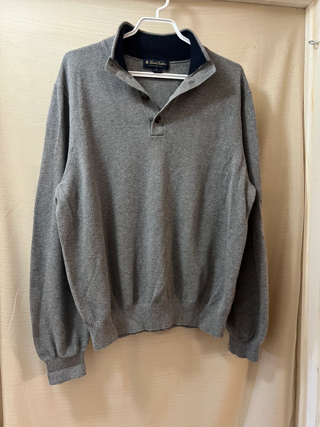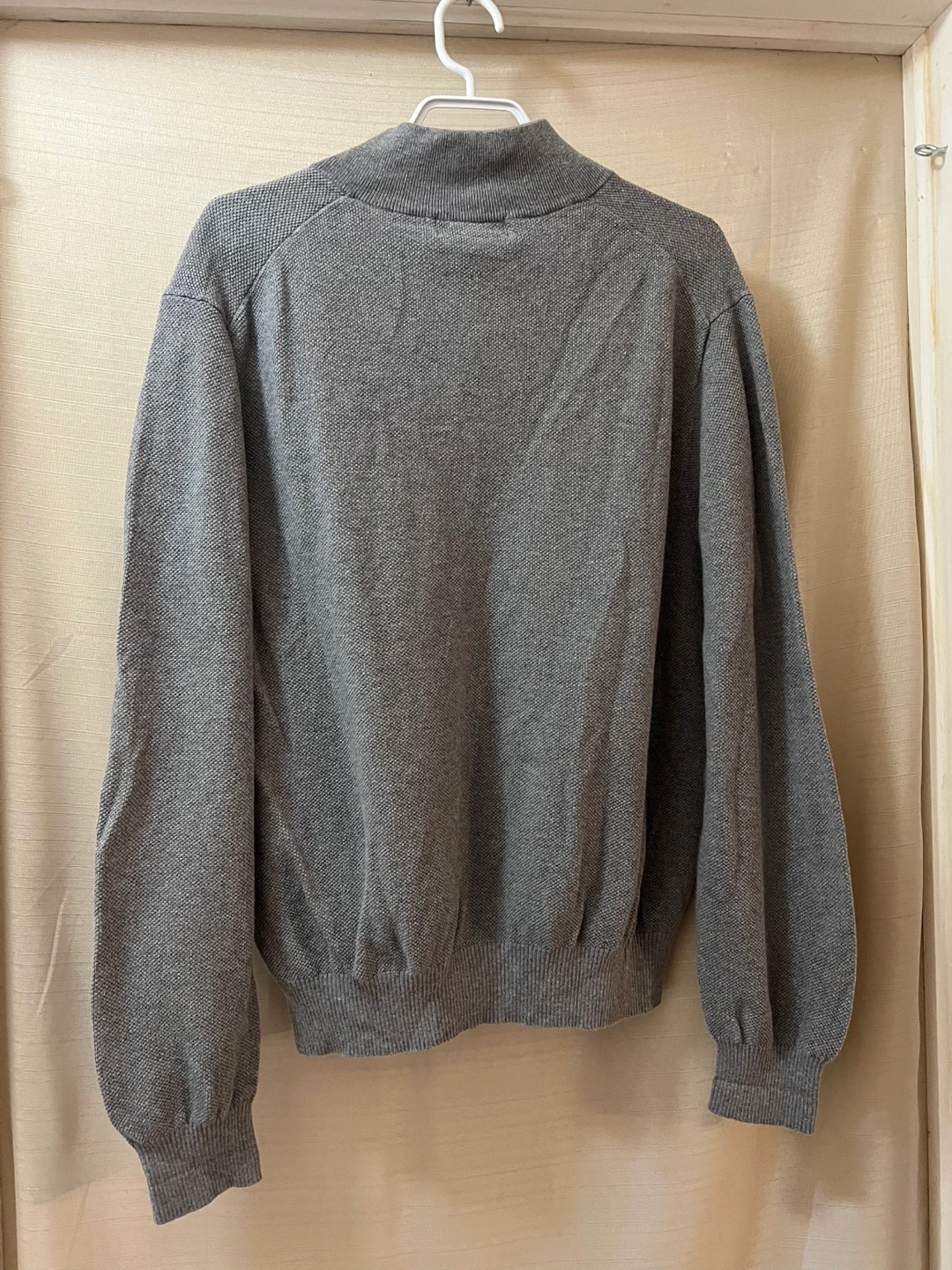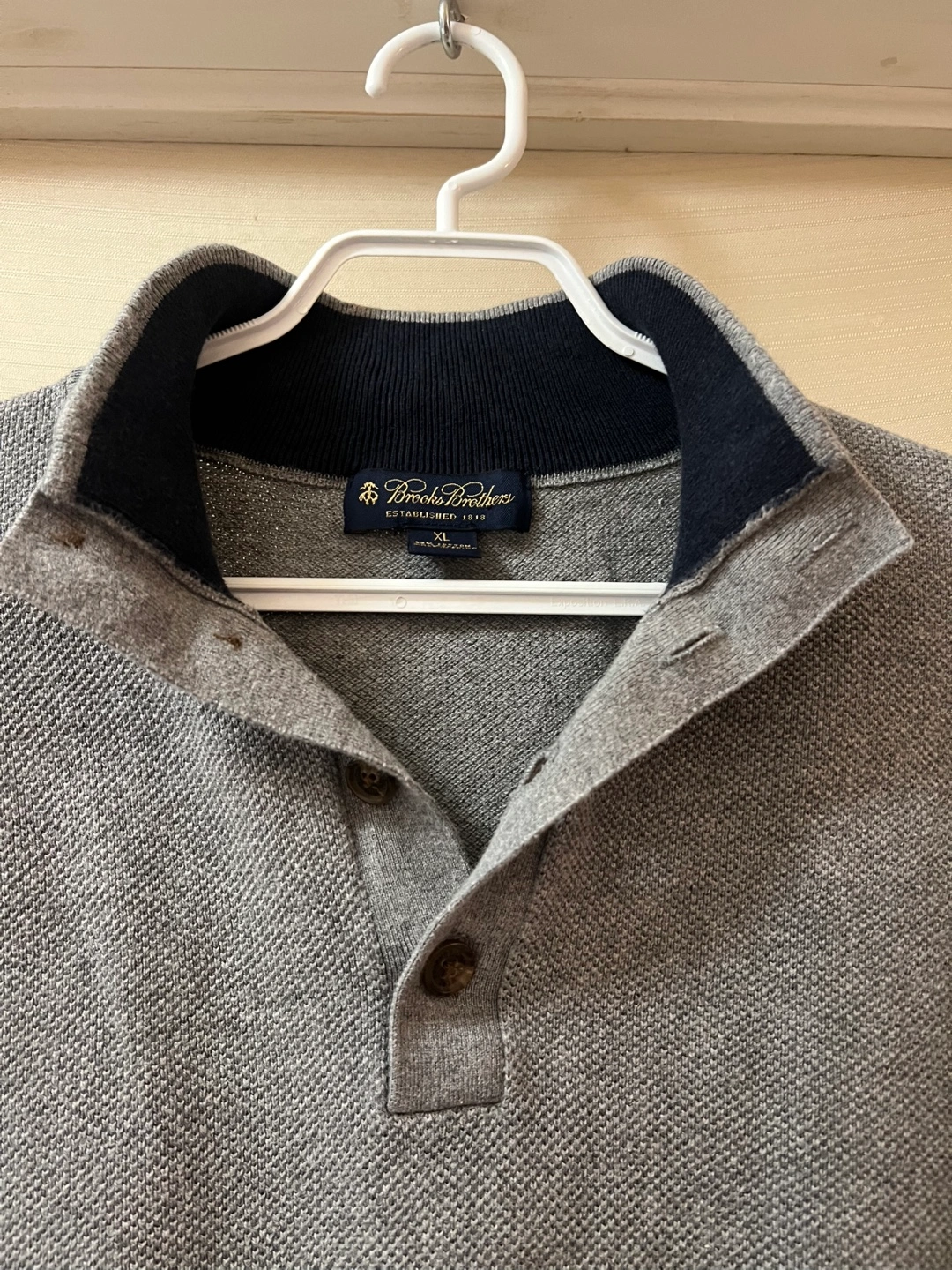 Men's grey long-sleeve sweater. Size XL. Features a mock neck and button placket. Made of a soft knit material including 8% cashmere. Excellent condition. Ptp- 23 Length- 25.5 Arm- 27