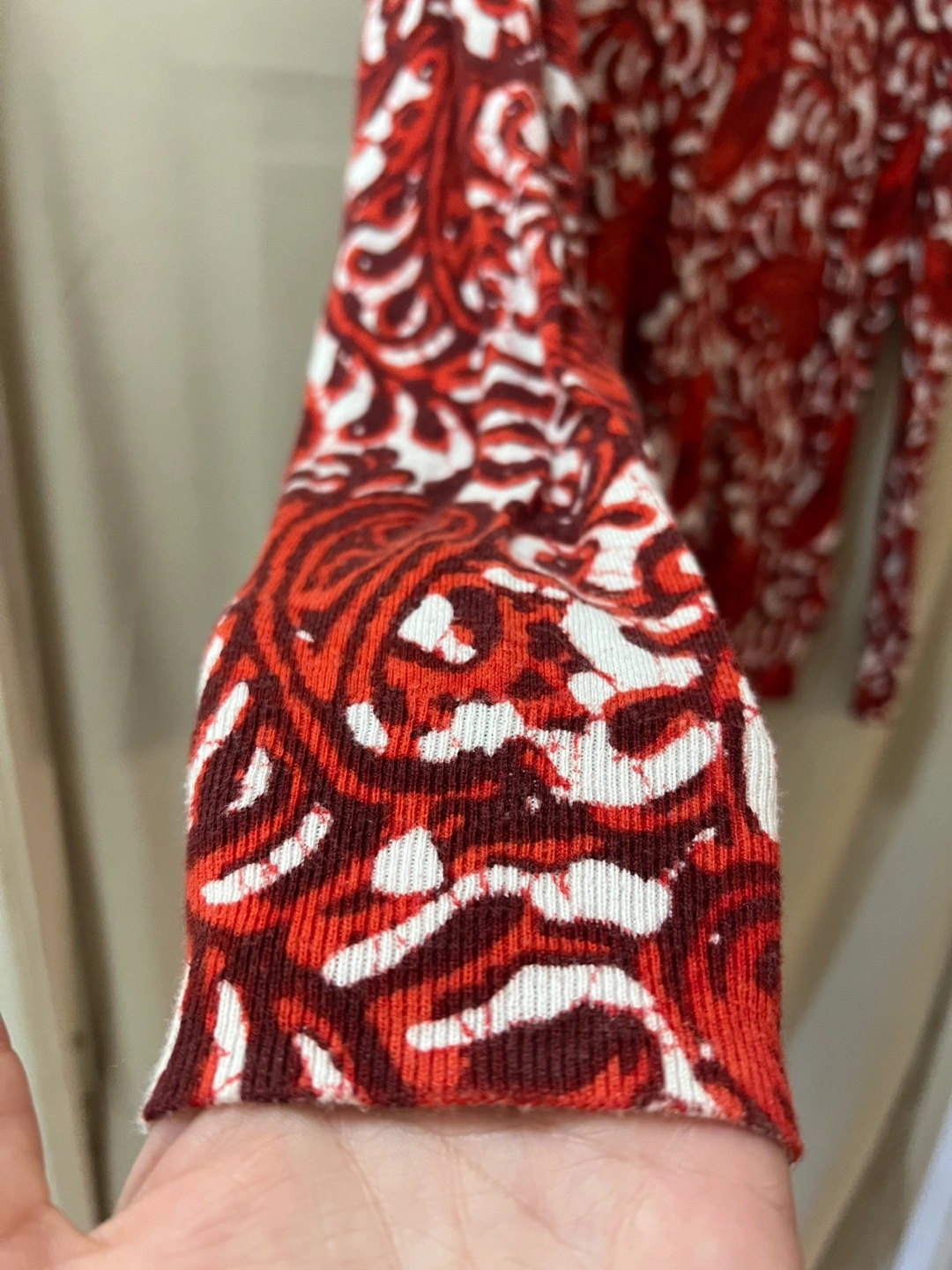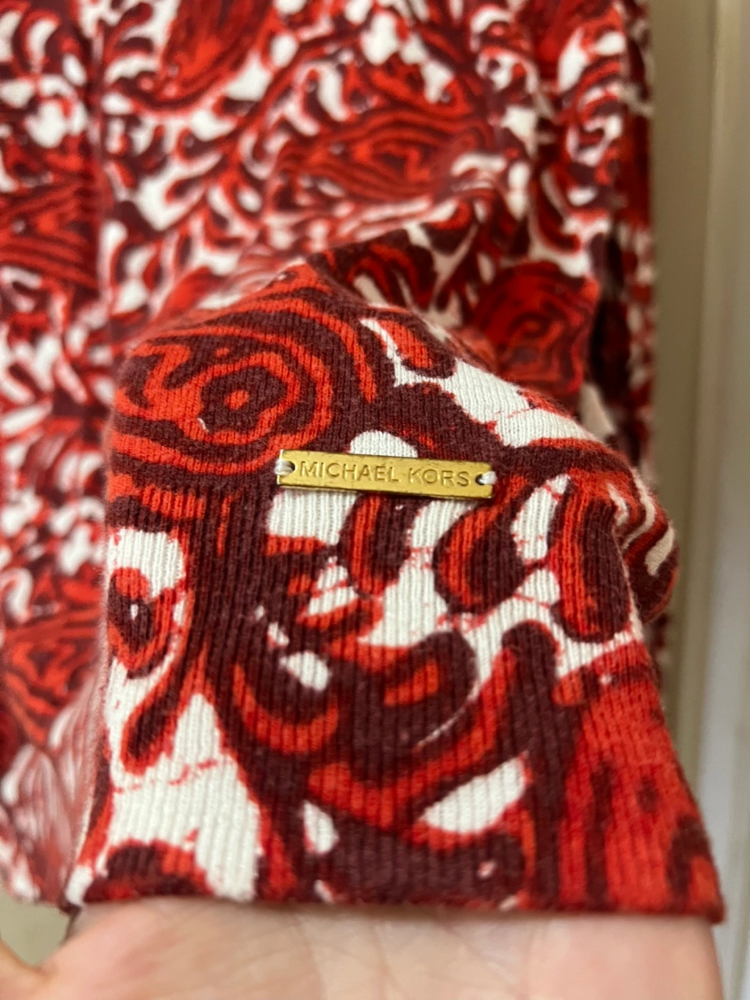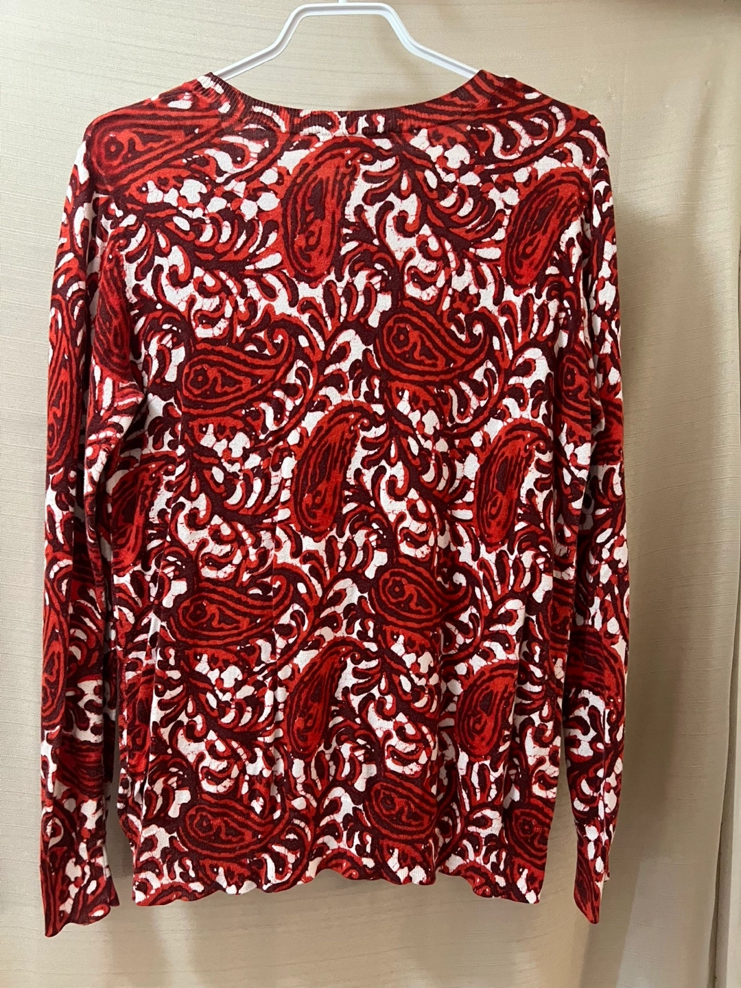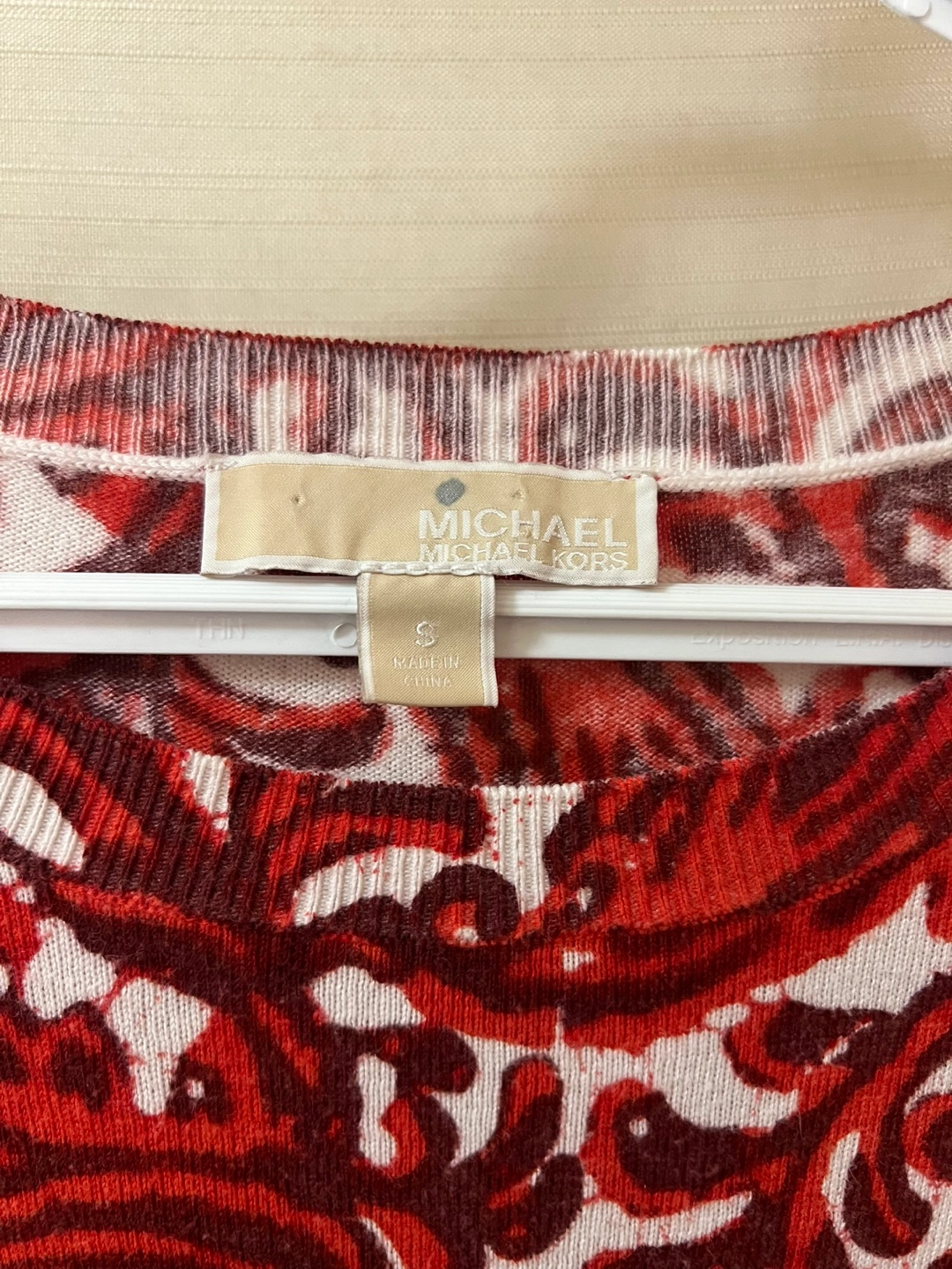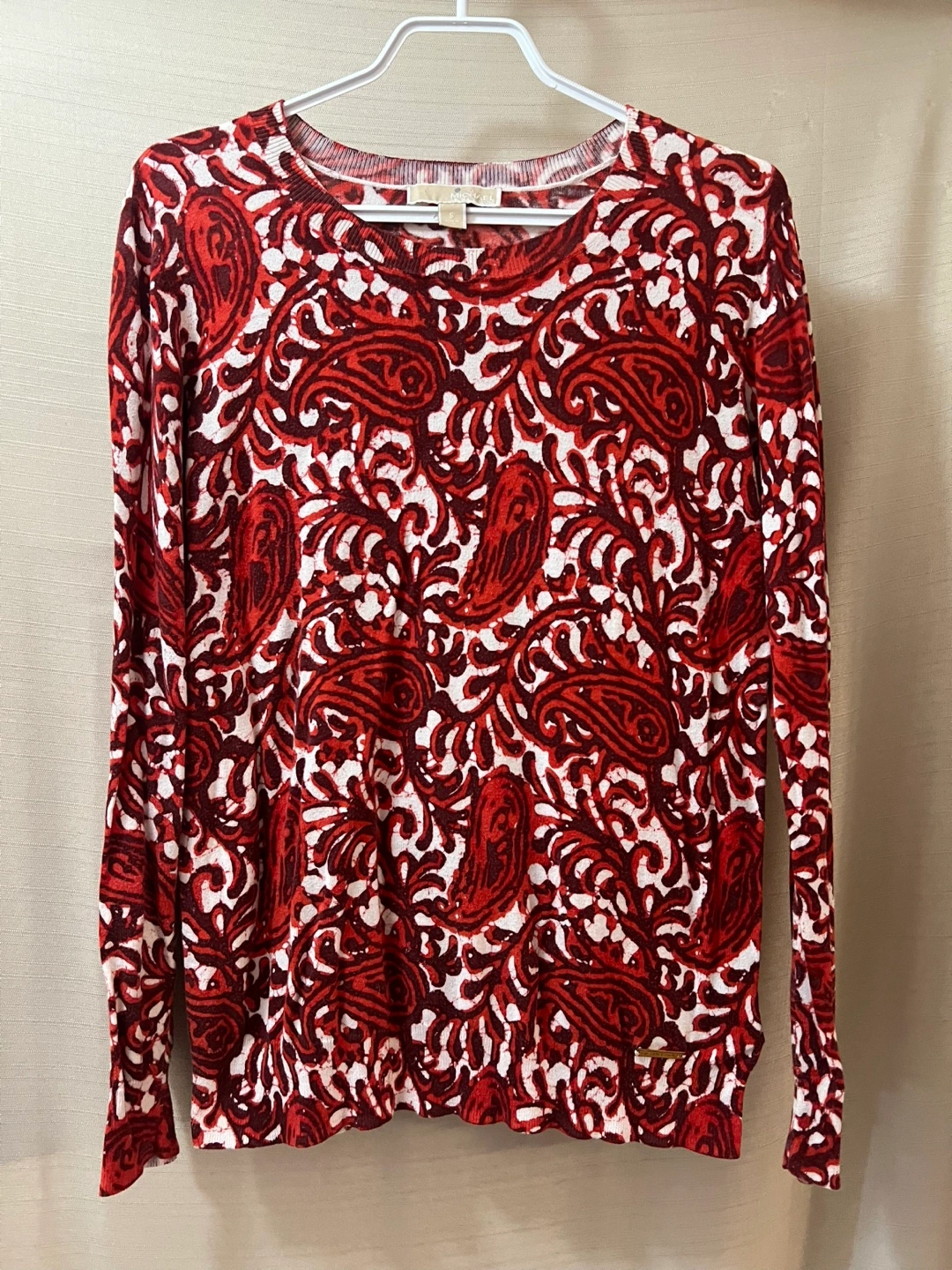 Women's long-sleeved Michael Kors sweater. Beautiful red and white paisley print. Size small. Ptp- 19 Length- 24 Arm- 24