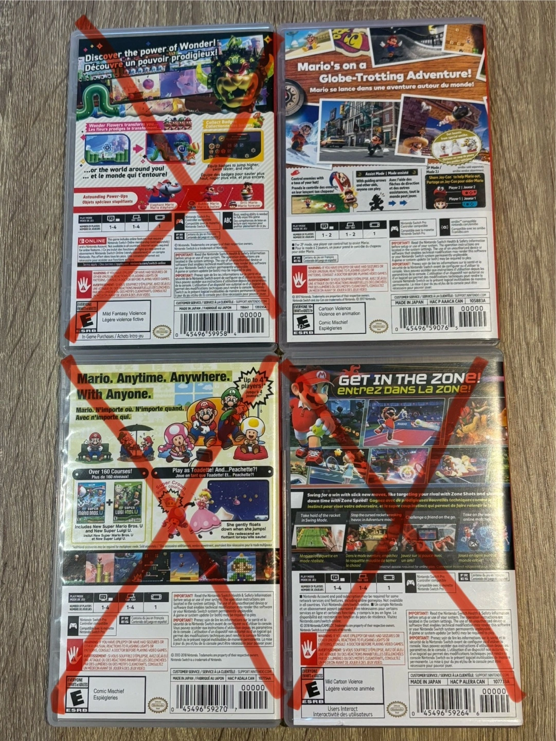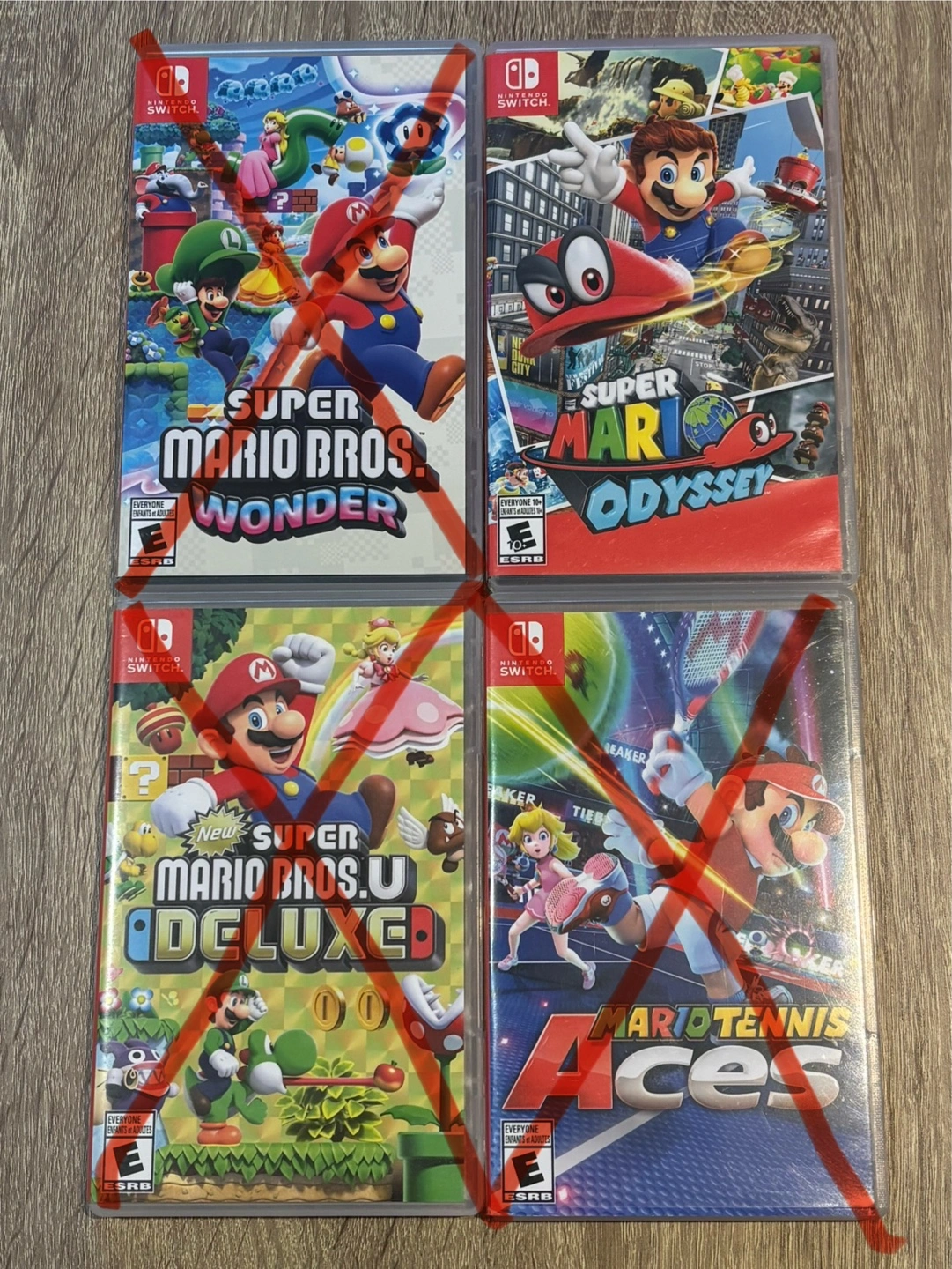 Four Nintendo Switch games: Super Mario Odyssey, Super Mario Bros. Wonder, New Super Mario Bros. U Deluxe, and Mario Tennis Aces. Pre-owned, cases included. Phenomenal condition. **Prices:** Super Mario Wonder - sold Super Mario Odyssey-$60 New Super Mario Bros. U Deluxe - sold Mario Tennis Aces - sold - can send additional pictures upon request - located at dufferin and Lawrence