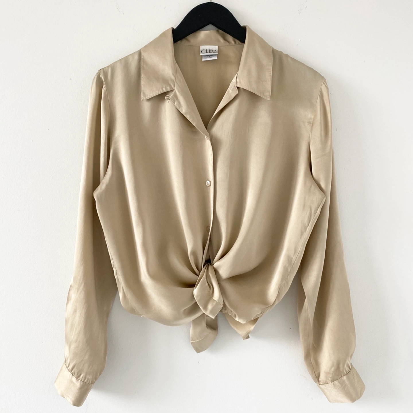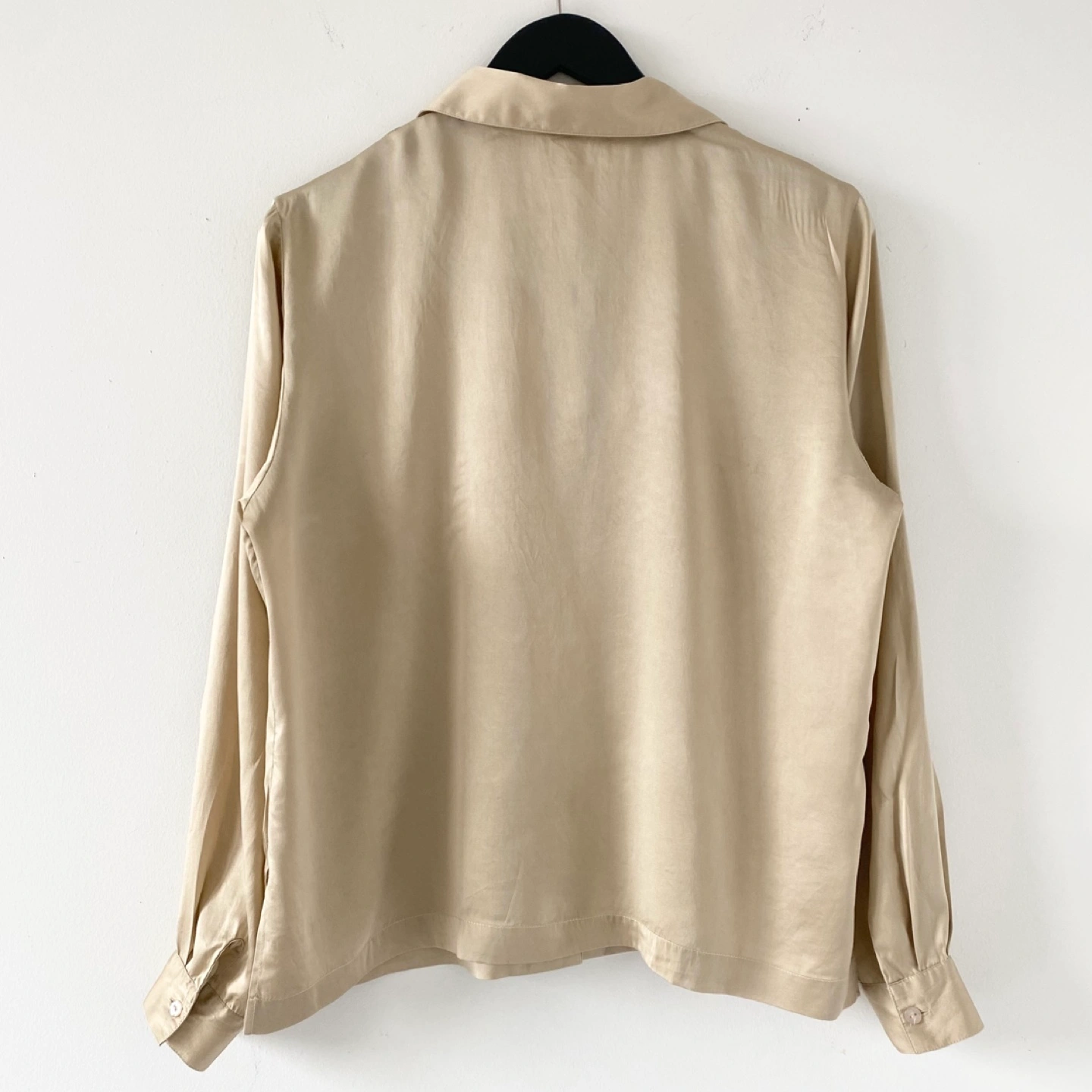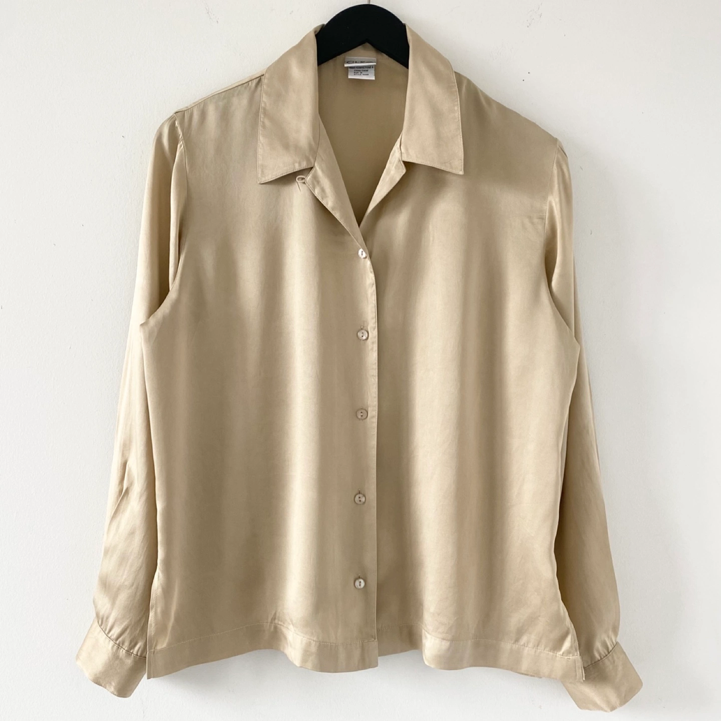 Pick up only in Leslieville (Queen and Pape) Check out other listings! Y2K classic button-up blouse with side slits. Made of lightweight 100% silk in a golden tan colour with some sheen. It feels very soft, luxe and drapes beautifully. There's some general wear but no staining or damage. It's clean and in excellent condition. Size 12 (runs small) Approximate measurements laid flat Shoulder 17” Pit to pit 21” Shoulder to cuff 23” Center back length 23”