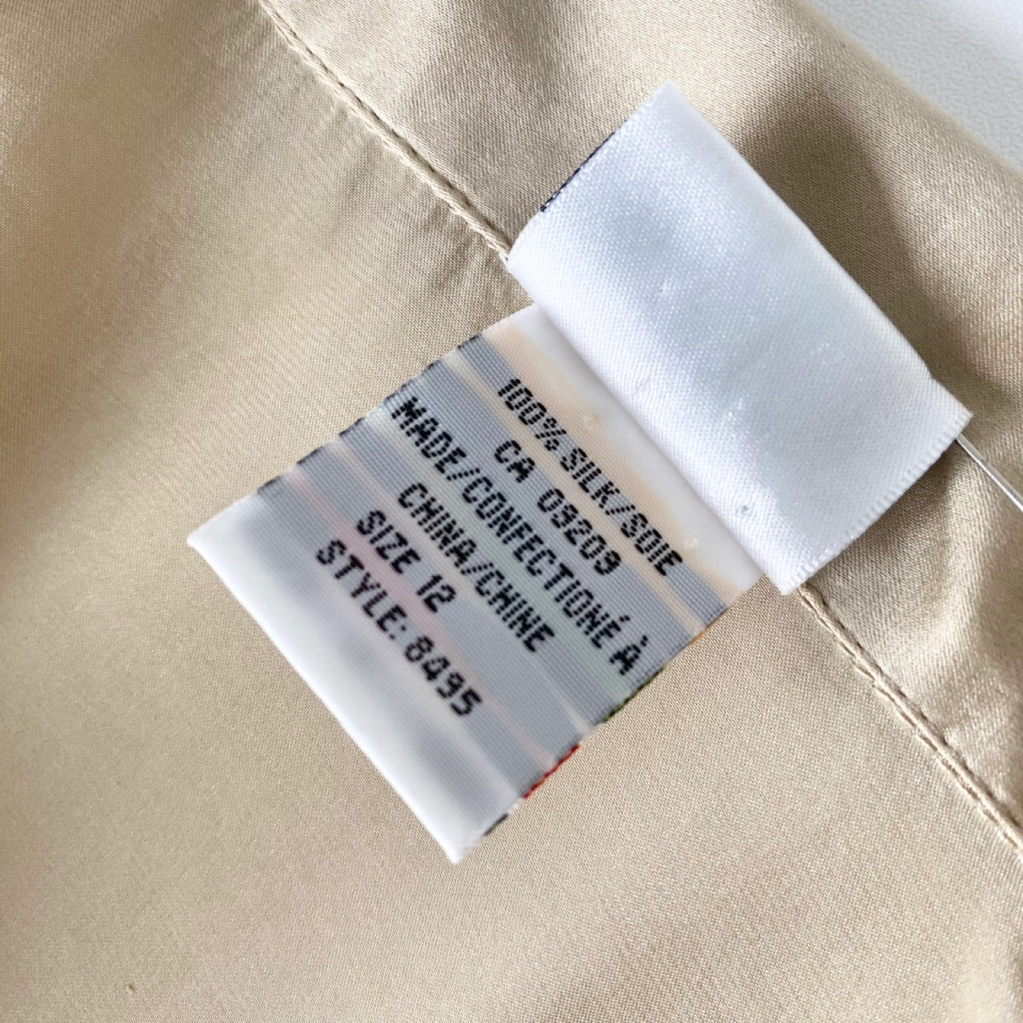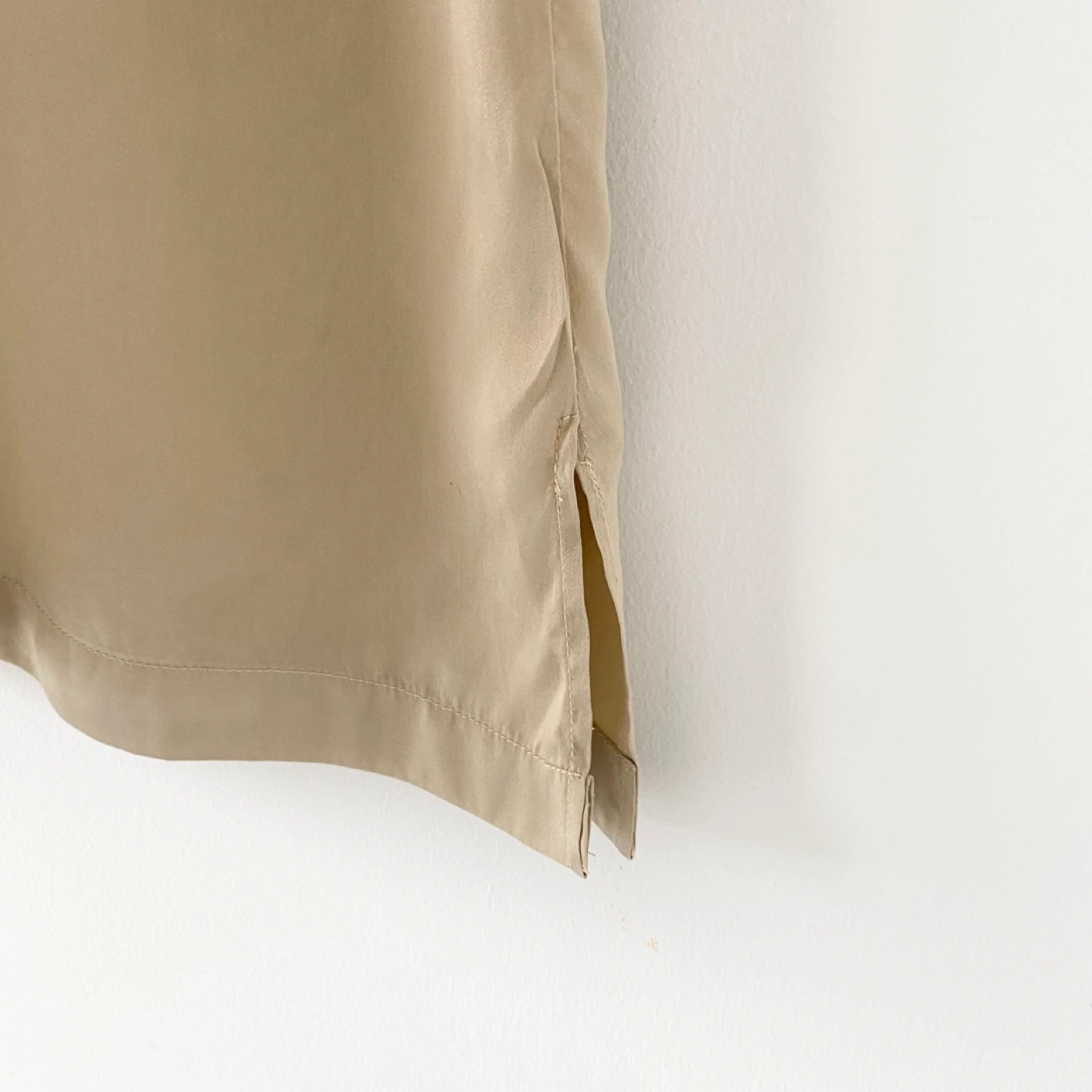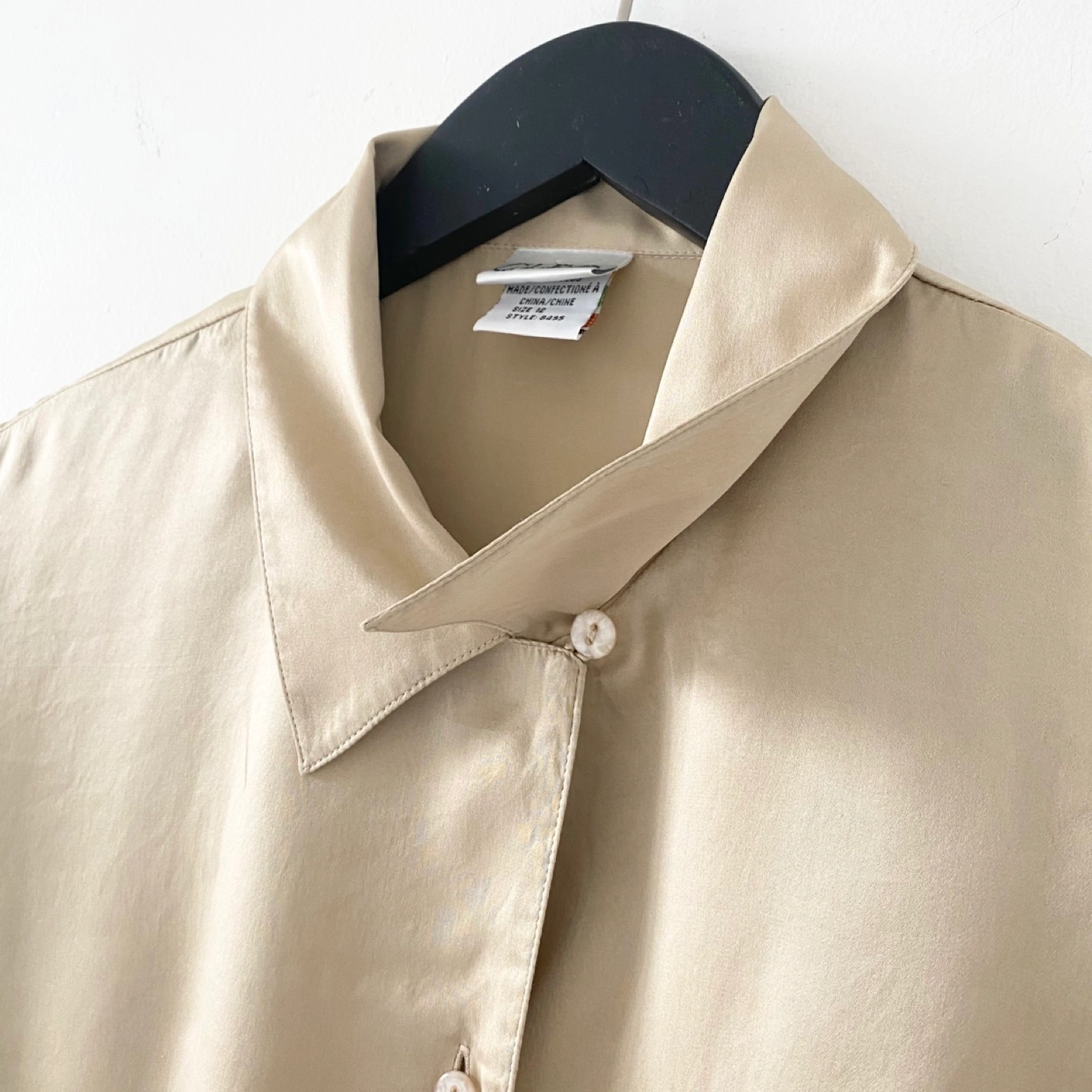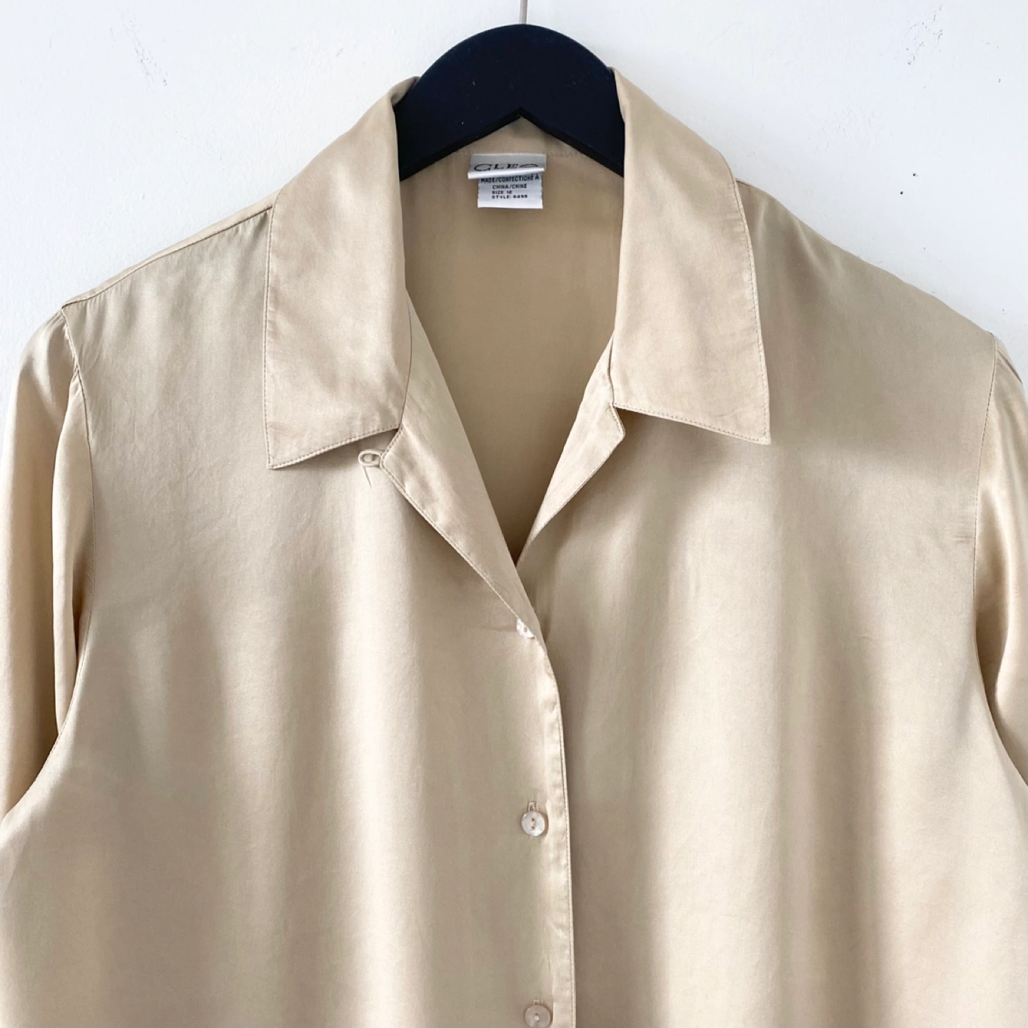 Pick up only in Leslieville (Queen and Pape) Check out other listings! Y2K classic button-up blouse with side slits. Made of lightweight 100% silk in a golden tan colour with some sheen. It feels very soft, luxe and drapes beautifully. There's some general wear but no staining or damage. It's clean and in excellent condition. Size 12 (runs small) Approximate measurements laid flat Shoulder 17” Pit to pit 21” Shoulder to cuff 23” Center back length 23”