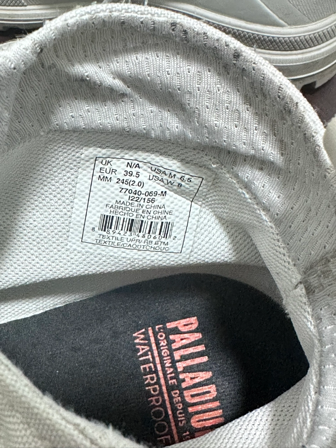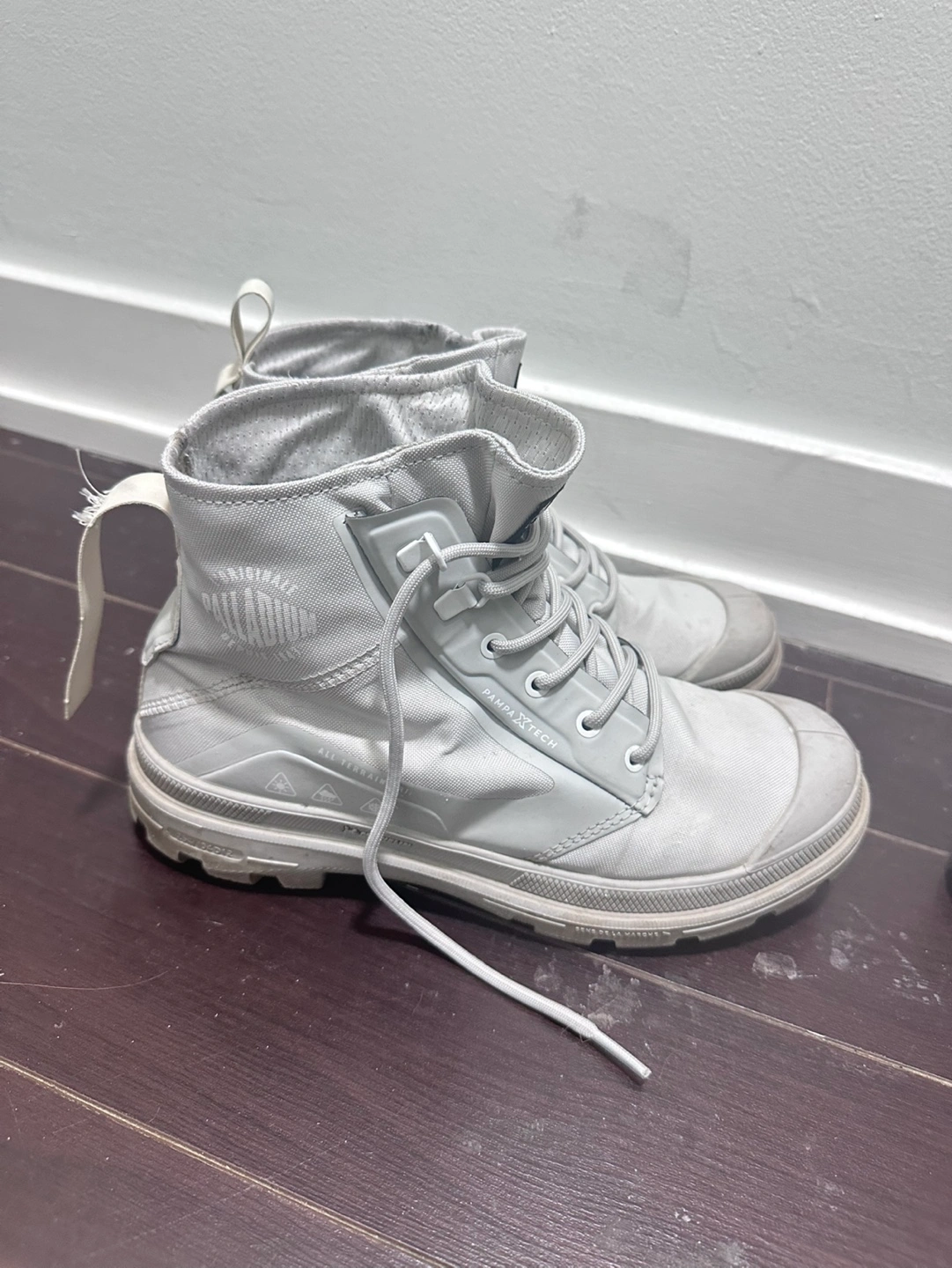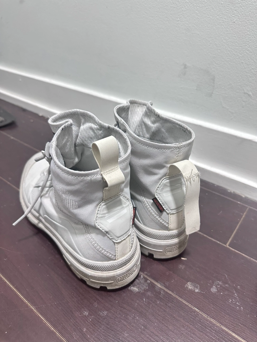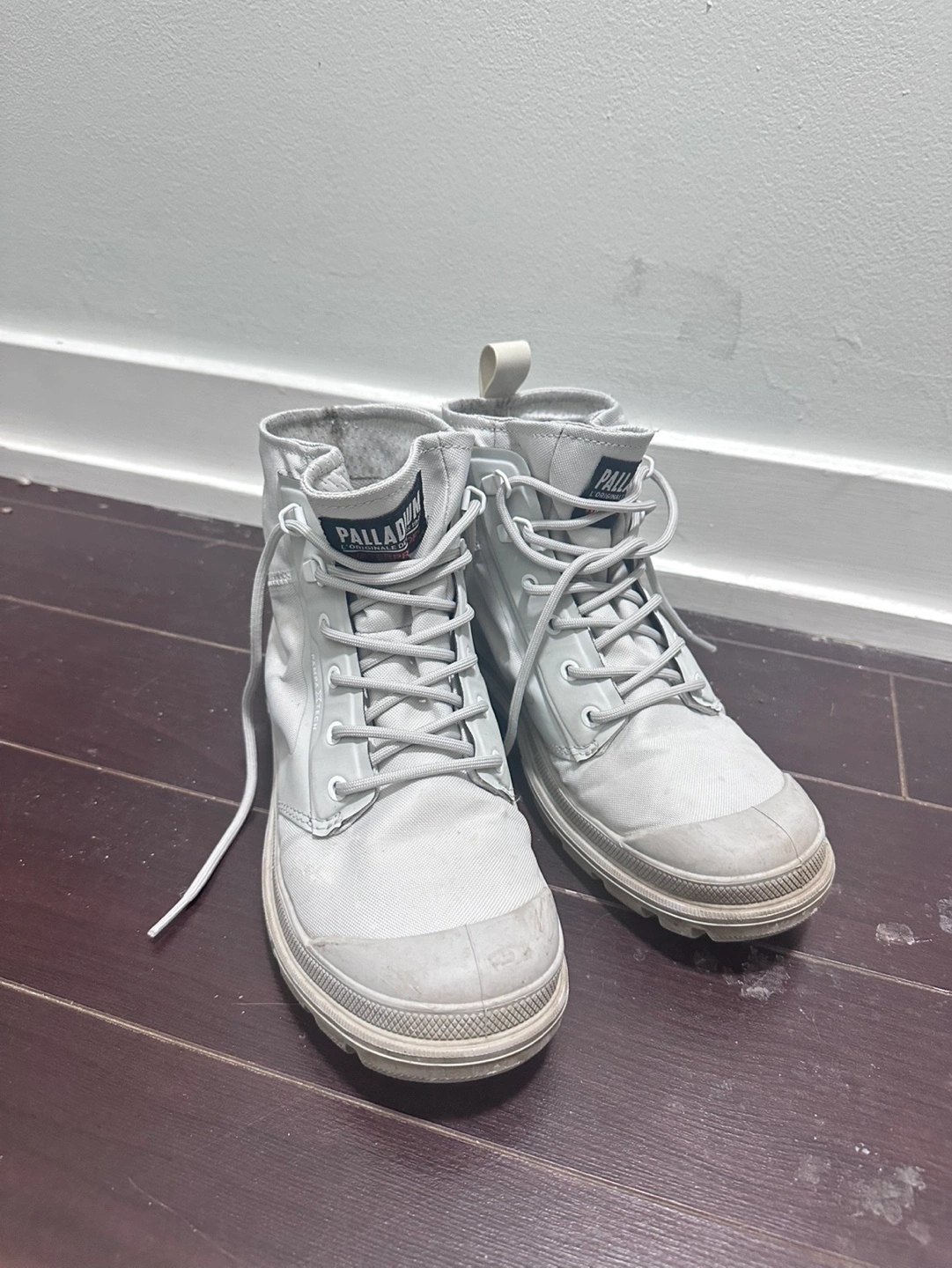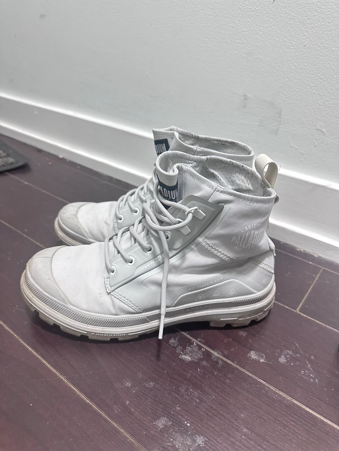 White Palladium Pampa waterproof boots The curved piece of little plastic on the right shoes is damaged, but it does not affect its wearability