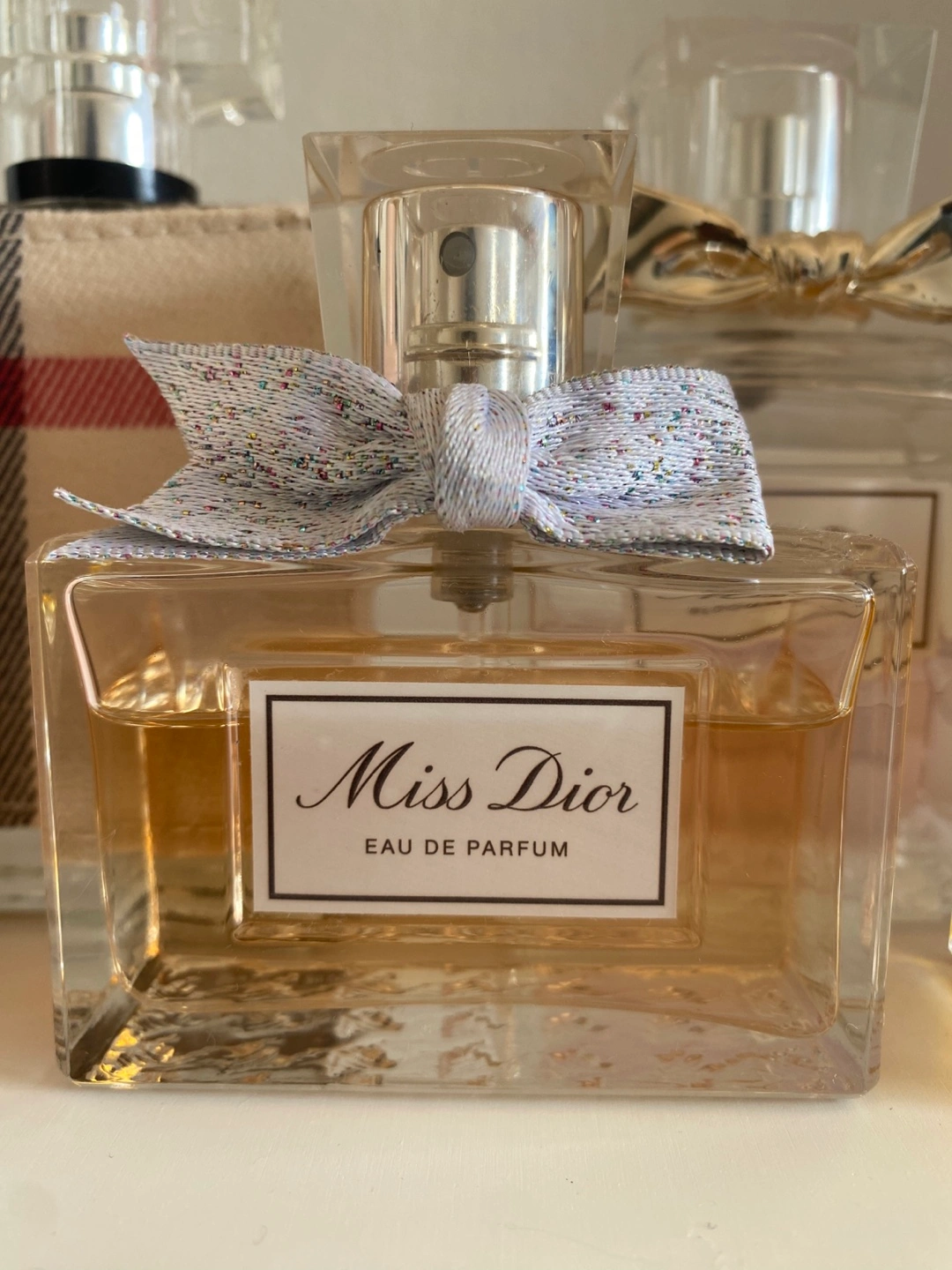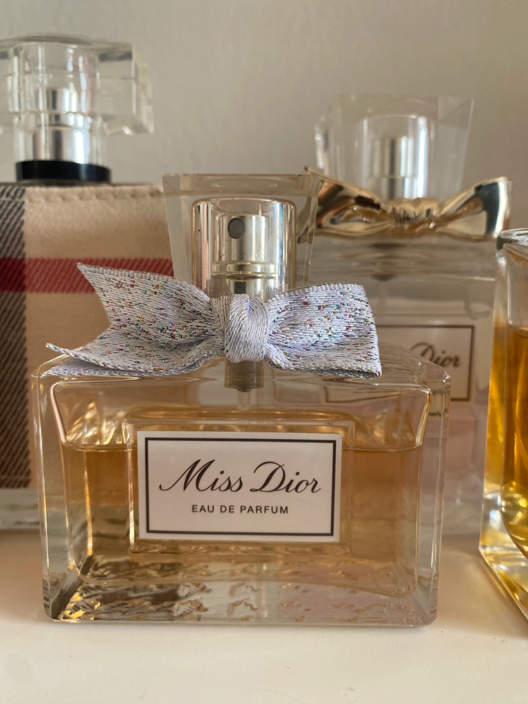 Eau De Parfum in a square glass bottle. Adorned with a sparkly bow. Almost full. 80% full. Top notes are Iris, Peony and Lily-of-the-Valley; middle notes are Apricot, Rose and Peach; base notes are Vanilla, Musk, Tonka Bean, Benzoin and Sandalwood.