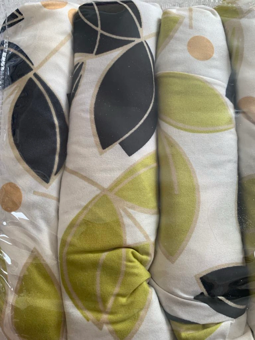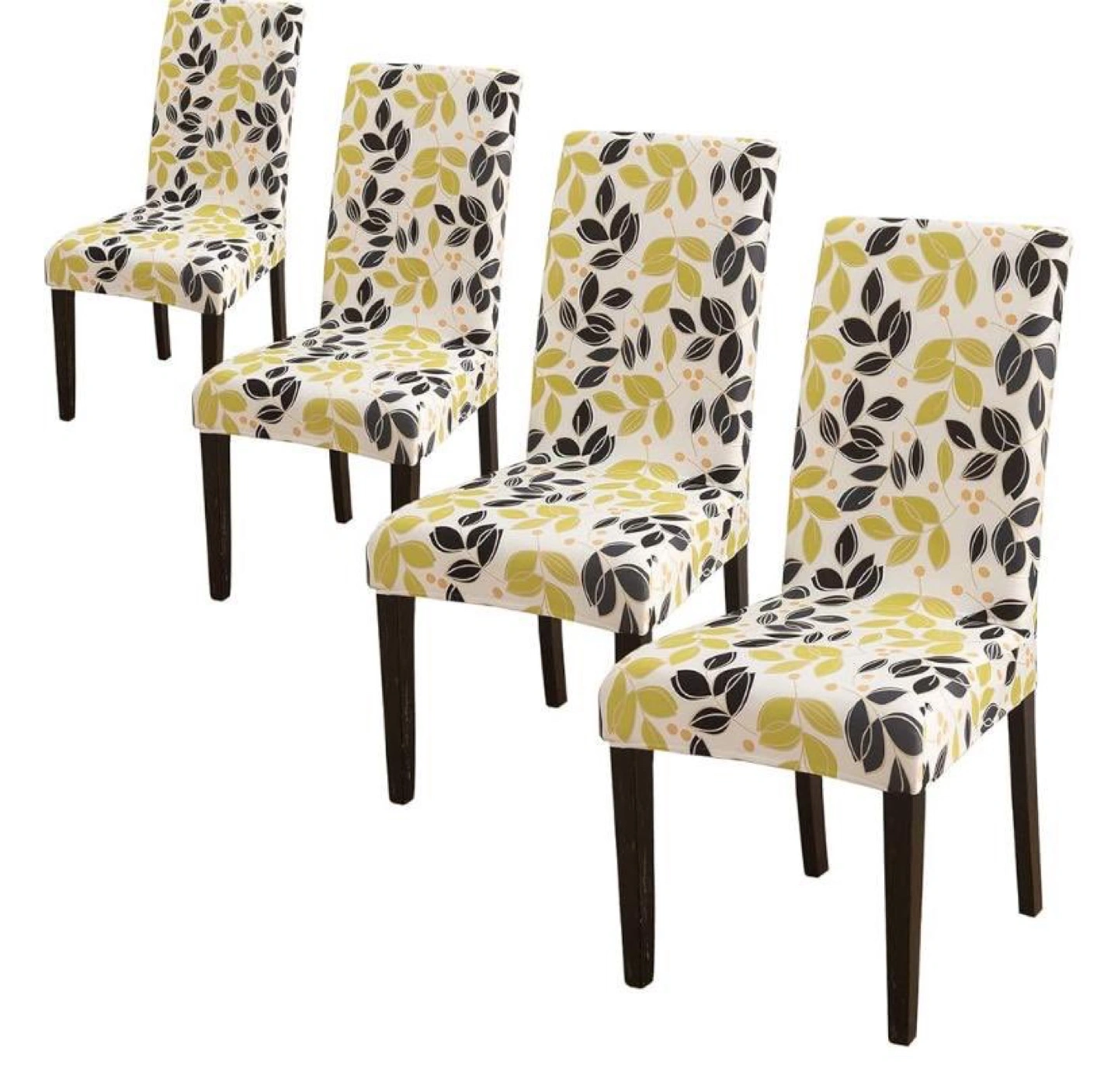Four chair covers. Leaf pattern in olive green, black, and beige. Stretchy fabric. Dark brown legs. New, never used. 12 pcs available /1 for $10 - 4 for $35