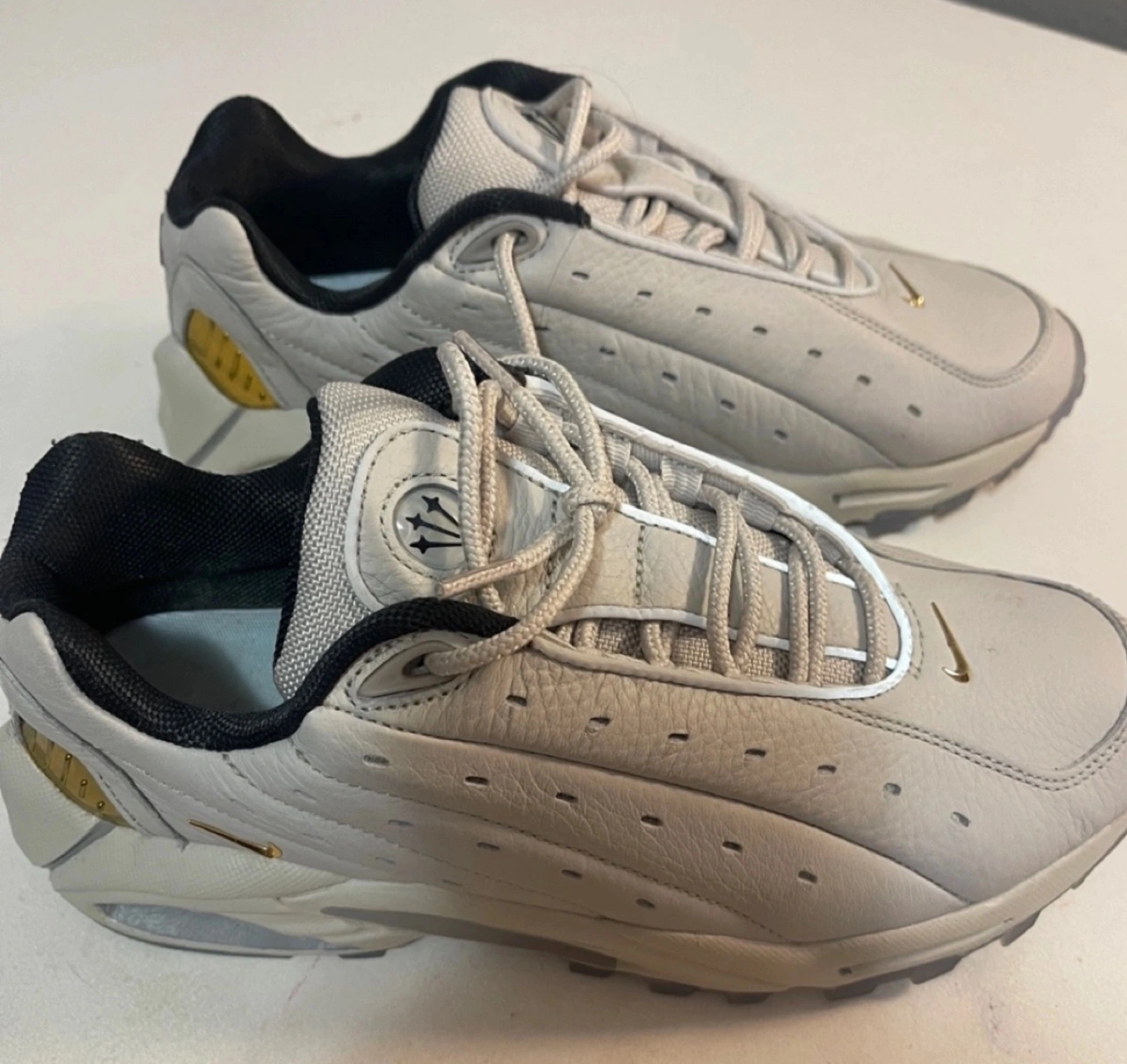 Pair of light beige Nike Air Max 97 Premium sneakers. Lace-up closure. Perforated leather upper. Gold accents. Minimal wear. Nocta
