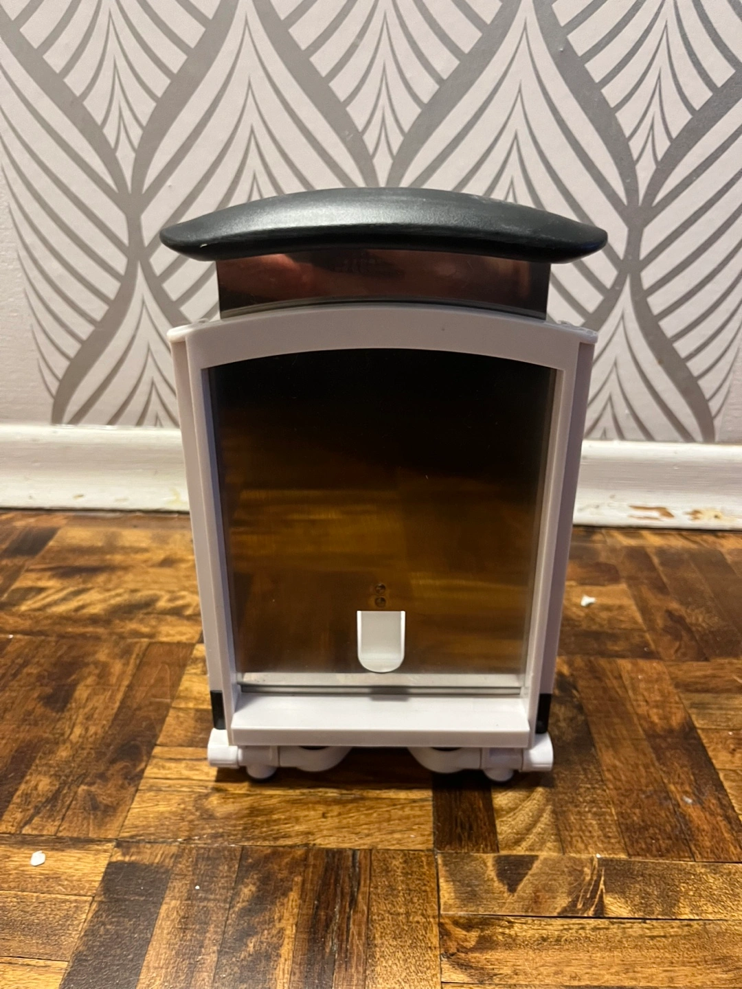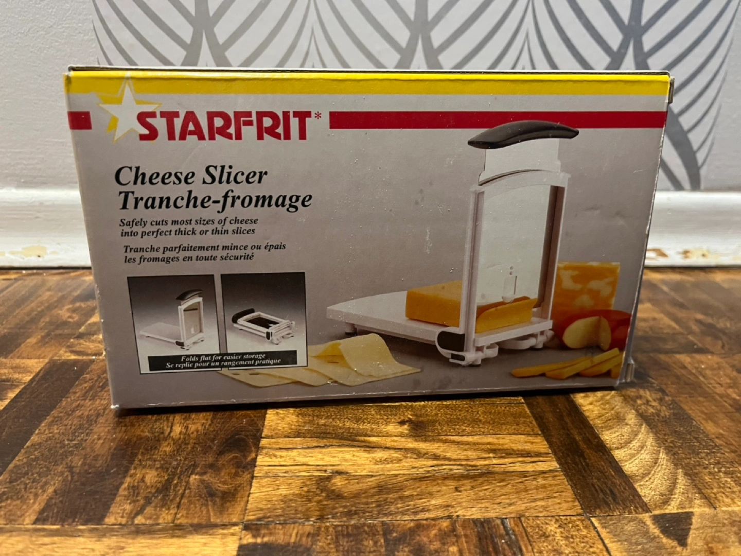 New in box. Compact cheese slicer. Cuts most cheeses into thin slices. Folds flat for storage. Stainless steel blade. Dishwasher safe.