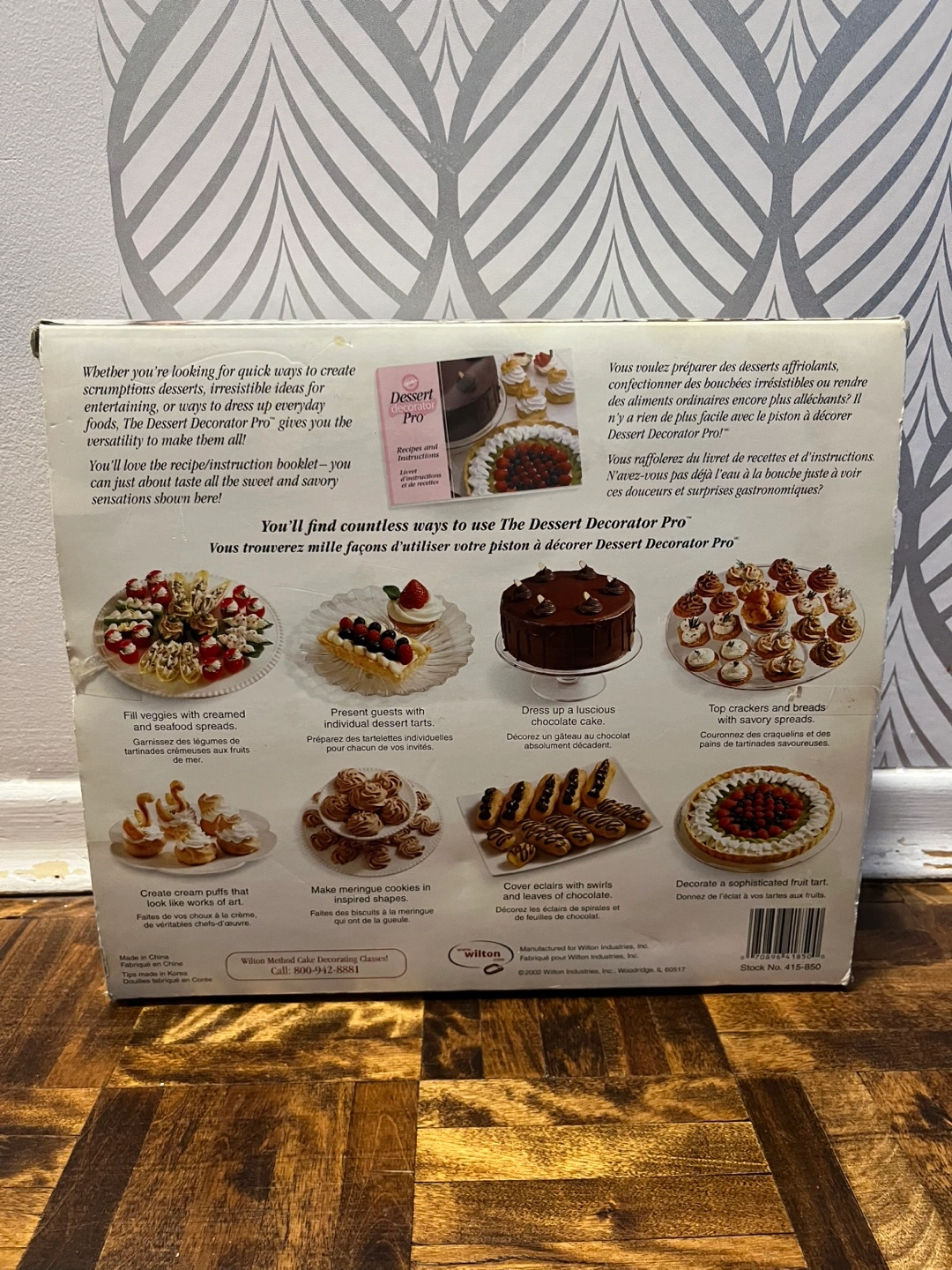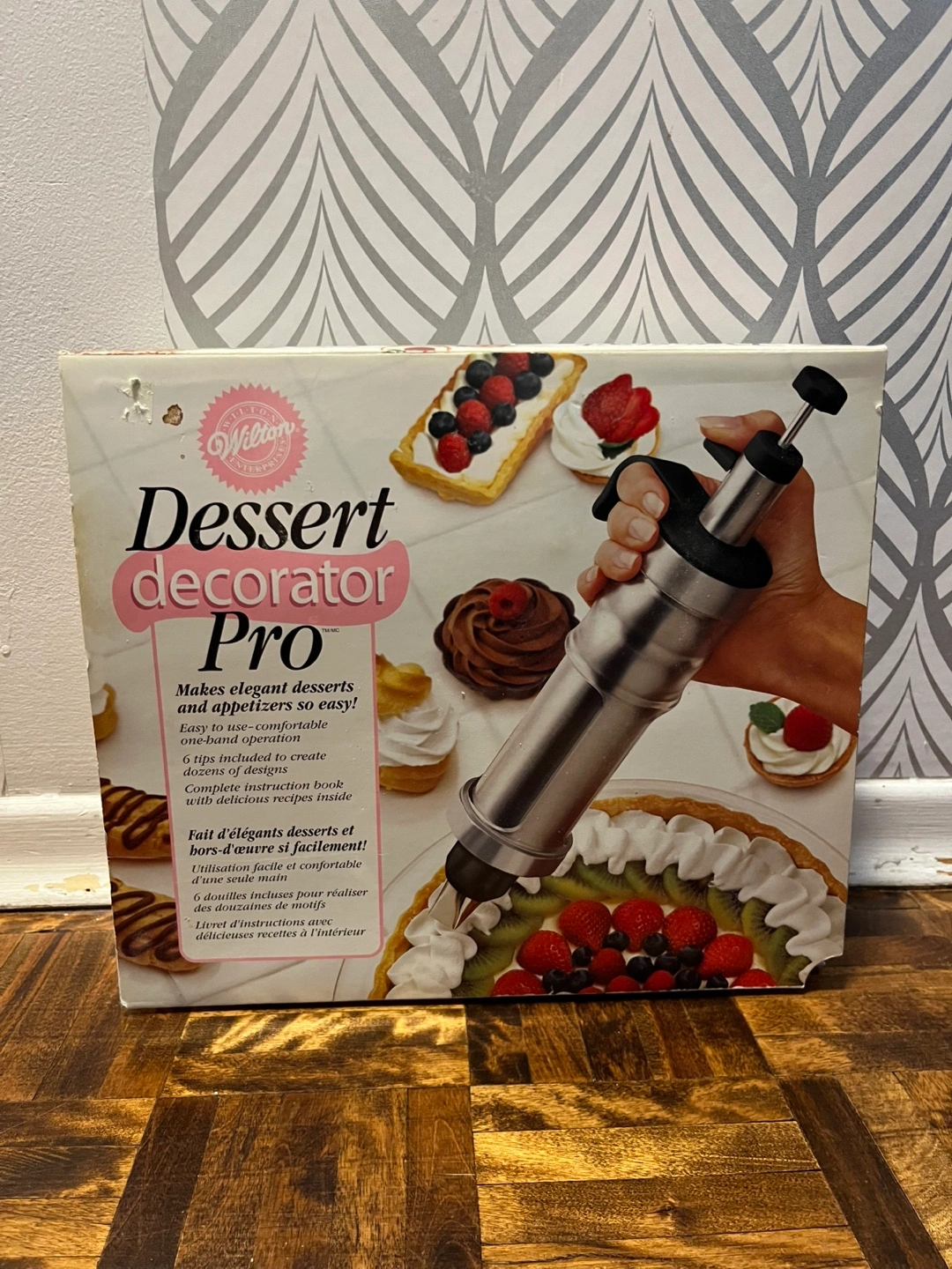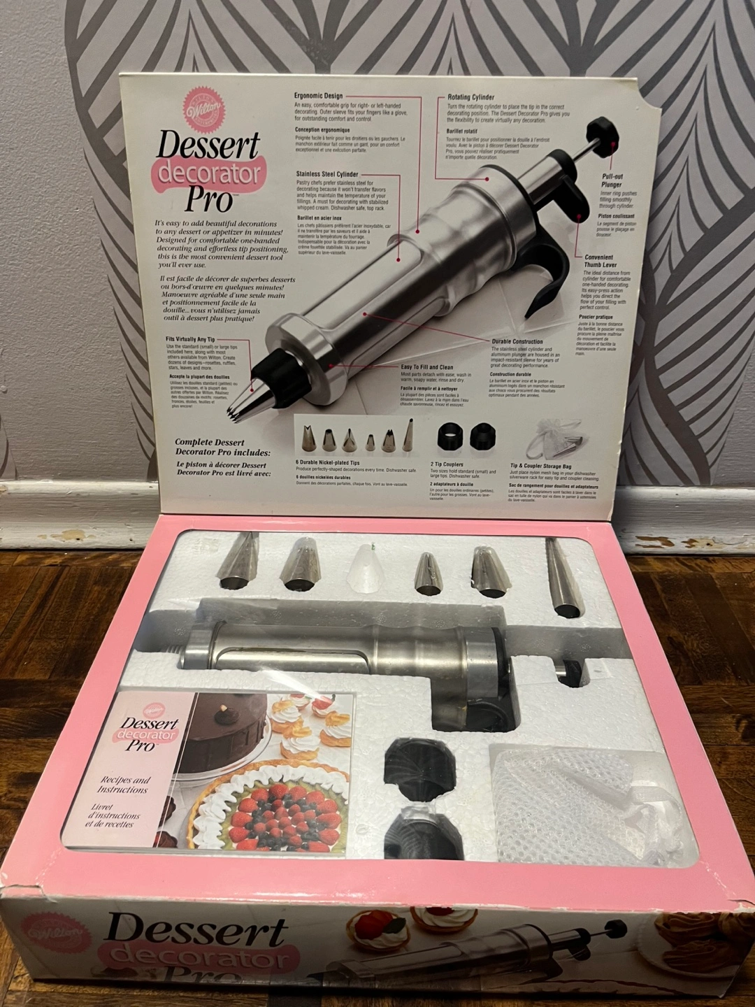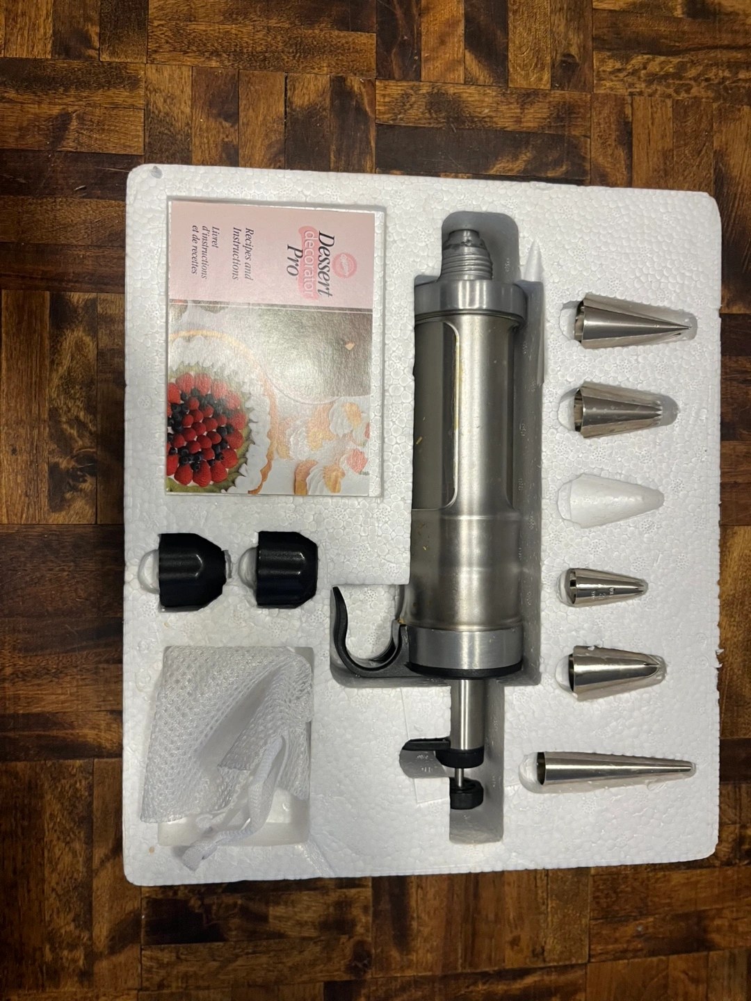 New in box, stainless steel dessert decorator. Includes 6 tips and recipes. Easy to use and clean. Perfect for elegant desserts and appetizers.