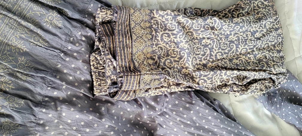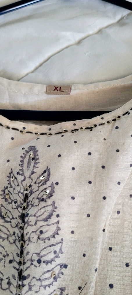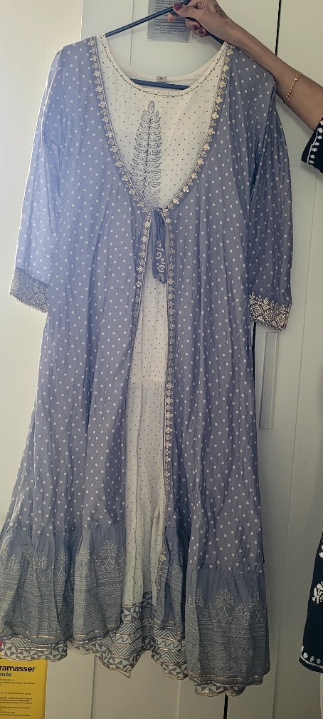 Stunning two-piece kurti set. Features a long grey polka dot jacket and a cream-coloured top with intricate detailing. Size XL but fits medium. Hand-embroidered embellishments. Perfect for special occasions.