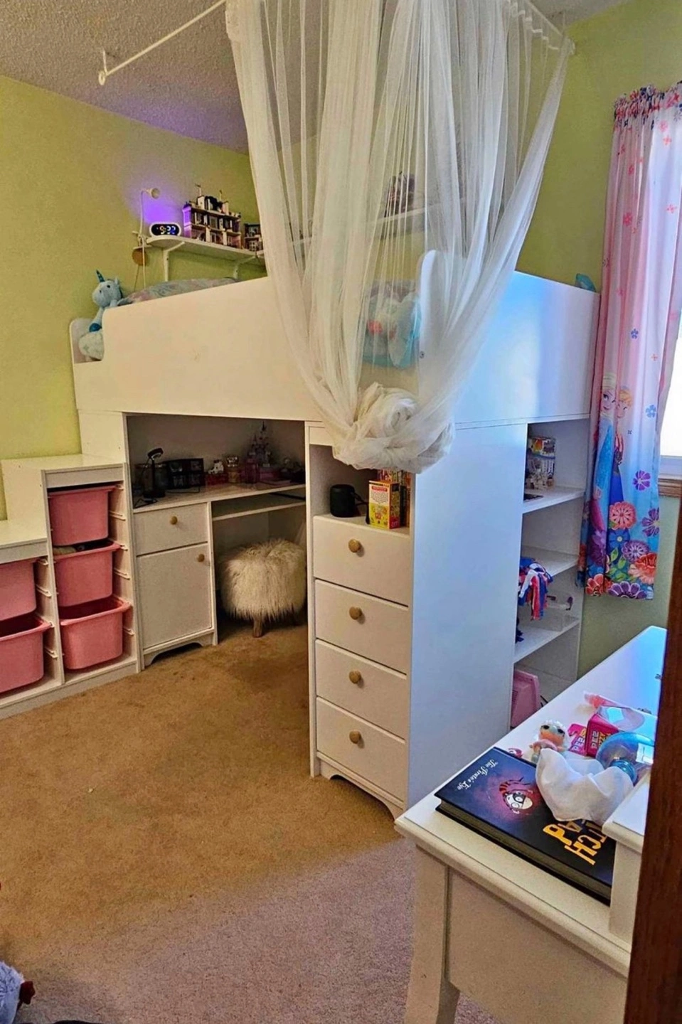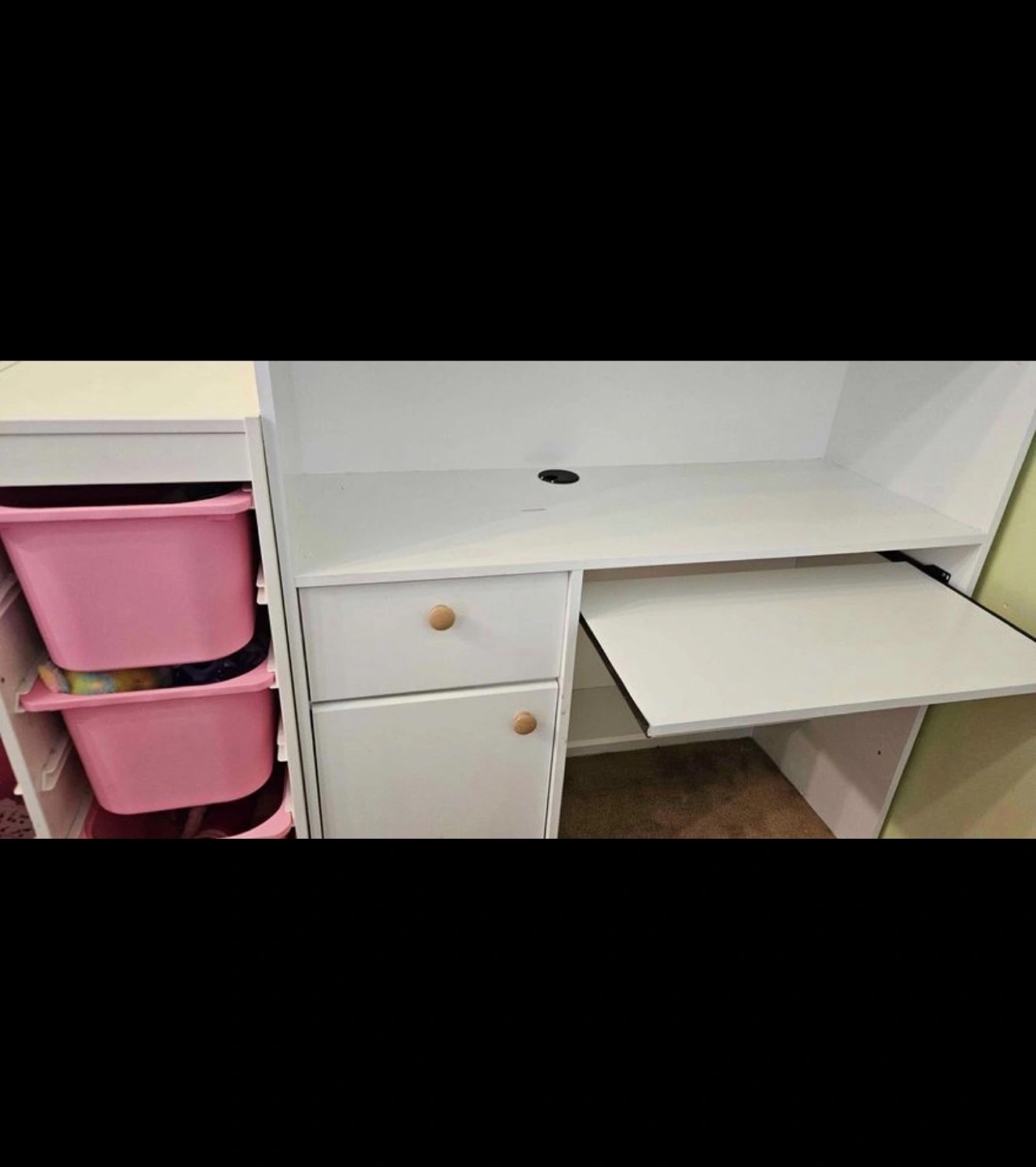 Create the perfect space for your child with this multifunctional kids loft bed set! Designed to save space and keep things organized, this charming unit includes: • Loft-style twin bed with safety rails • Built-in desk underneath with cozy seating area • Multiple storage compartments including drawers, open shelves (pink storage bins are not included) • Gently used, from a clean and smoke-free home This is a great setup for kids to sleep, study, and play all in one space. Ready for a new home! Pickup only.