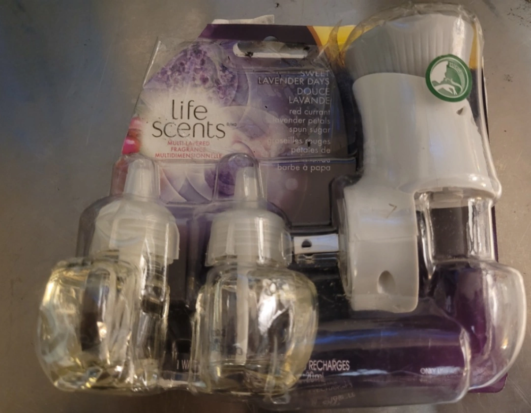 Life Scents Sweet Lavender Days plug-in oil warmer refill pack. Includes two refills and a warmer. Long-lasting fragrance. Sweet Lavender Days scent features red currant, lavender petals, and spun sugar.