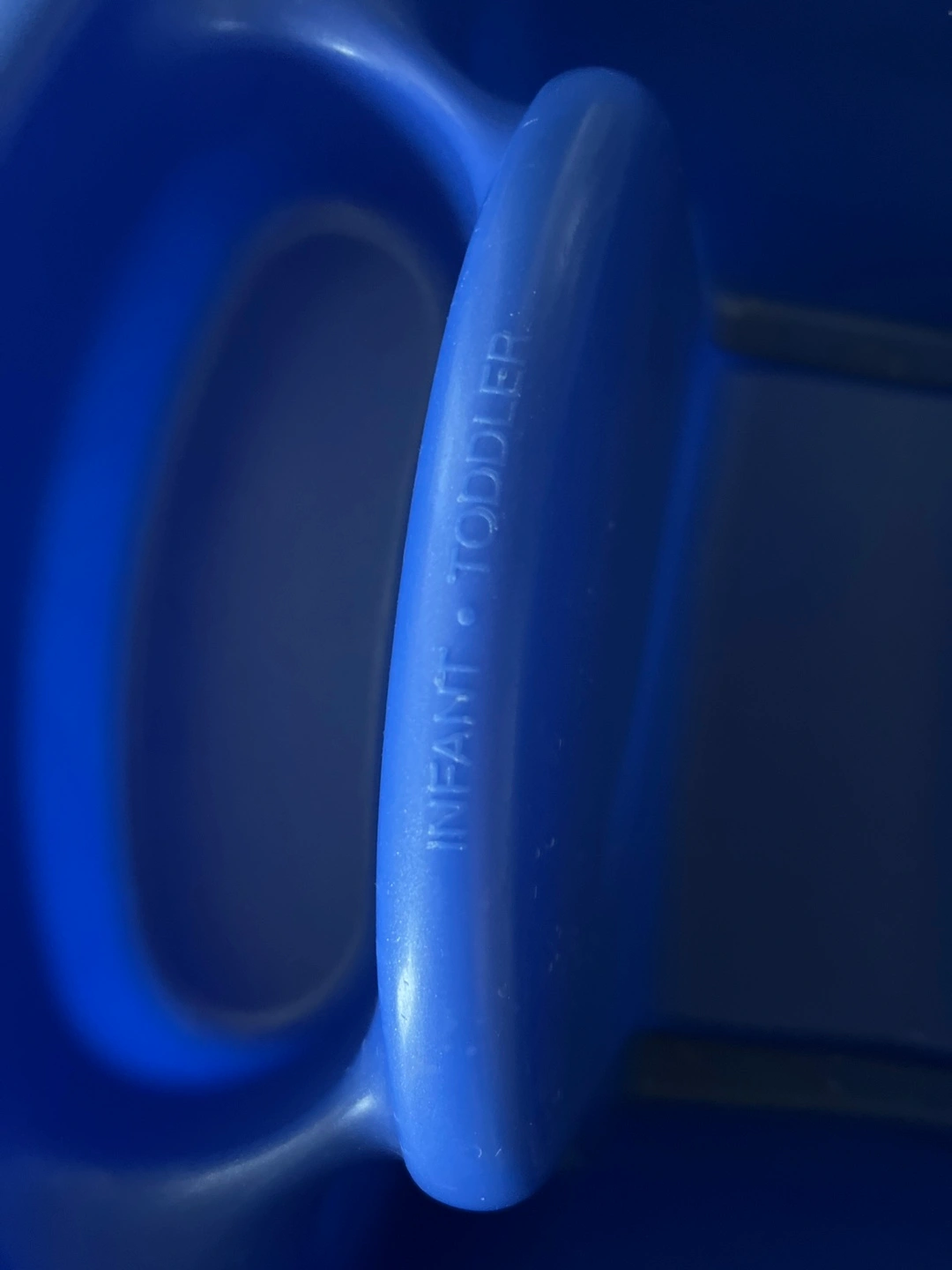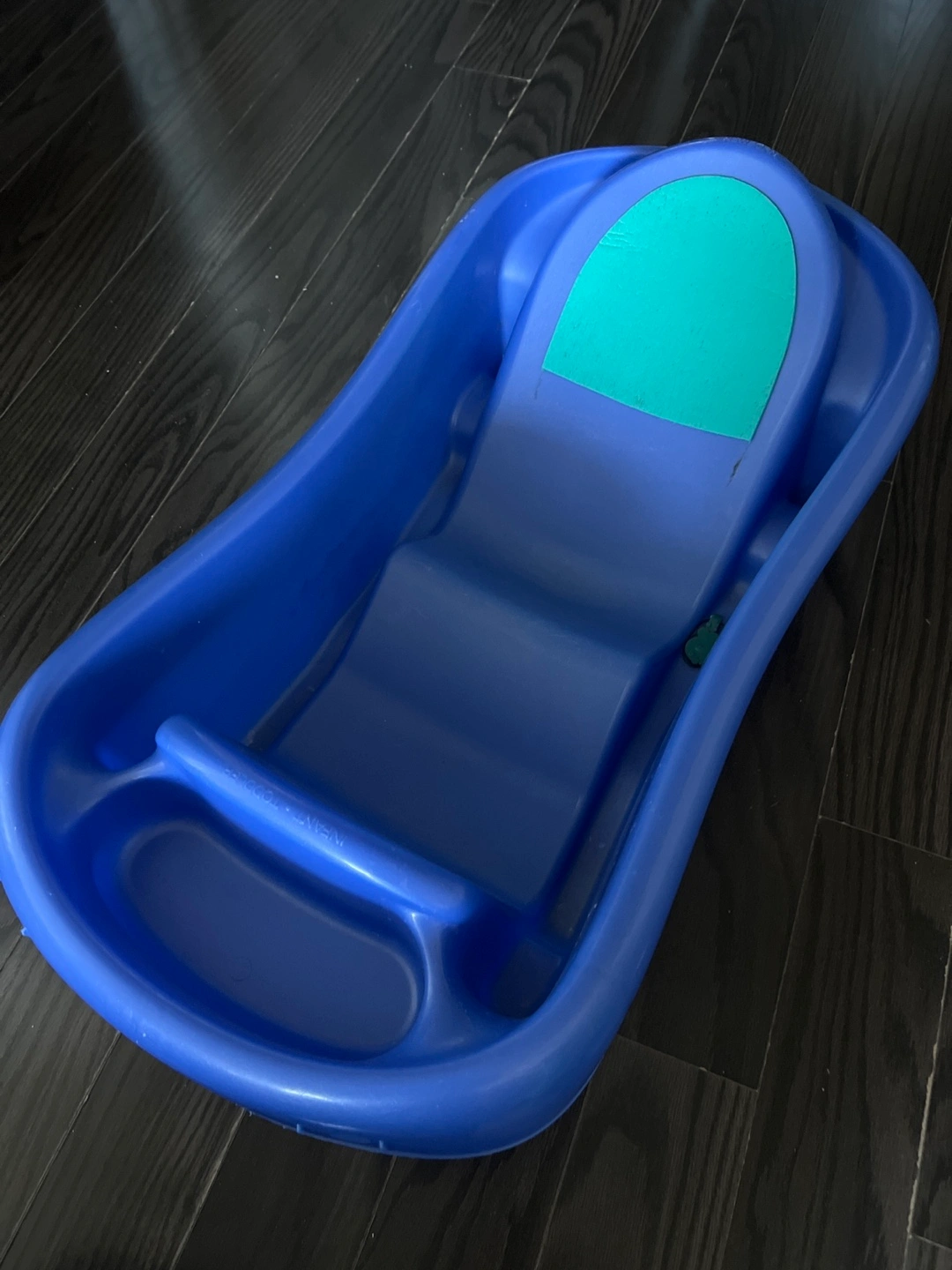 Blue plastic baby bath tub. Features two positions: newborn and infant/toddler. Good used condition.