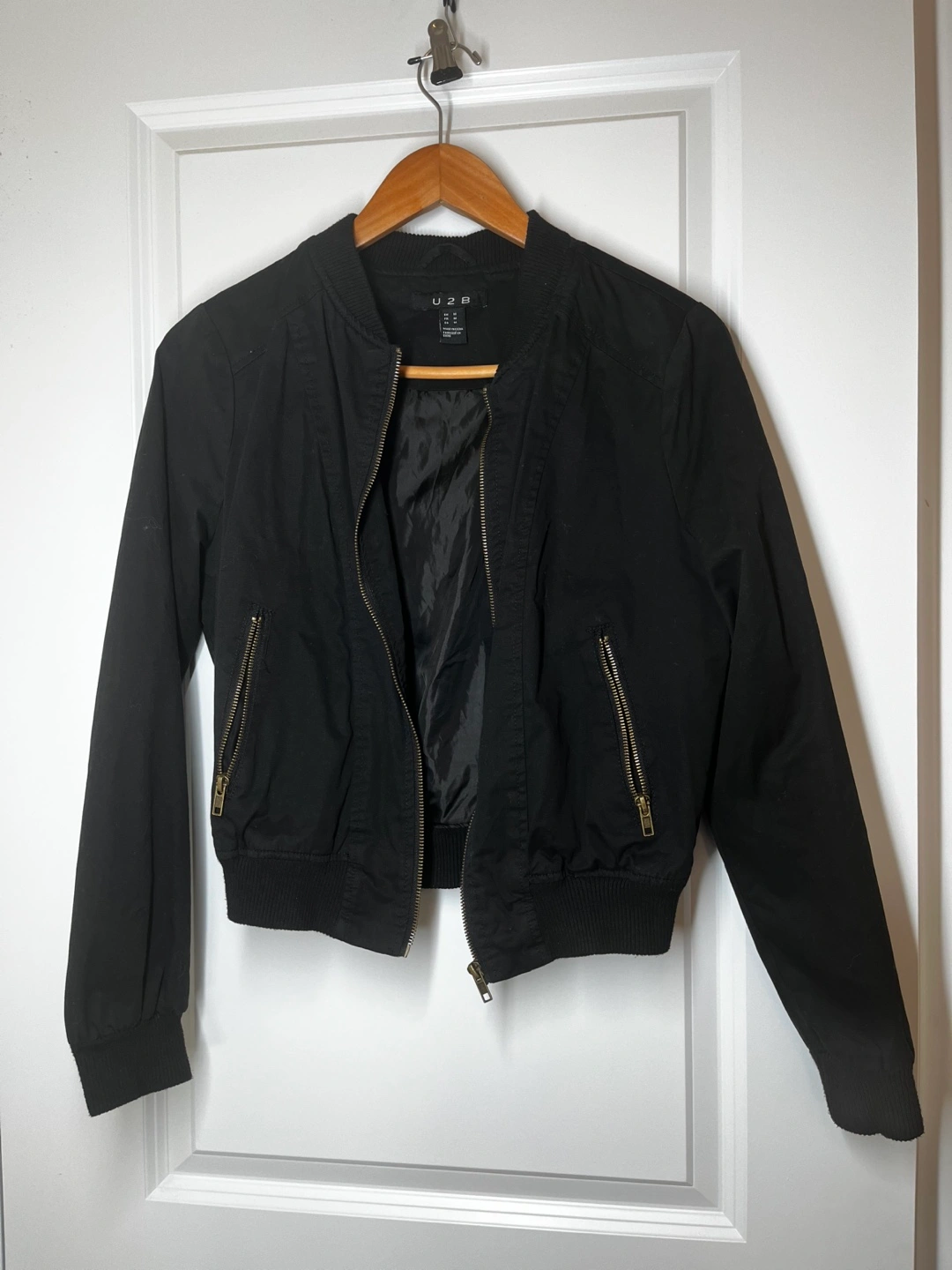 Women's black bomber jacket. Features gold zippers. Cropped style. Long sleeves. Ribbed cuffs and hem.