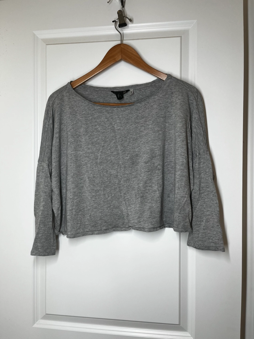 Lightweight cropped top. Grey heather fabric. Three-quarter sleeves. Relaxed fit. Boat neckline.