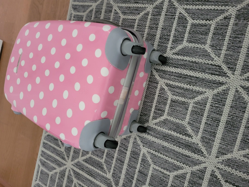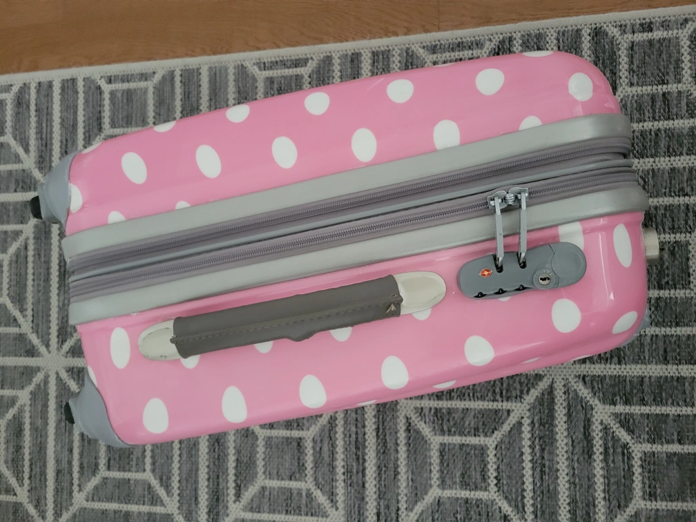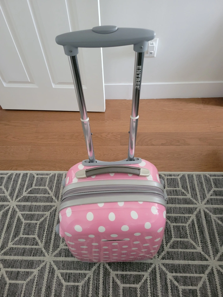 Cute pink carry-on suitcase. Polka dot design. Features spinner wheels and a retractable handle. Interior includes zippered compartments and tie-down straps. Great for weekend getaways or short trips. This carryon is made of polycarbonate/abs. The major benefits of this material - it is extremely lightweight, it is durable, and protects the contents of your luggage. Eight multi directional spinner wheels rotate 360 degrees for easy maneuverability. This luggage allows you to pack more while avoiding the excess weight surcharges imposed by most airlines. Multi-directional spinner wheels for easy maneuverability. Modern internal chrome telescoping handle with push button handle. Interior mesh and zip pocket and elastic pocket. 20 inchx13 inchx10 inch Product Dimensions: 59.7L x 36.8W x 26.7H Centimetres Item weight : 6 Pounds Number of wheels : 4 Capacity : 2.89 liters Storage volume : 38.3 liters Color: Pink with white dots Brand: Entree Used only one time Original price: $161.24 before tax