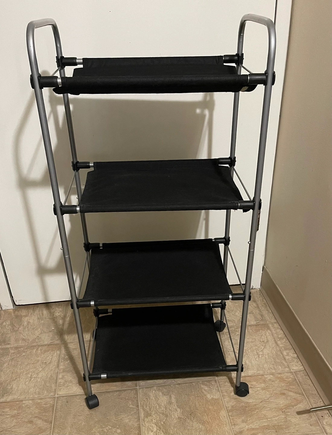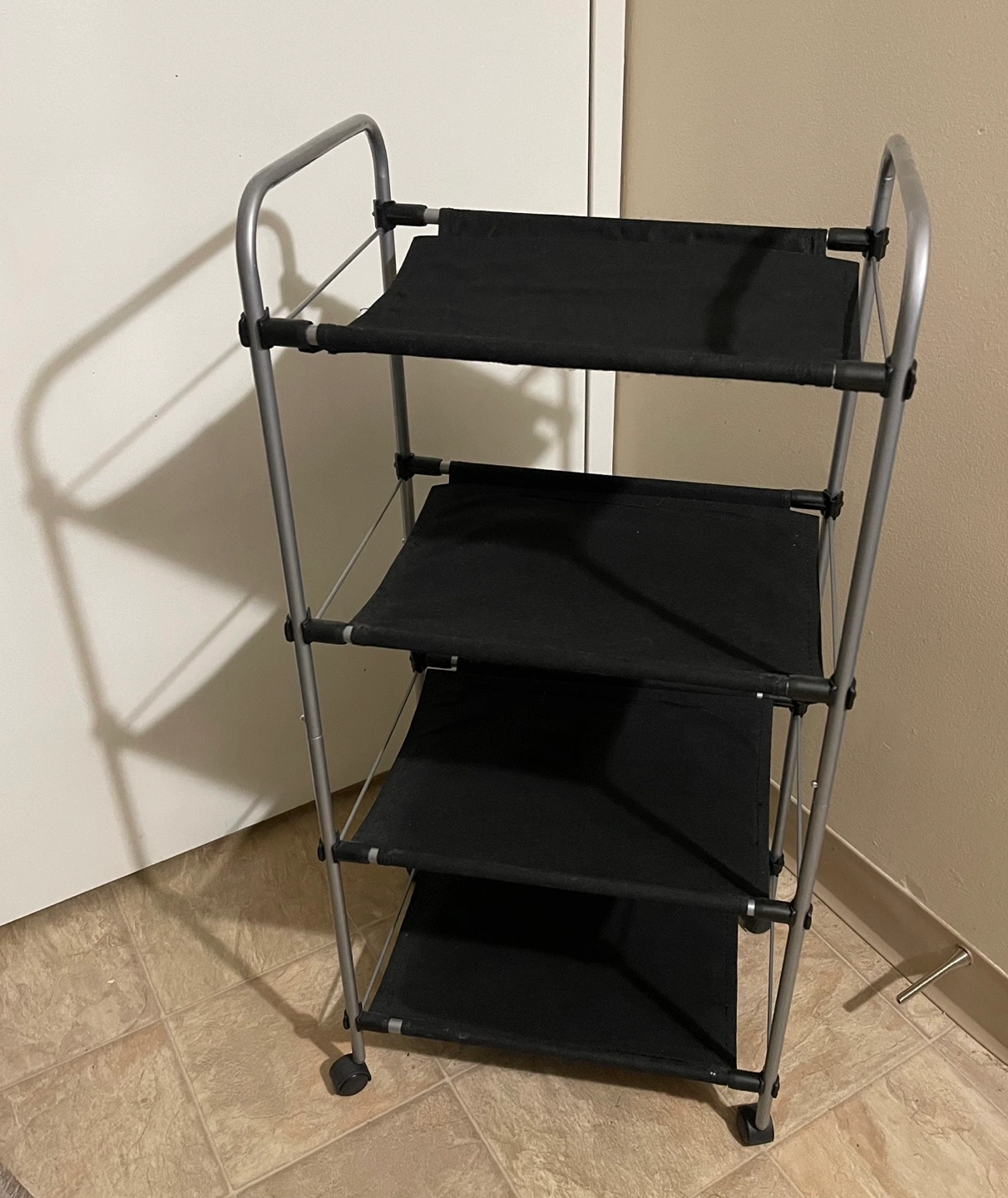 Four-tier fabric storage shelf. Metal frame. Black fabric shelves. Wheels for easy mobility. Great for shoes, storage, or organization. Excellent condition. Cash and pick up only.