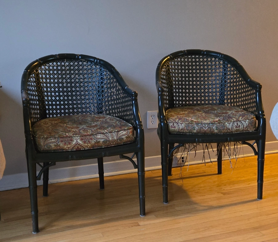 Pair of vintage faux bamboo and cane accent chairs, Made in Spain. Features carved faux bamboo framing with a distressed and caned seat and back. Excellent vintage condition with normal wear true to their age and use. Some minor breaks in caning and abrasions to the legs. Floral patterned cushions. note* one chair needs repair*