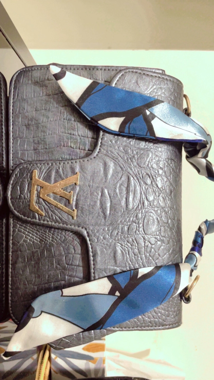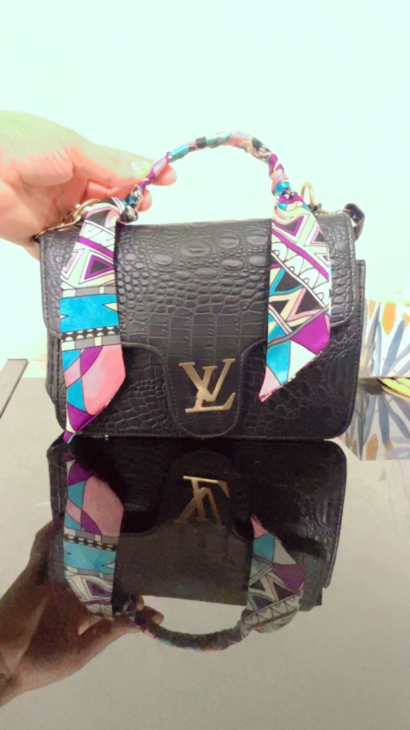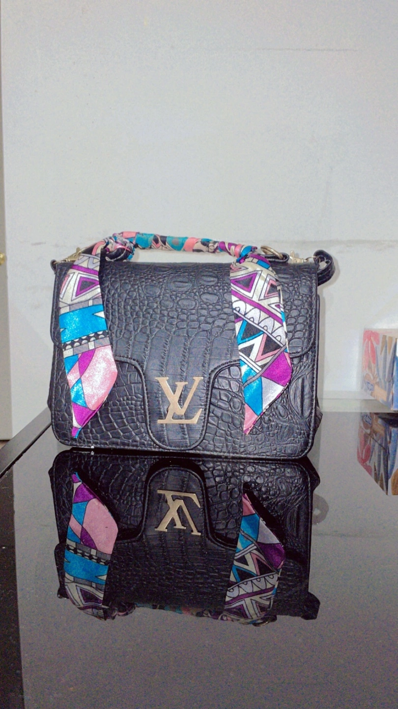 Elegant handbag, crocodile-embossed design. Features a gold-tone logo and a colourful scarf detail. Shoulder strap included. Great for everyday use or special occasions. First copy of Gucci GG and Louis Vuitton Lv $60 all 3