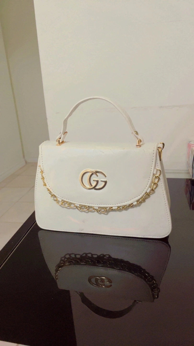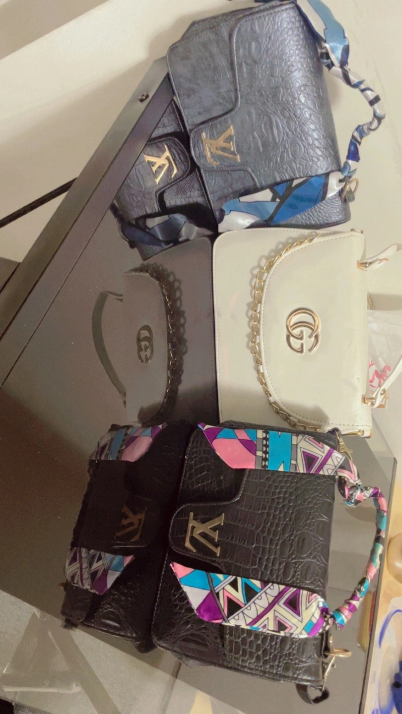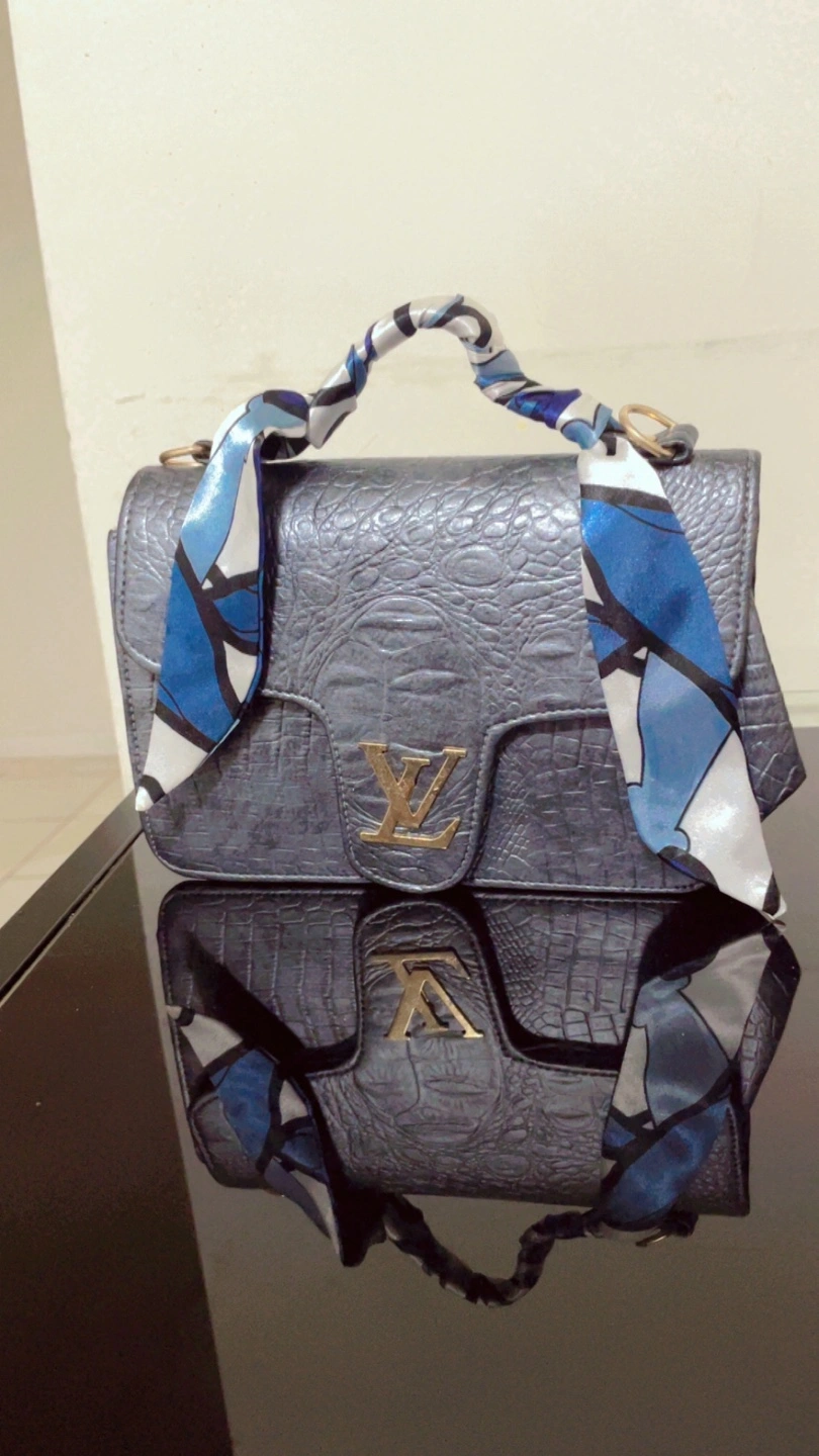 Elegant handbag, crocodile-embossed design. Features a gold-tone logo and a colourful scarf detail. Shoulder strap included. Great for everyday use or special occasions. First copy of Gucci GG and Louis Vuitton Lv $60 all 3