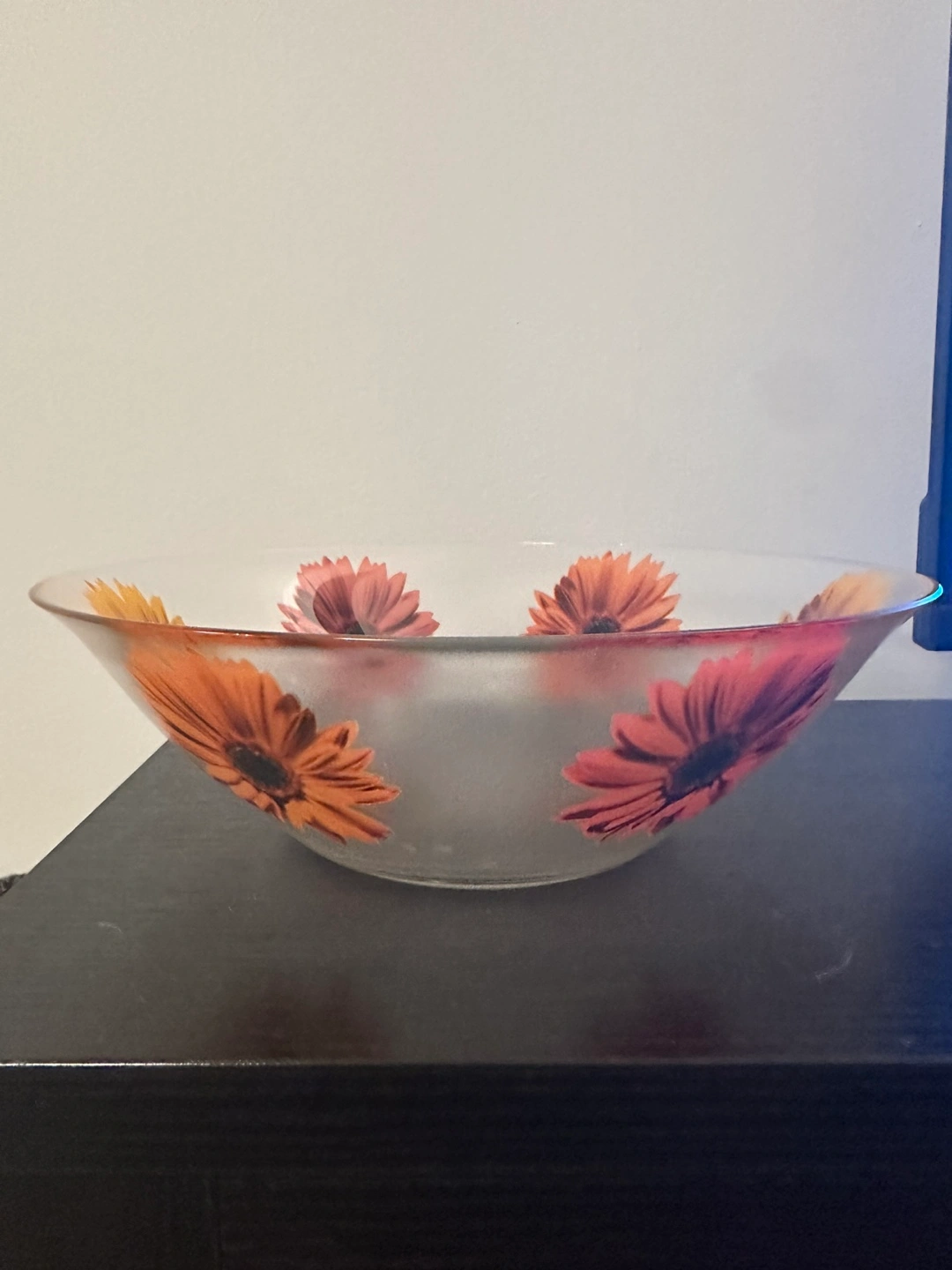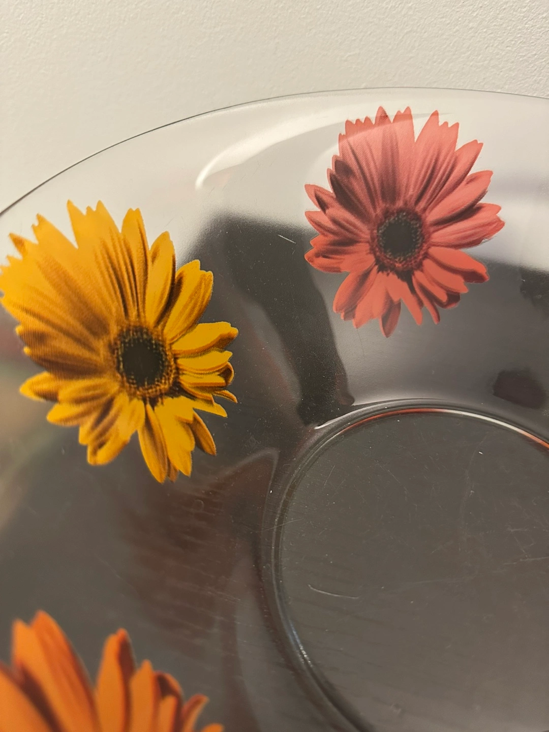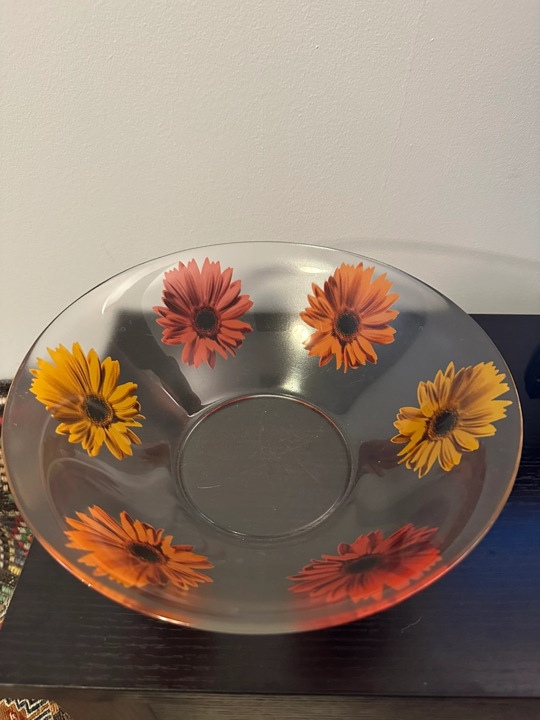 Large glass serving bowl. Diameter 10 inches. Features orange, red and yellow daisies. Clear glass with frosted effect. Perfect for fruit, snacks, or decorative purposes.