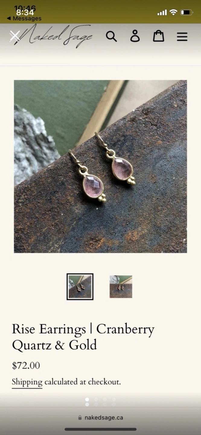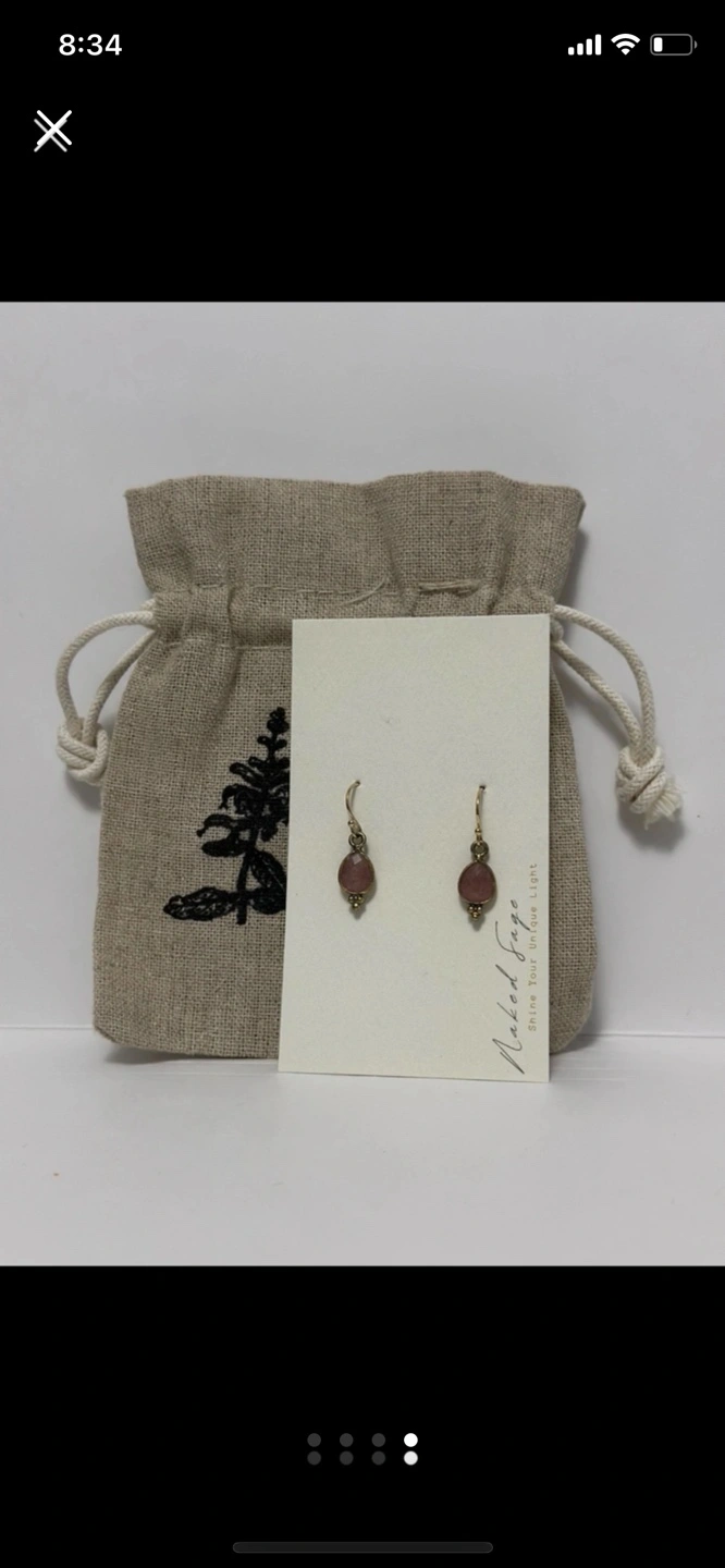 Beautiful pair of dangle earrings. Features cranberry quartz gemstones and gold accents. Comes in a linen drawstring bag. Perfect gift.