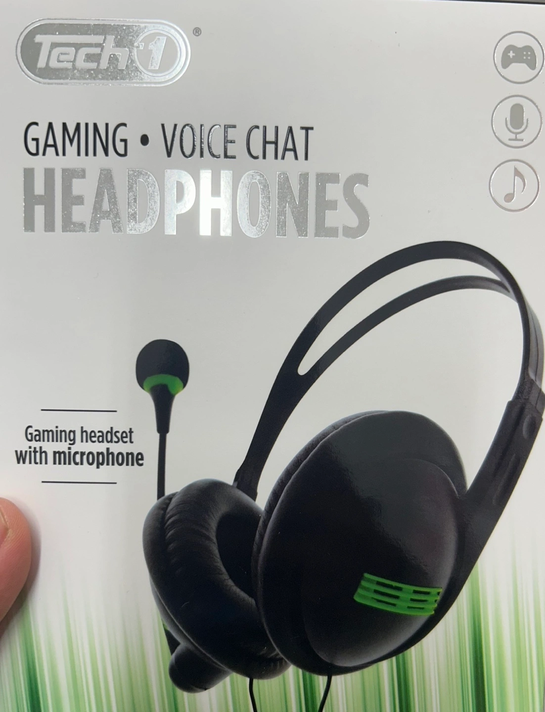 Voice chat headphones. Gaming headset with microphone. Black headphones with green accents.