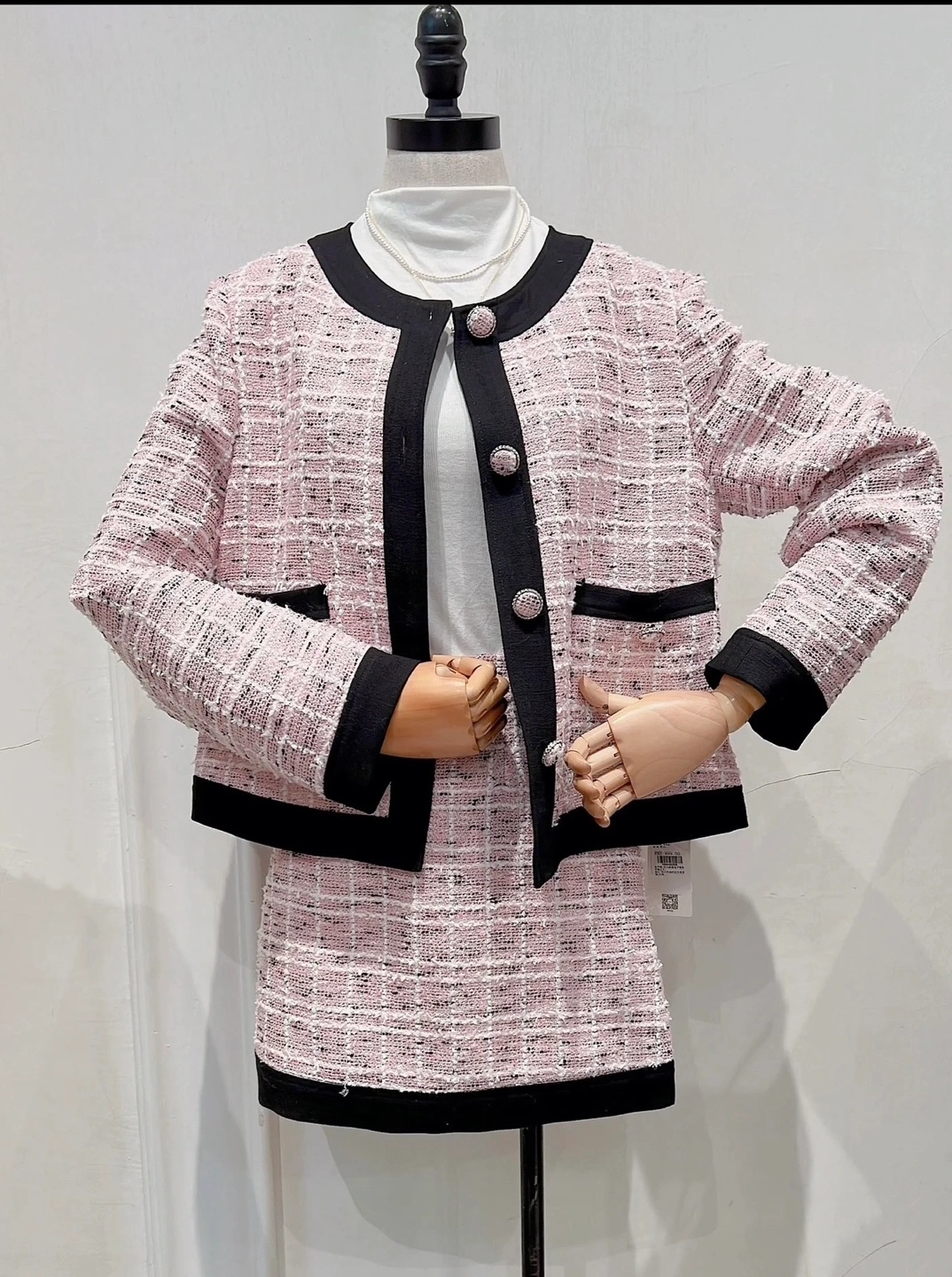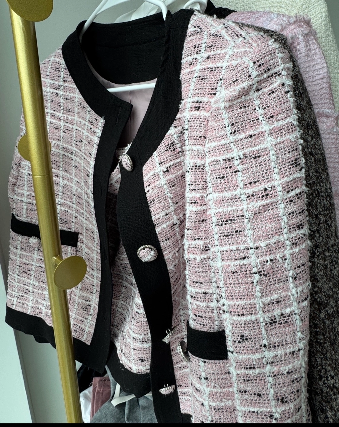 Adorable pink tweed jacket and skirt set. Jacket worn once, skirt new with tag. Features black trim, pearl-like buttons. Great for spring or fall. DT pickup only