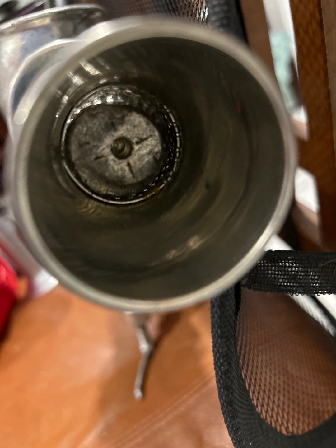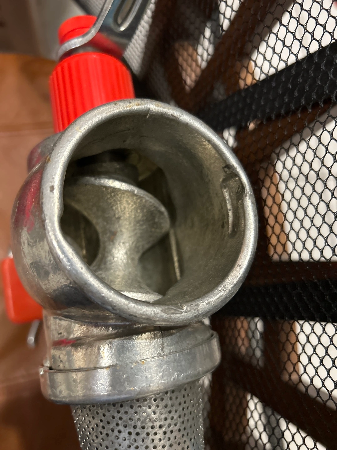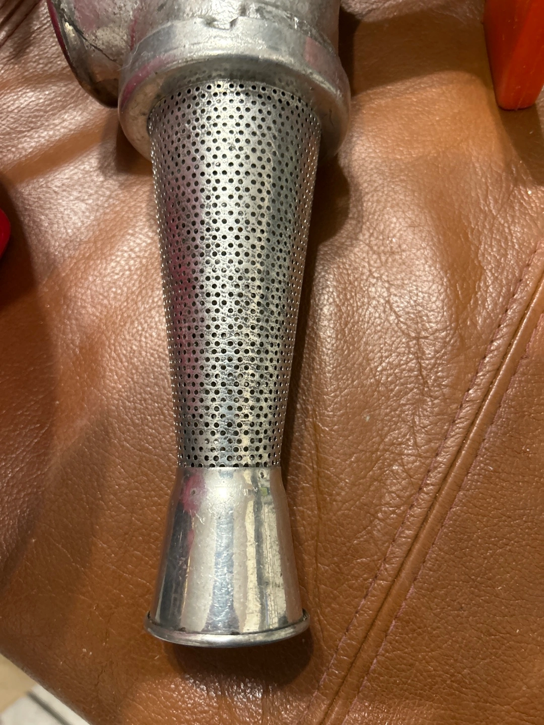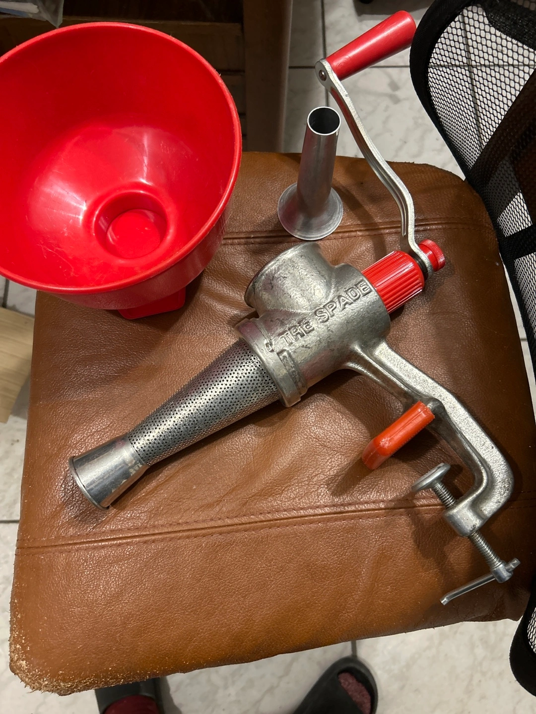 Vintage The Spade brand food mill. Includes a red plastic bowl and extra attachments. Metal construction. Shows some signs of use.