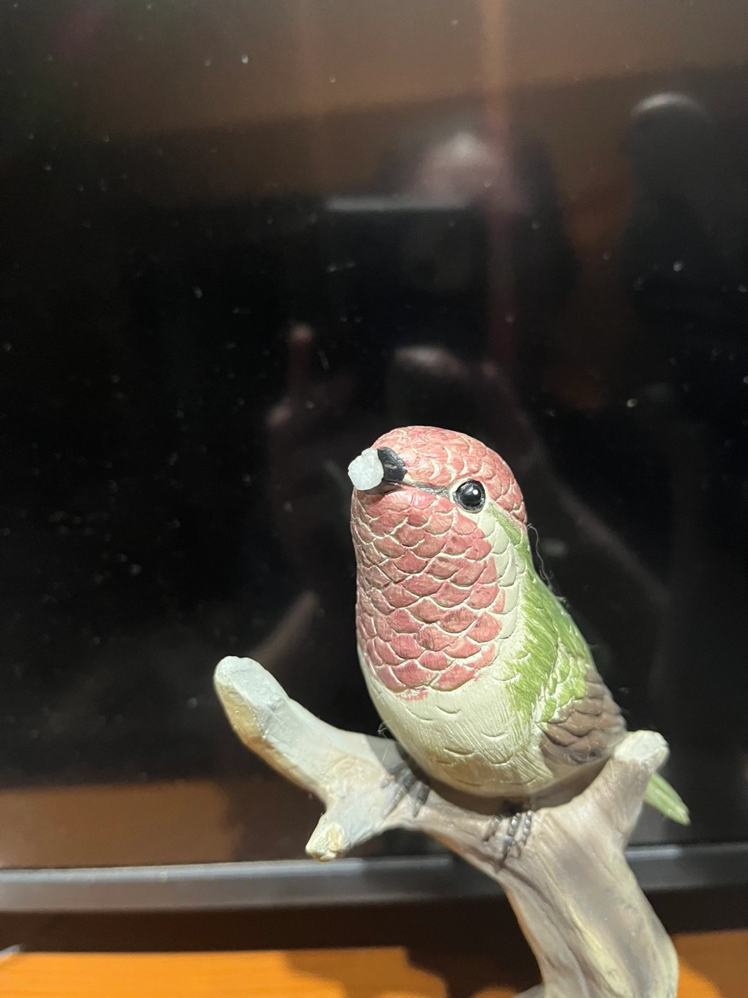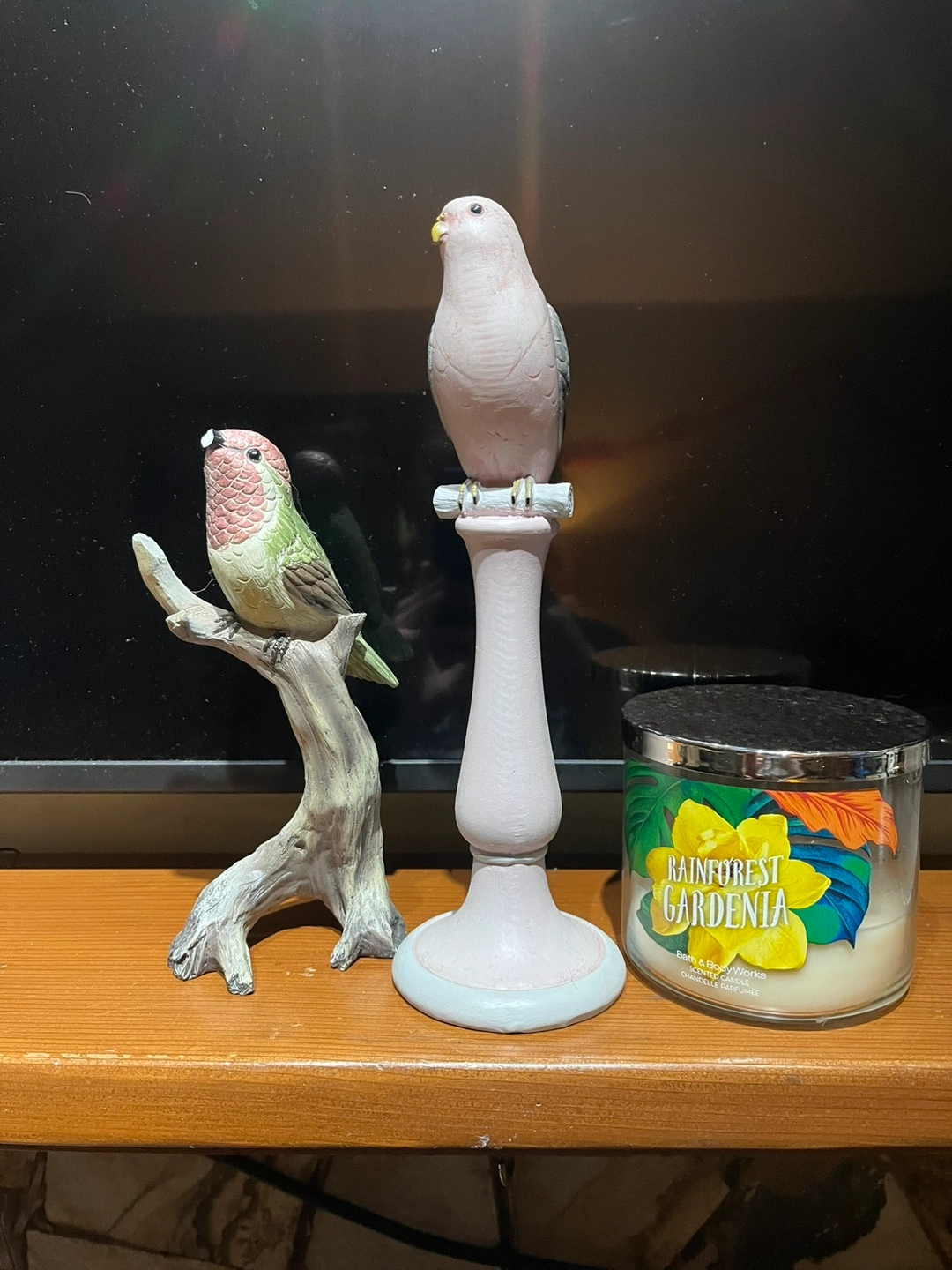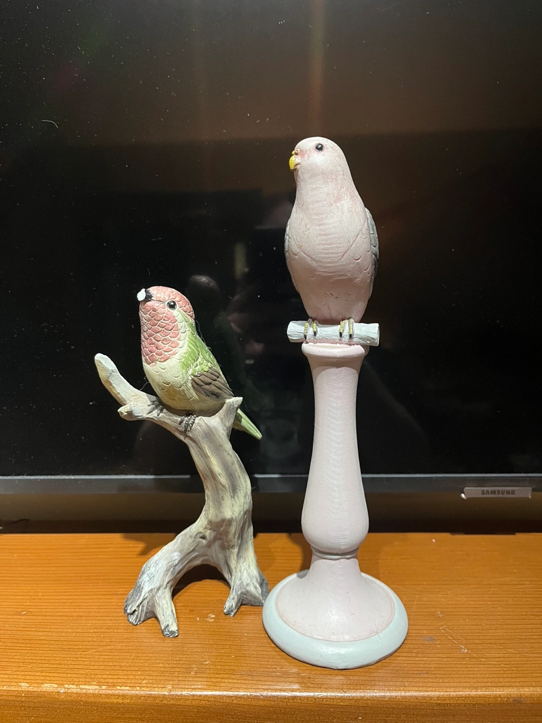 Set of two small bird figurines. One hummingbird perched on a branch, the other a light pink bird on a pink stand. Collectible or decorative pieces. Unfortunately the pink birds nose is broken off ...no other cracks or chips I've seen
