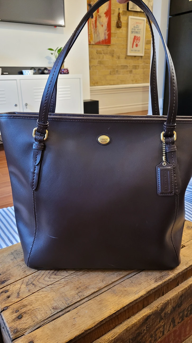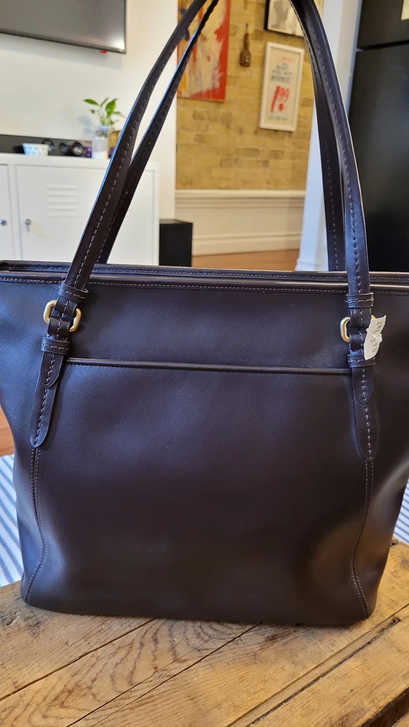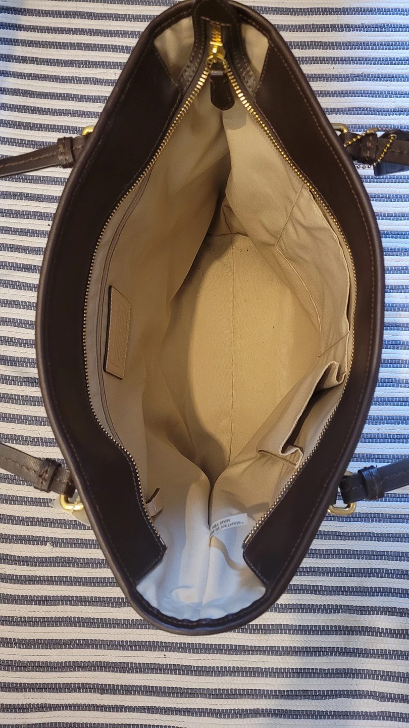 New, never used, Mahogany/brass COACH Zip Top Tote. From the COACH Creed emblem inside, this tote is: K1395 (K= made in October, 13= made in 2013, 95= manufacturing location) F27349 (F= made for factory outlet, 27349= coach style #, in this case the zip top tote) Leather Inside zip, cell phone and multifunction pockets Zip-top closure, fabric lining Handles with 8 1/2" drop 13 1/4" (L) x 10 3/4" (H) x 6 1/4" (W) Originally purchased for $125 (outlet tag still attached), asking for $75. Pickup and King W and Jameson Ave.
