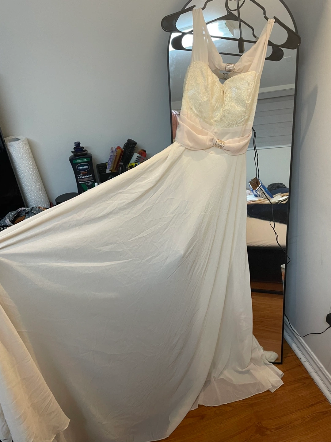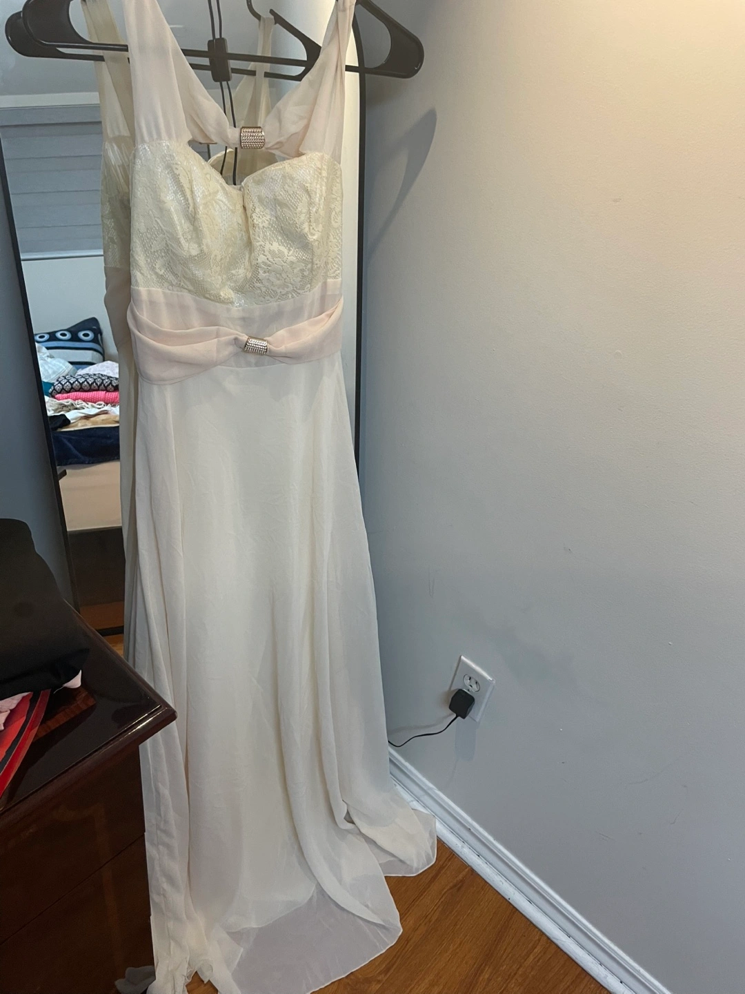 Beautiful off-white formal gown. Features a fitted bodice with delicate lace detailing and a flowing chiffon skirt. Accentuated with a satin sash and rhinestone embellishments. Perfect for prom, wedding, or other special occasion. Brand new- Never worn