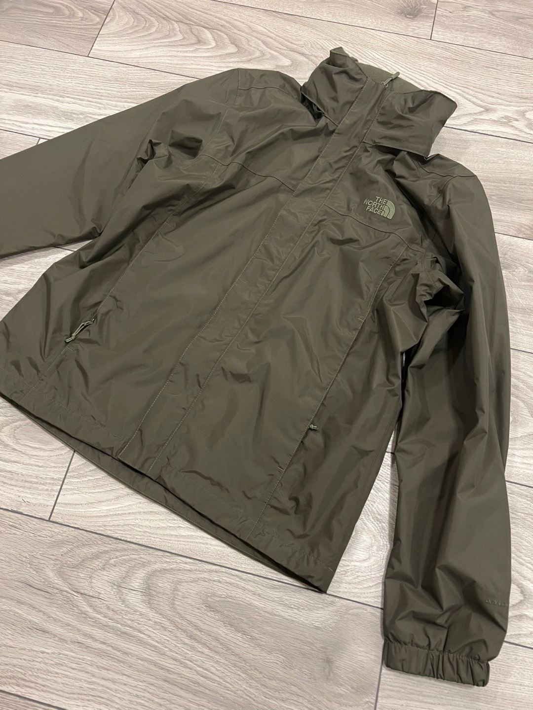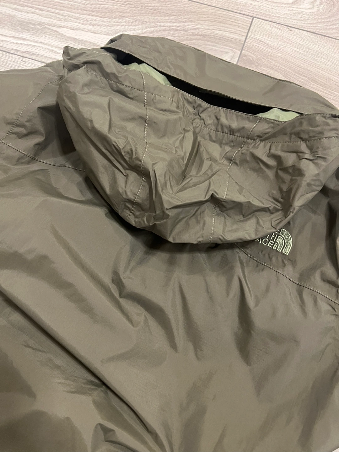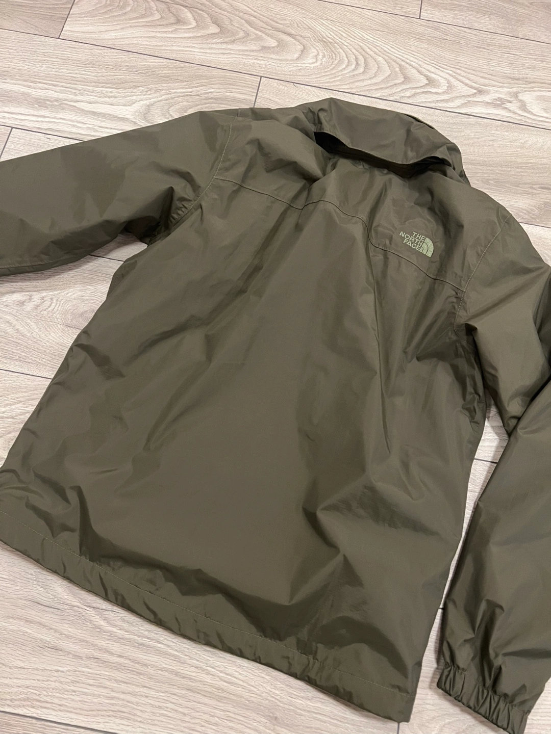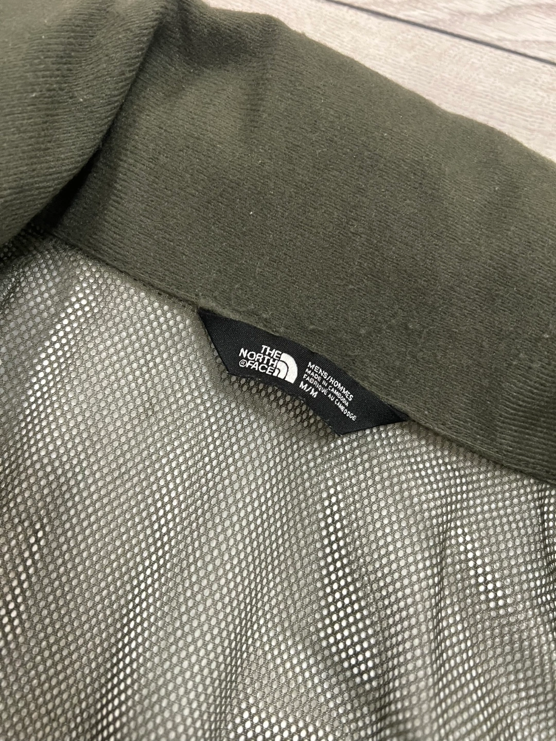 -Olive green men's rain jacket -Features a hood and zipper closure -Long sleeves with elasticized cuffs -Size M