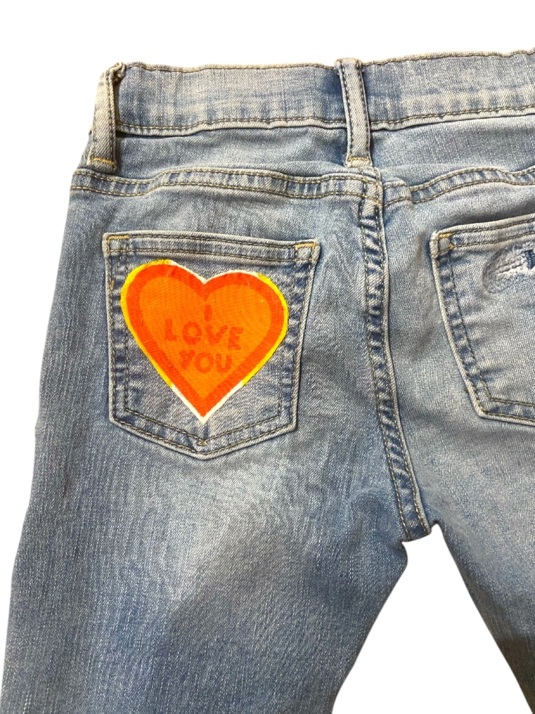 Light wash denim jeans. Size 5. Stretch skinny fit. Features distressed detailing and vintage patches. One of a kind. Broadview and Danforth.