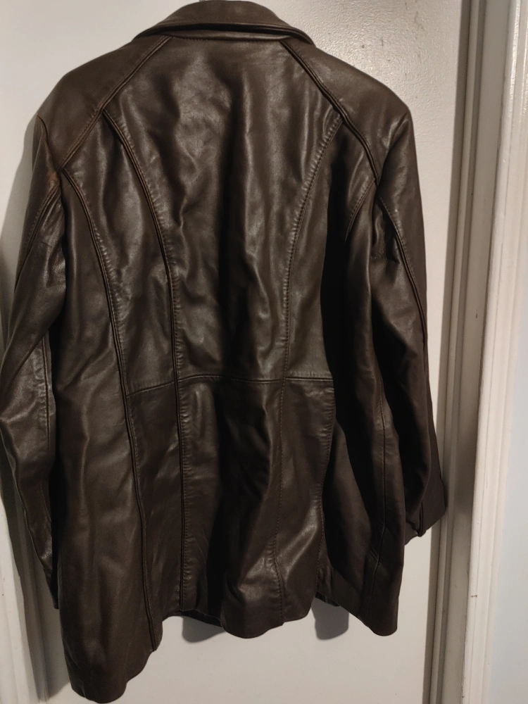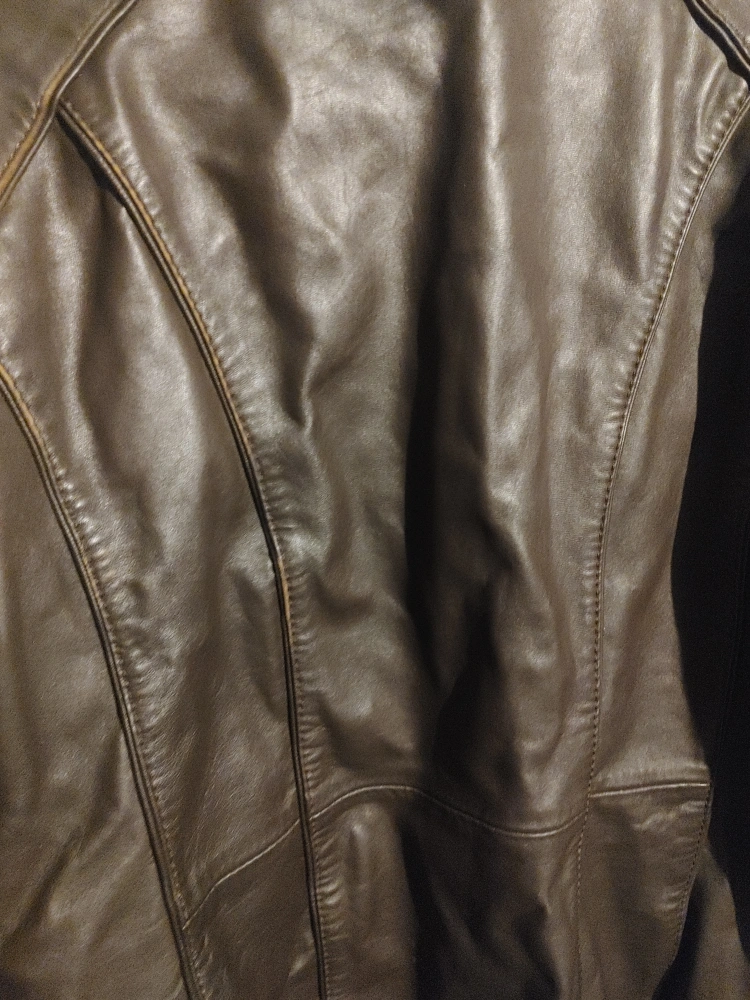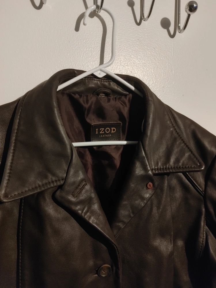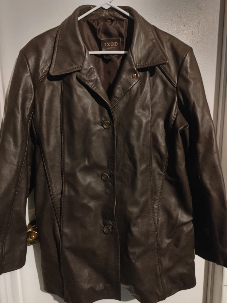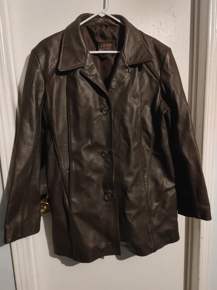 🥕IZOD GENUINE LEATHER JACKET 🥕PURCHASE PRICE WAS $400 🥕NEW CONDITION. (SMALL BLEMISH, SEE LAST PHOTO) 🥕LADIES XL, BUT FITS SMALLER. *ARMPIT TO ARMPIT IS 22 INCHES *LENGTH IS 34 INCHES *SLEEVE LENGTH IS 23.5 INCHES 🥕PLEASE COMPARE WITH A SIMILAR PIECE OF CLOTHING YOU OWN 🥕I AM LOCATED IN THE YONGE AND STEELES AREA FOR PICKUP