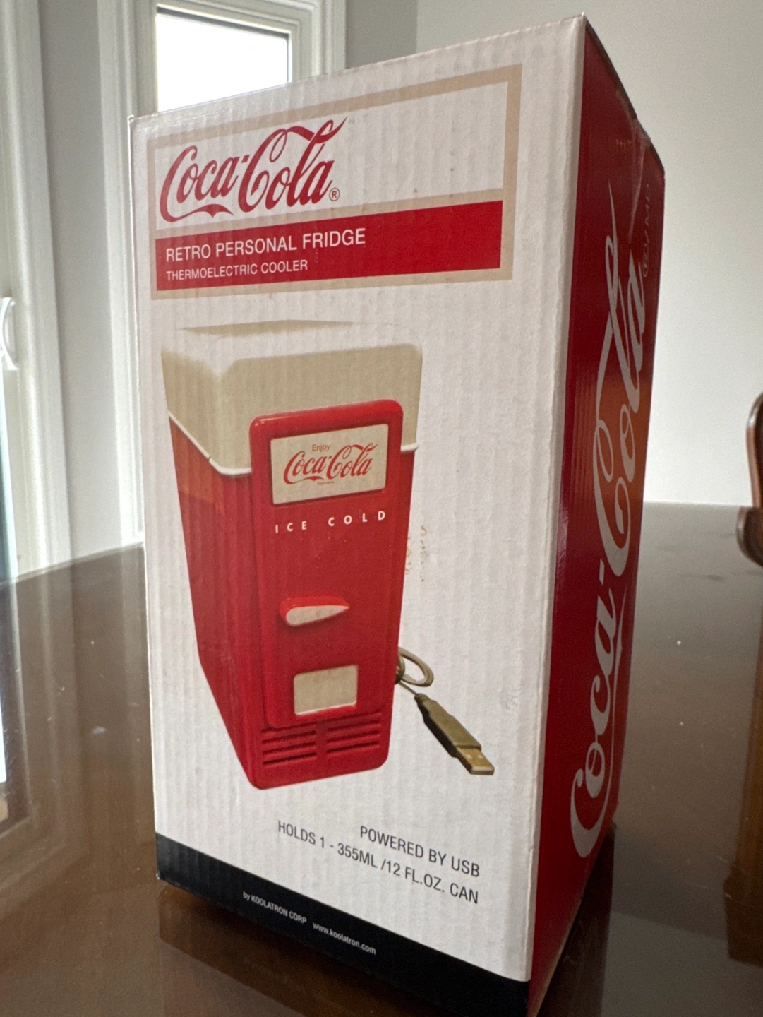New Coca-Cola branded mini fridge. Powered by USB. Holds one 355ml can. Retro design. Still in the box.