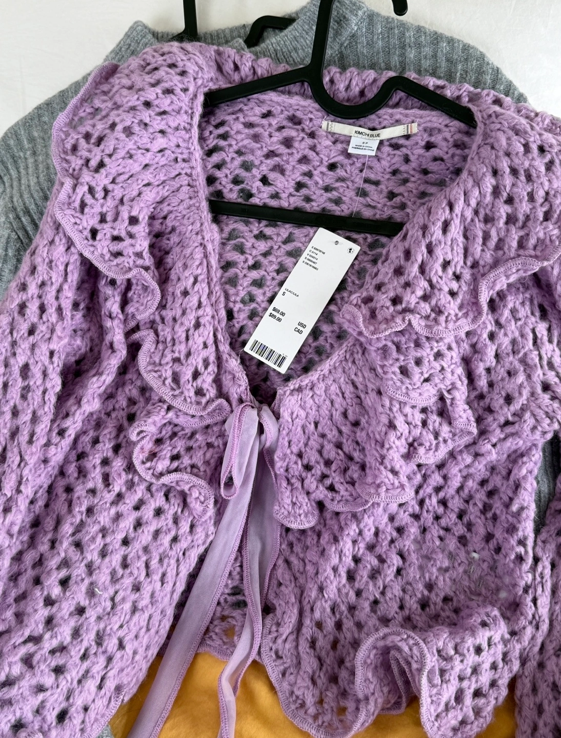 Adorable lightweight lavender crochet cardigan. Features a ruffled neckline and tie front. Size small. DT pickup only