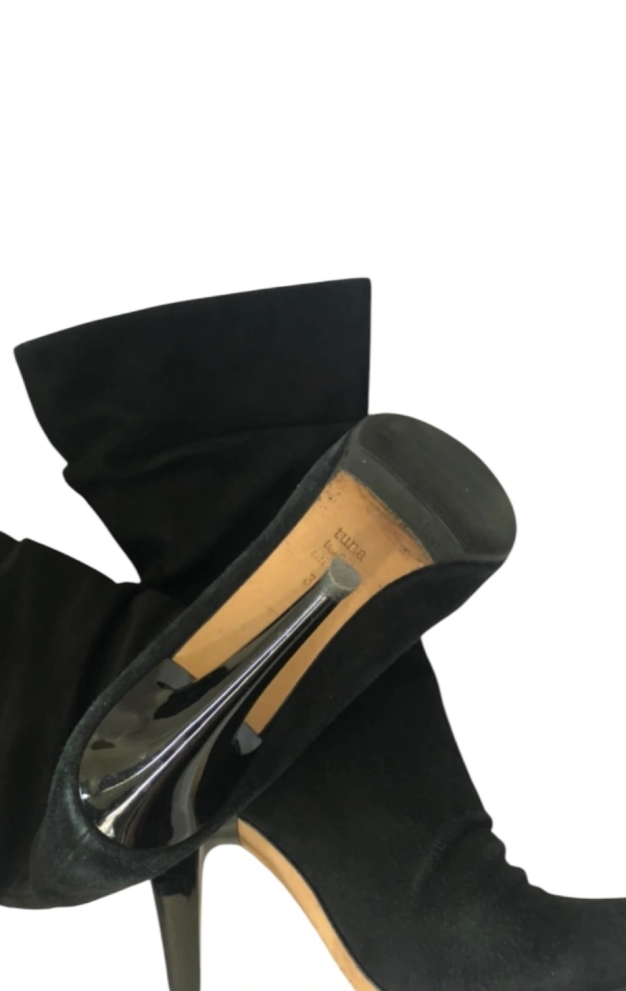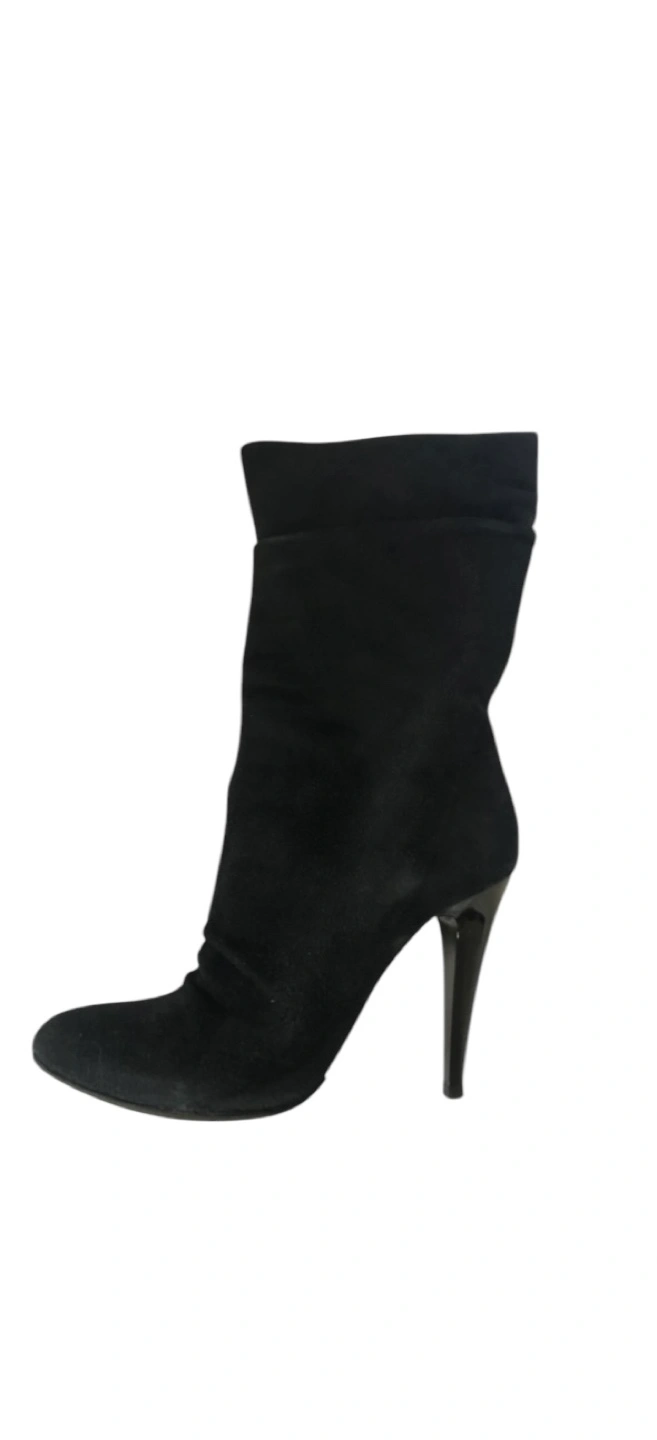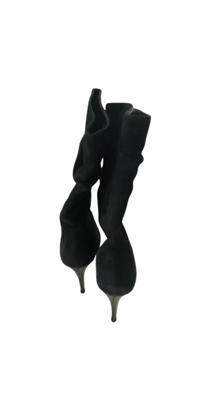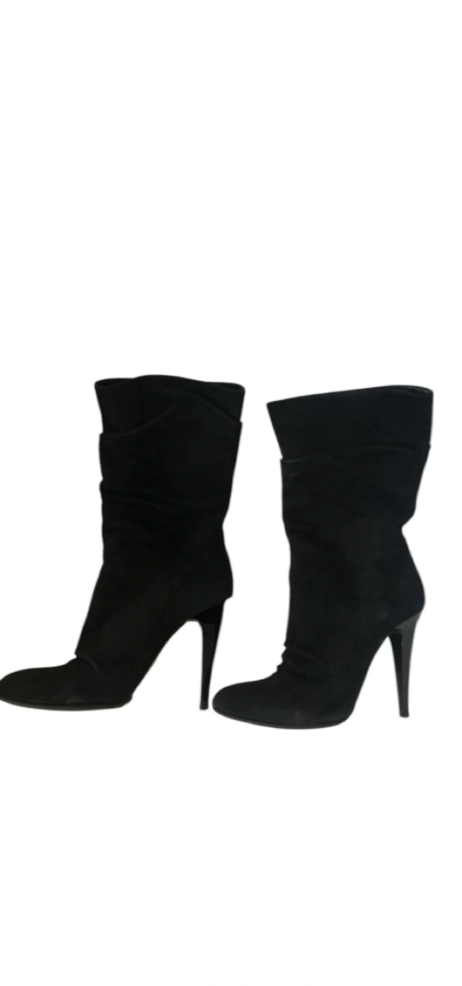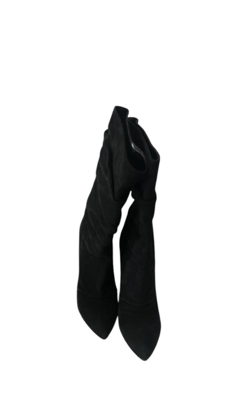 Woman Black Boots , Size 8 Pair of black suede slouch boots. High stiletto heel. Pointy toe. Mid-calf height.