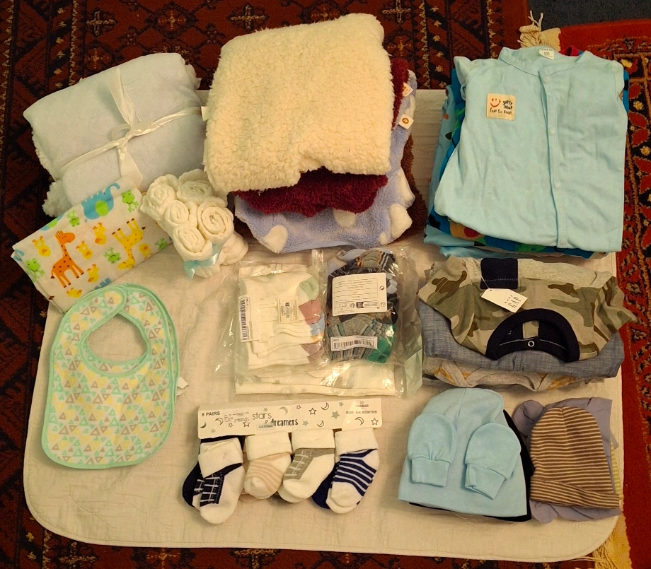 Never used bundle of baby boy clothes. Sizes range from newborn to 6 months. Includes sleepers, onesies, pants, hoodies, and more. items are new with tags. Various colours and patterns. Cash Only. from a smoke free and Pet free home.
