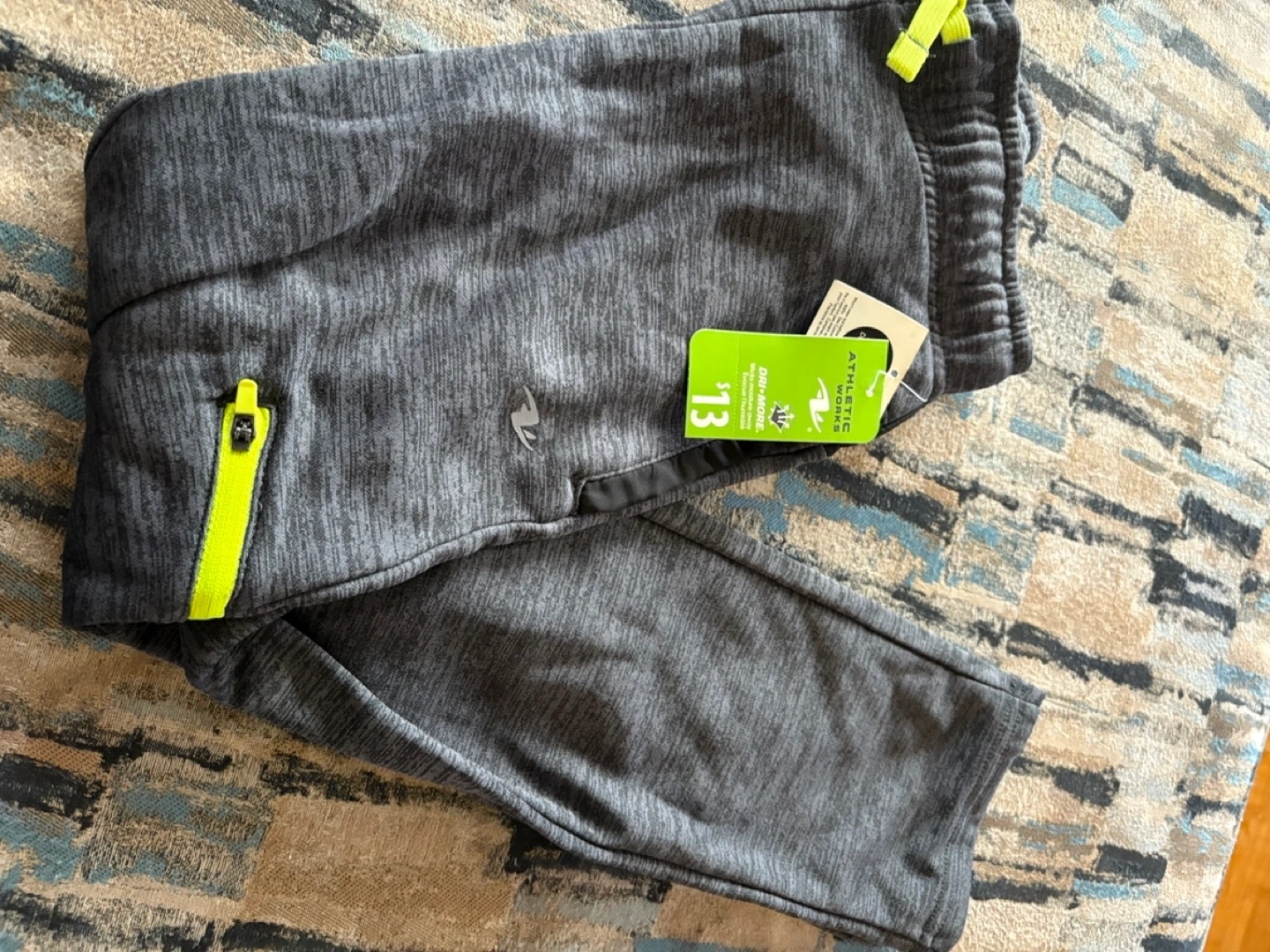 Grey boys' joggers. Size medium/medium (7-8). Features a drawstring waistband and side pockets. Made in Bangladesh.