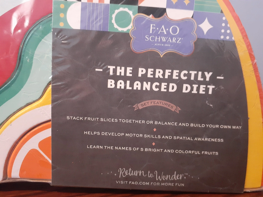 Five-piece wooden fruit stacker. Brightly coloured fruit slices. Stack or balance. Develops motor skills and spatial awareness. Ages 3+