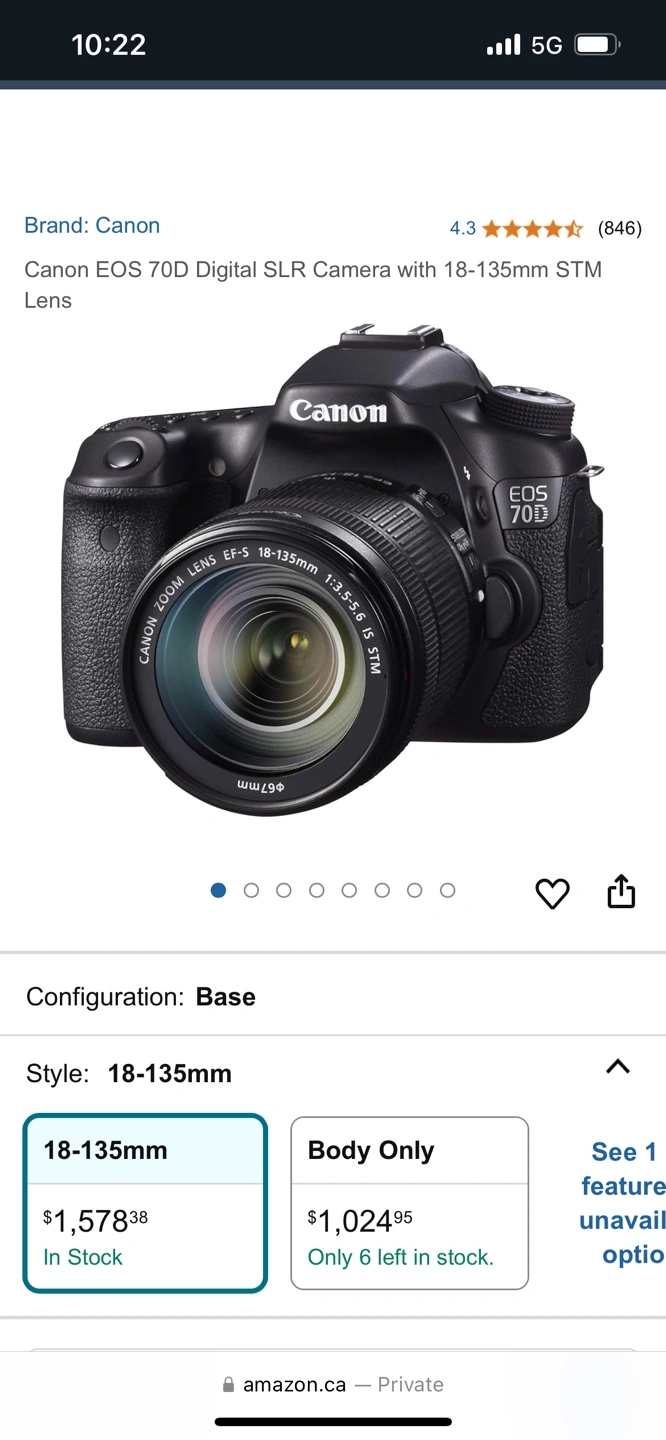 Selling for $1,578 on Amazon Canon EOS 70D Digital SLR Camera. 18-135mm STM lens. Base configuration. Excellent condition. Does not include battery pack to charge battery (includes the actual battery)