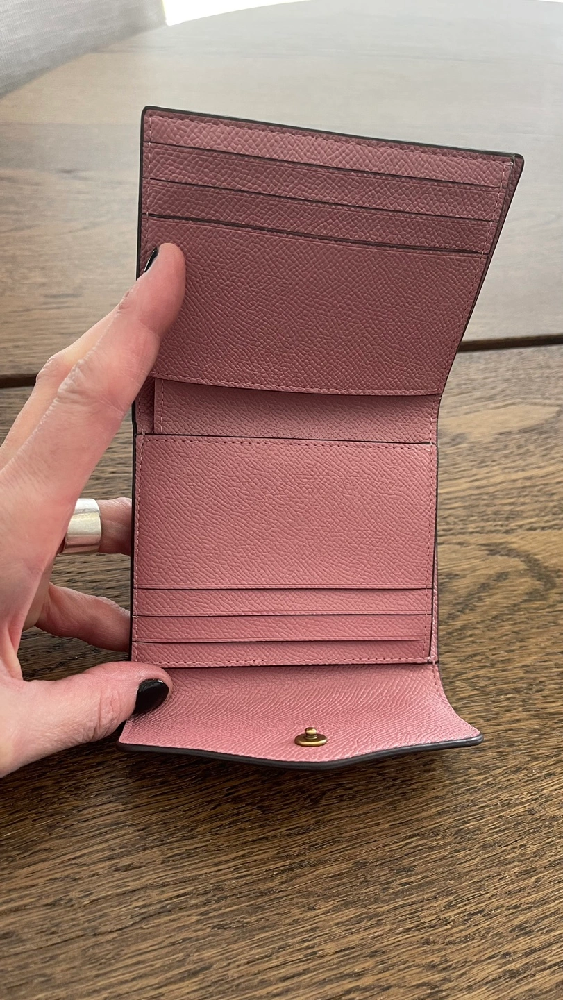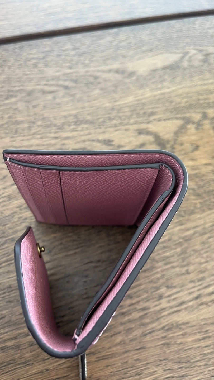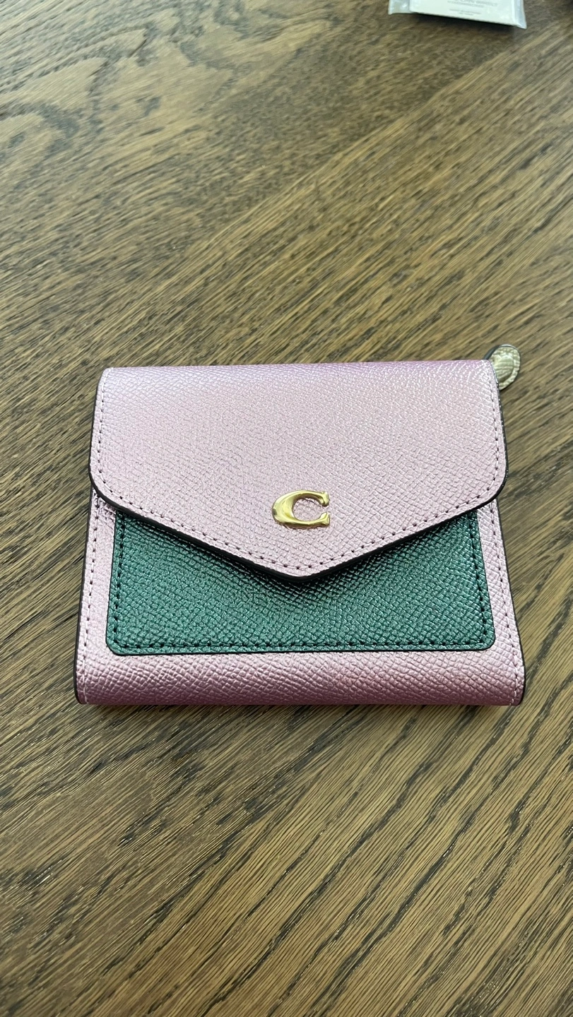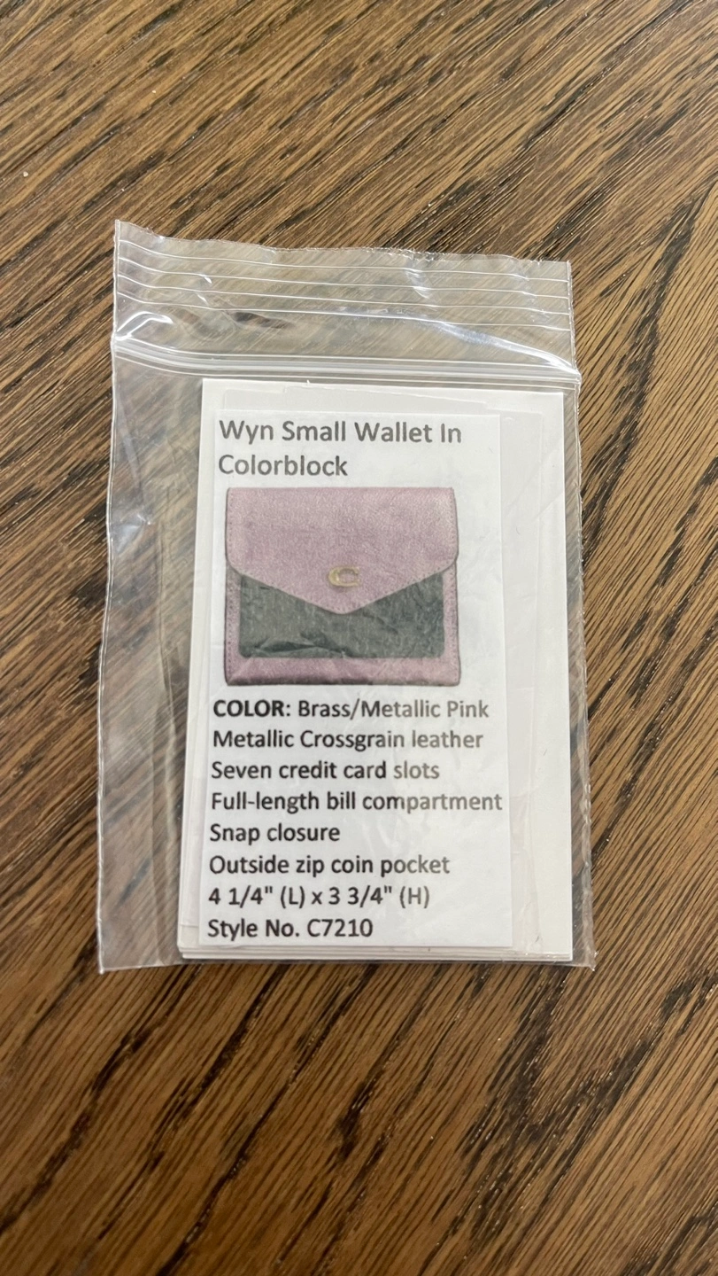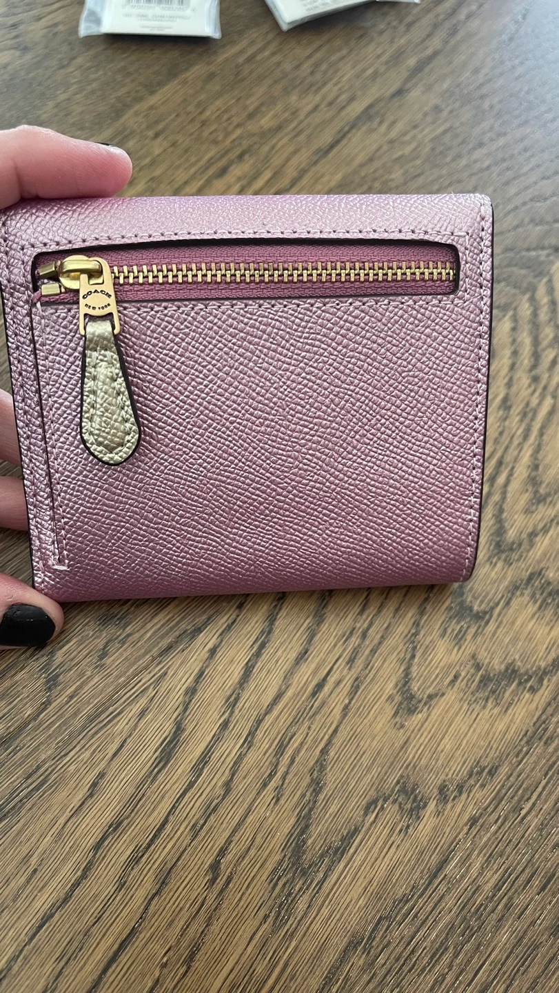 Coach small wallet. Brass/Metallic Pink. Metallic Crossgrain leather. Seven credit card slots. Full-length bill compartment. Snap closure. Outside zip coin pocket. 4 1/4" (L) x 3 3/4" (H). Style No. C7210.