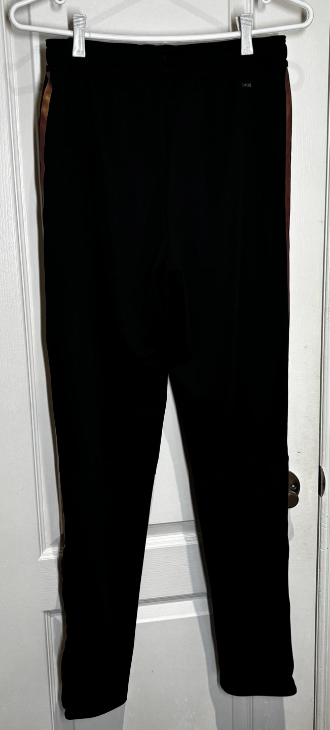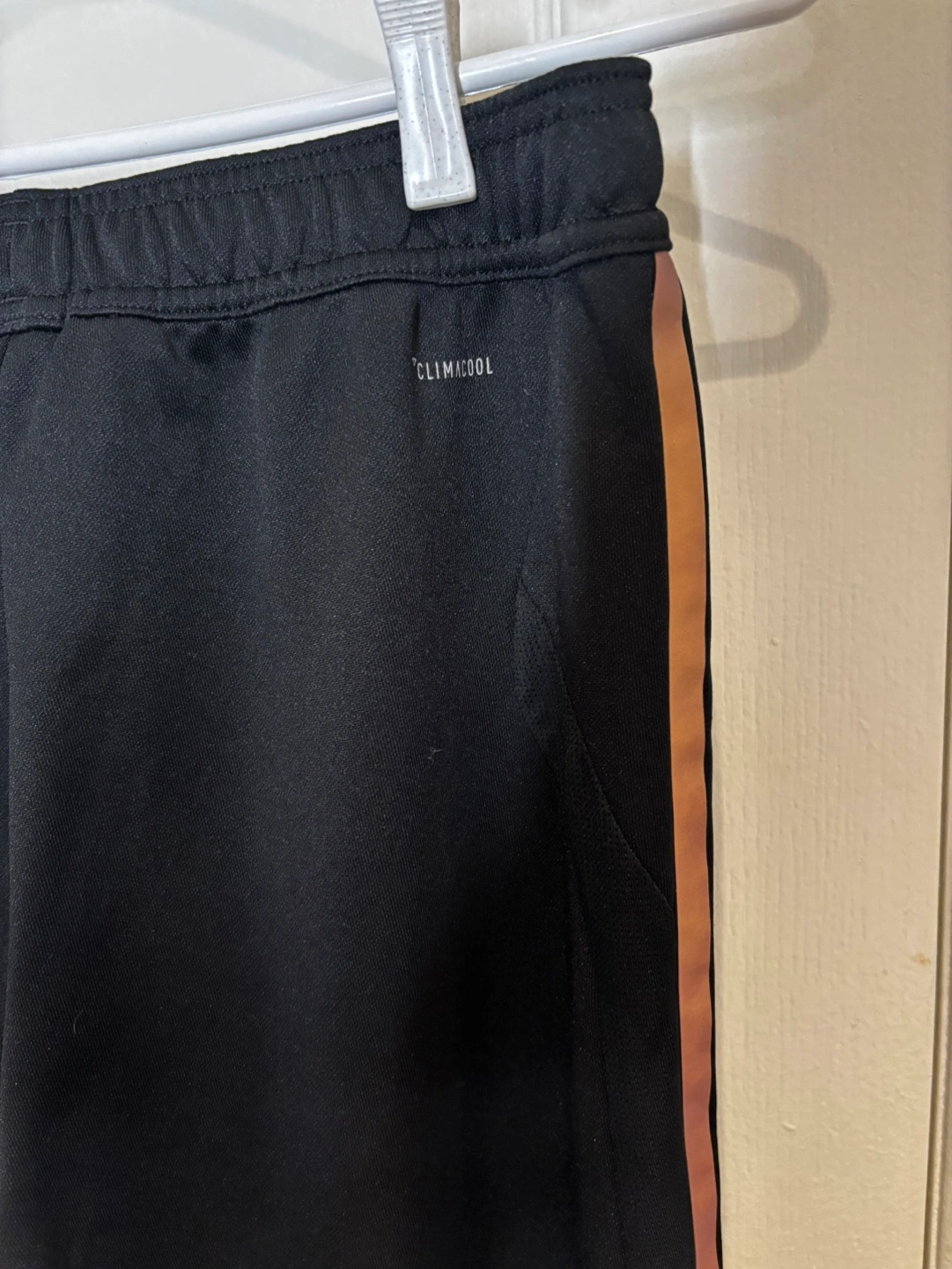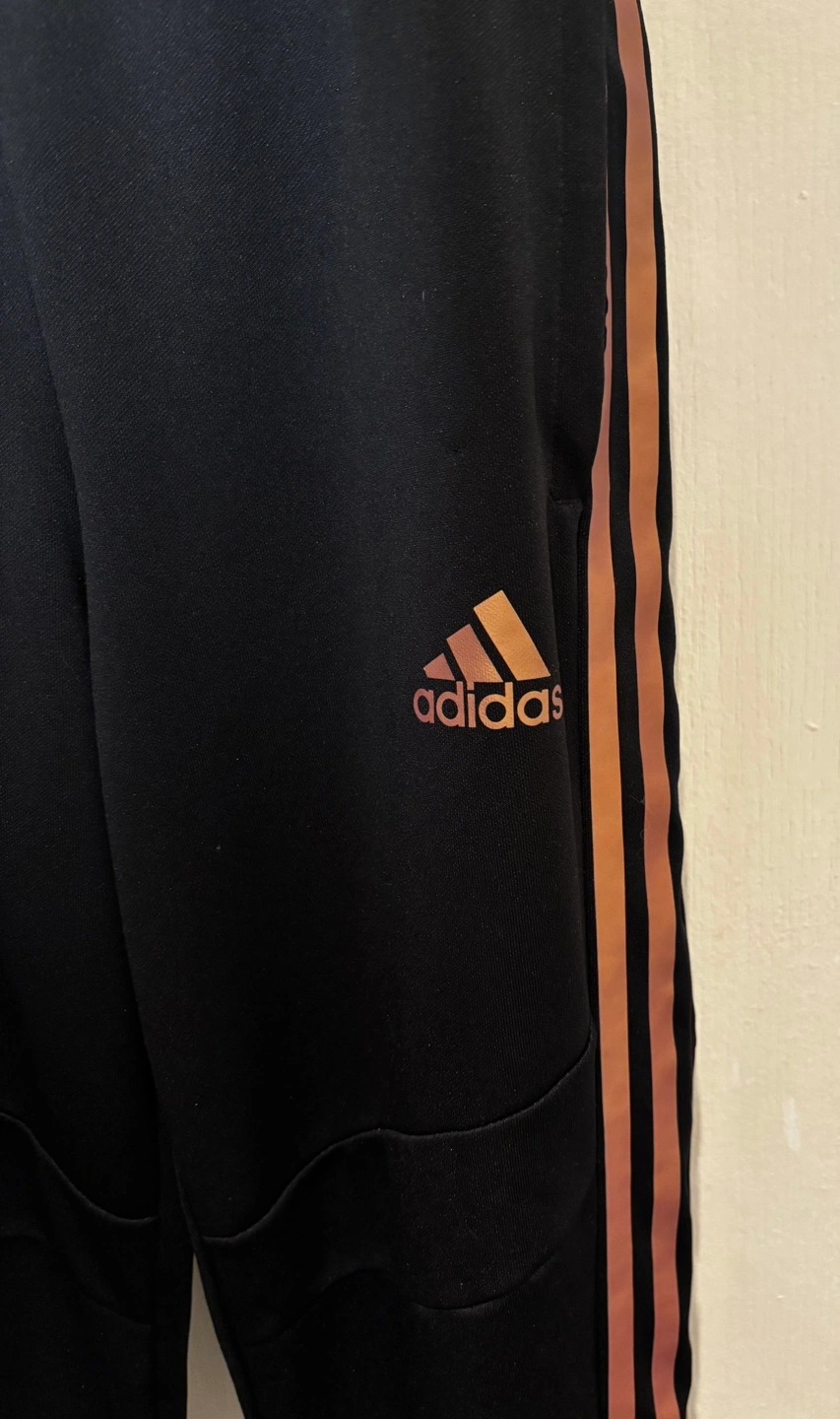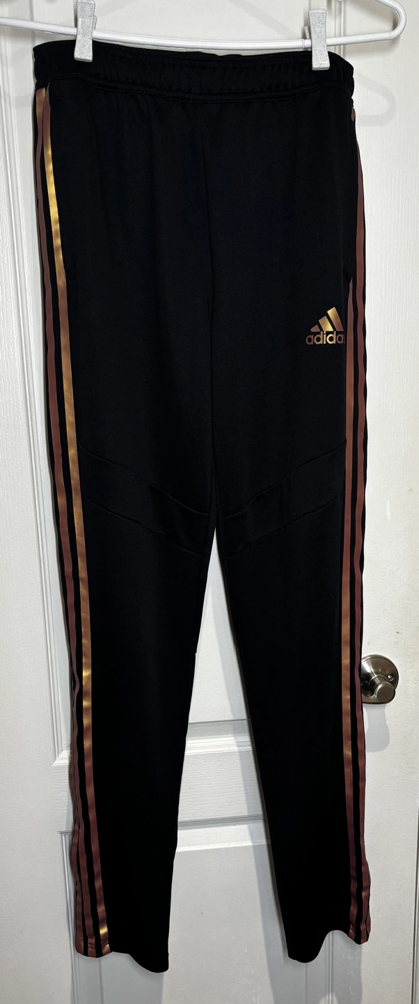 Adidas Climalite track pants. Black with rose gold stripes. Excellent condition. Size not shown. Pickup in Richmond Hill We sell vintage/used pieces. As a buyer of vintage or used objects you should assume a baseline of mild wear. If you expect normal minor wear you will be happy with your purchase.