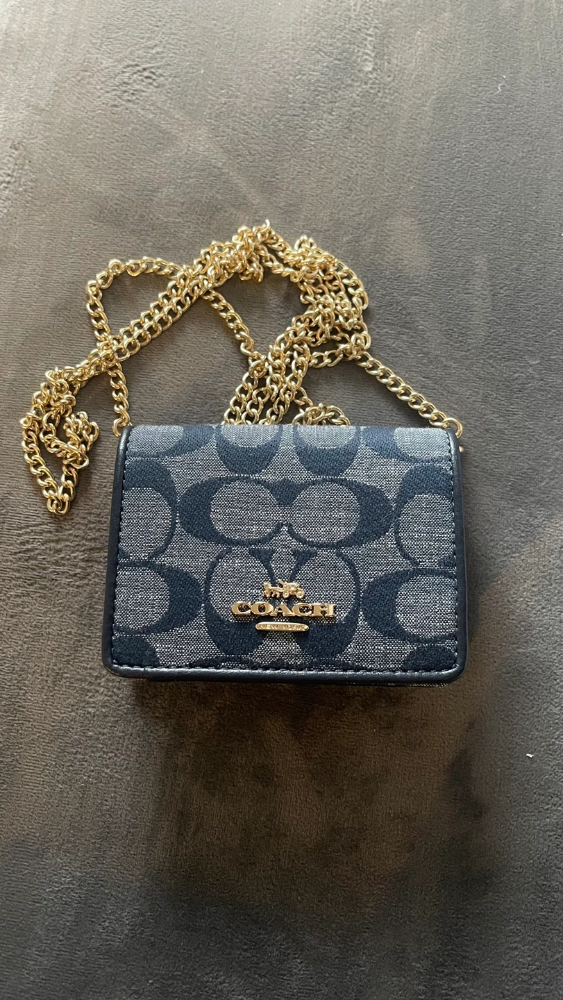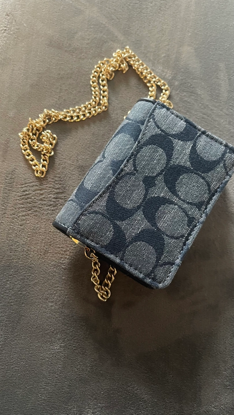 Small Coach wallet. Denim signature. Gold chain strap. Perfect for cards and minimal essentials.