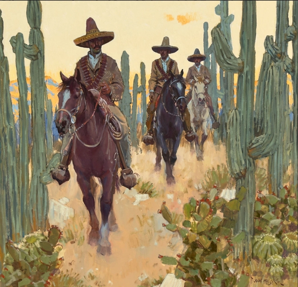 Oil on canvas painting. Depicts three men on horseback riding through a desert landscape. Features cacti and a sunset. Signed by the artist.