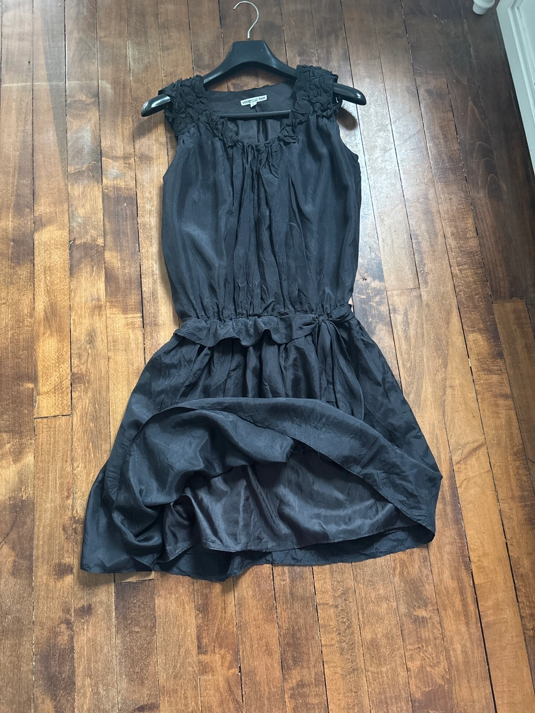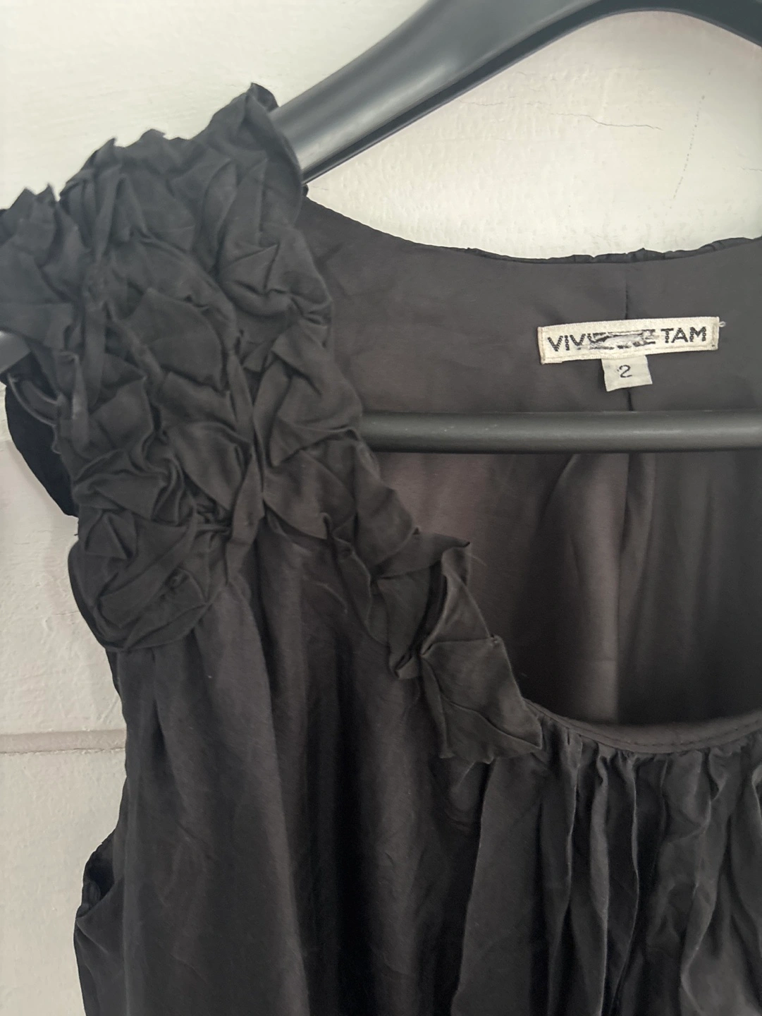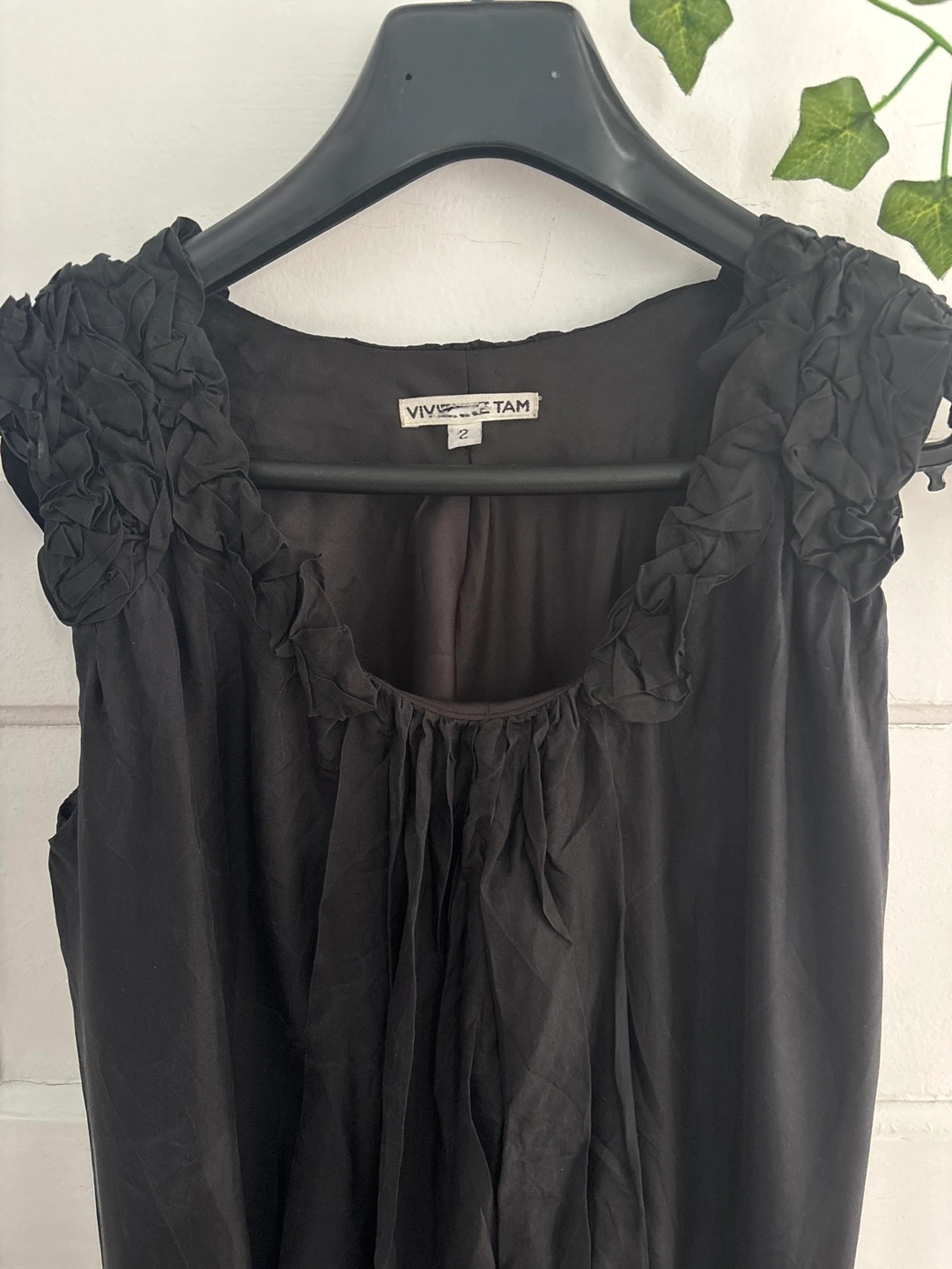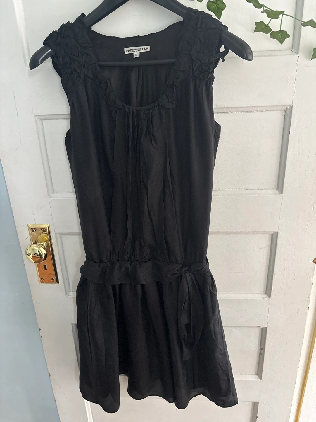 Black silk sleeveless dress. Size 2. Floral detail on shoulders. Cinched waist. Flowy skirt. From top to bottom 28” From armpit to armpit 19”