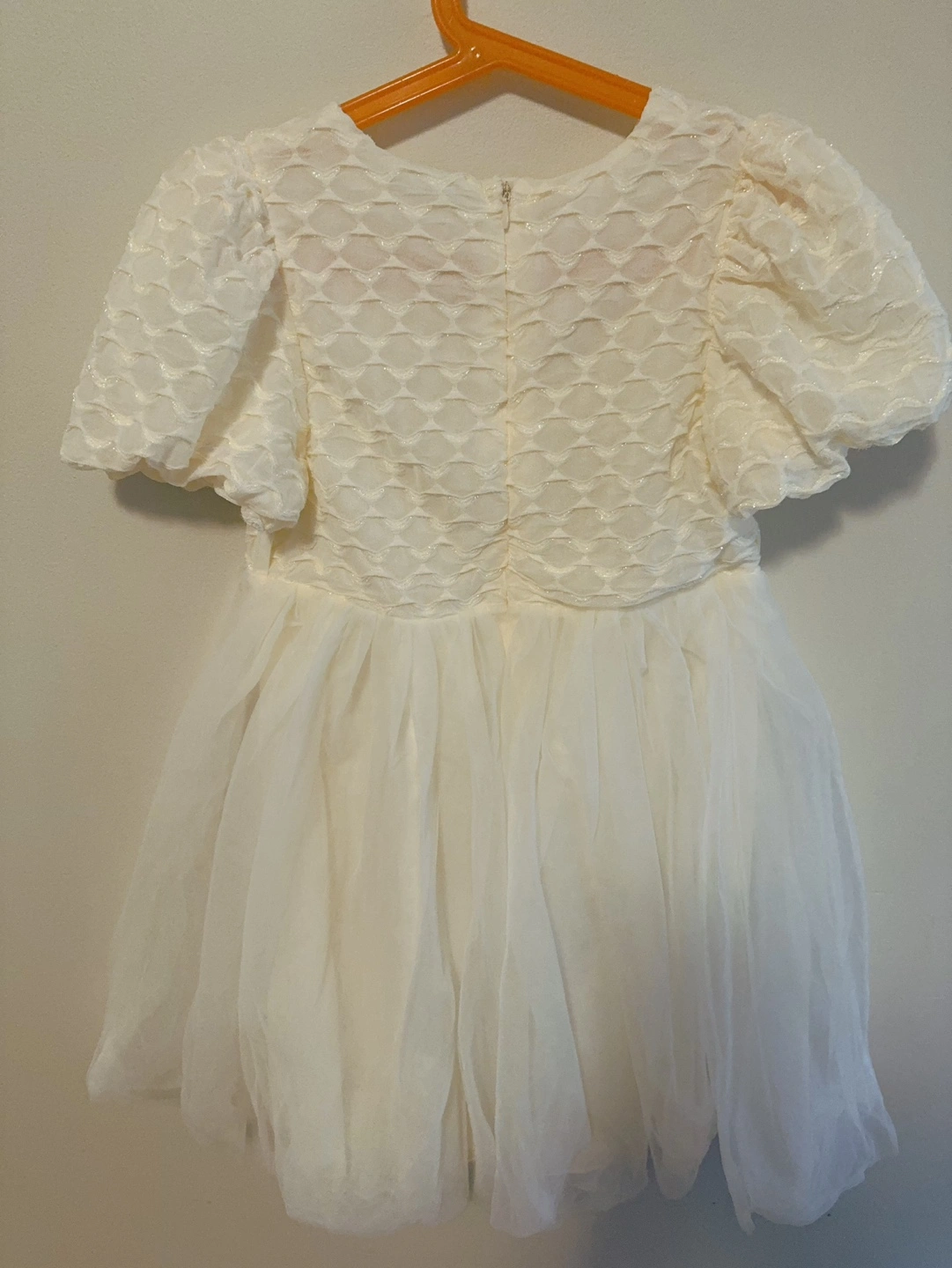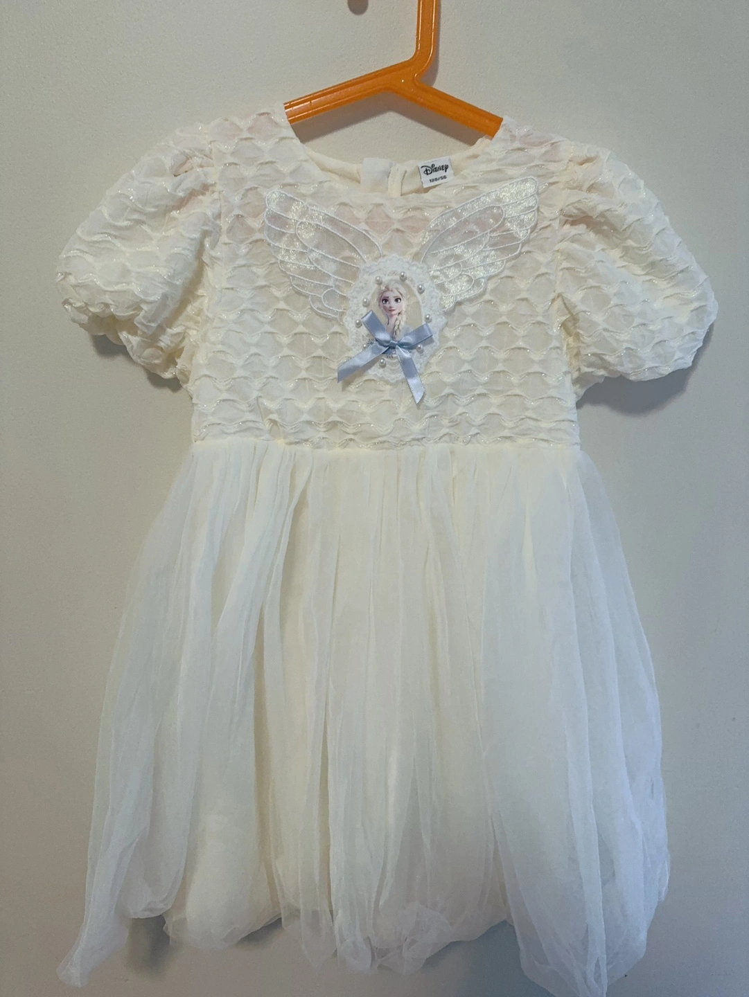 Adorable off-white Frozen Elsa dress. Features puff sleeves, tulle skirt, and Elsa appliqué.