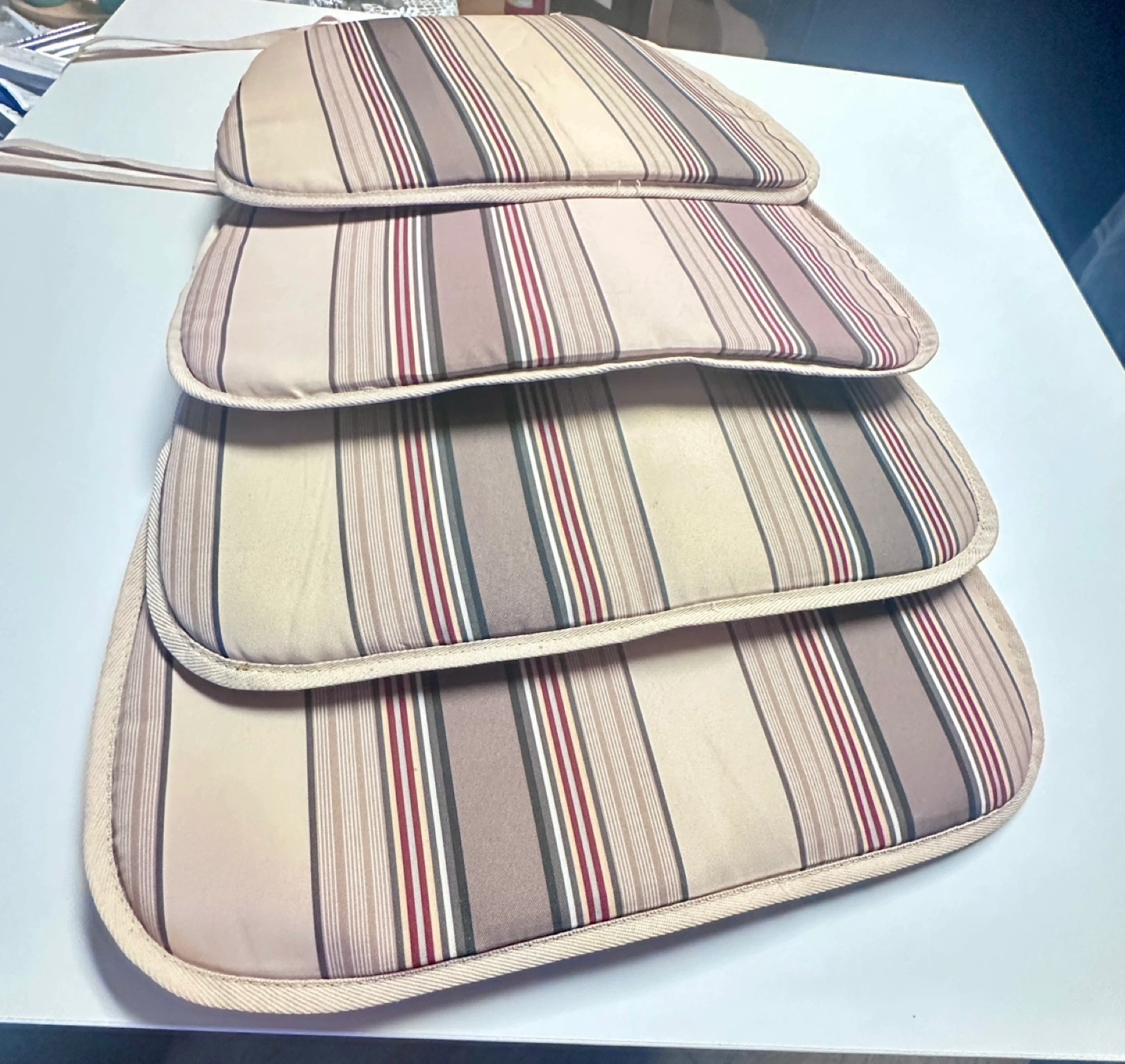 4 beige, brown, and red striped chair/ cushions. Each cushion has ties to use indoor/outdoor Firm price Pick up only Not delivering Cash and carry
